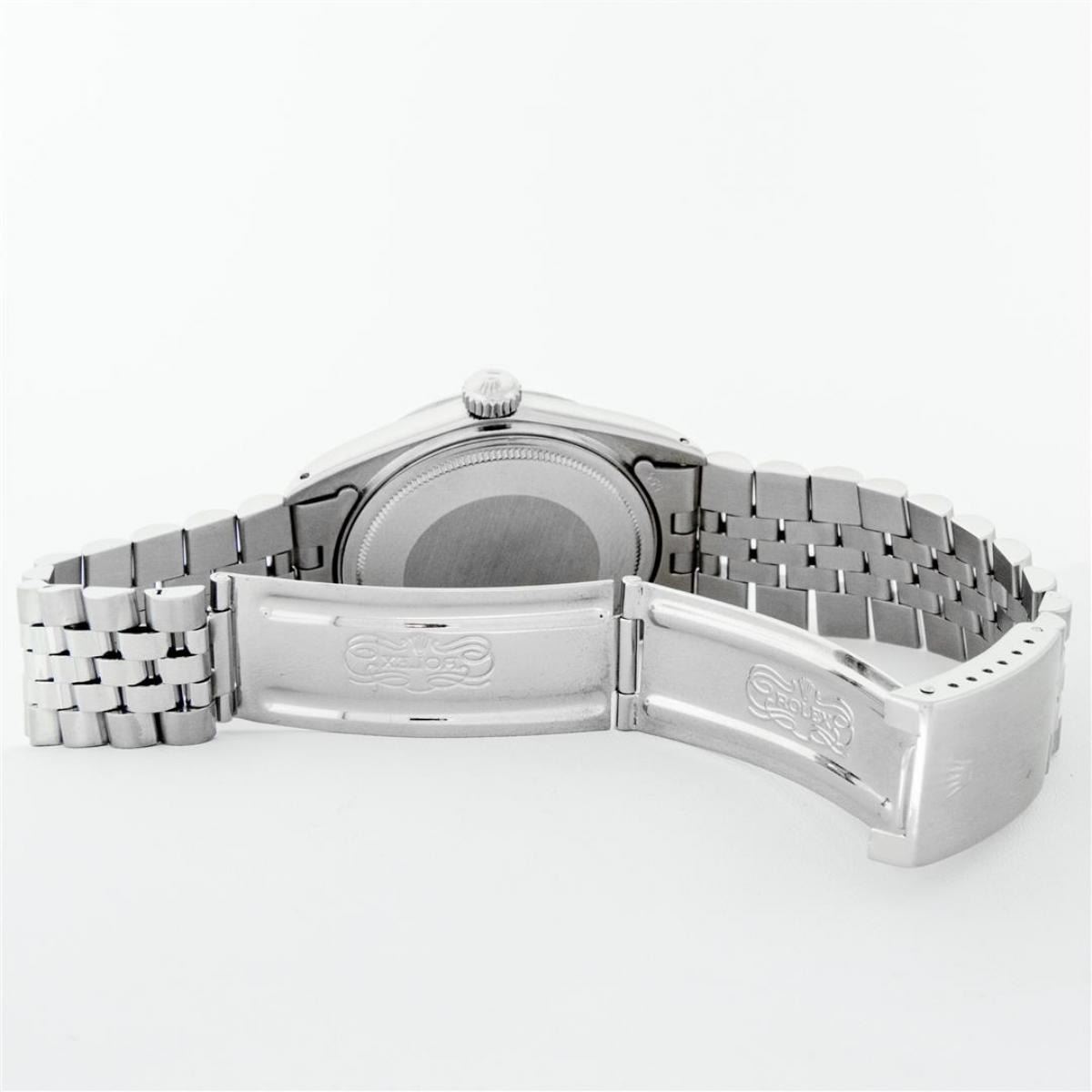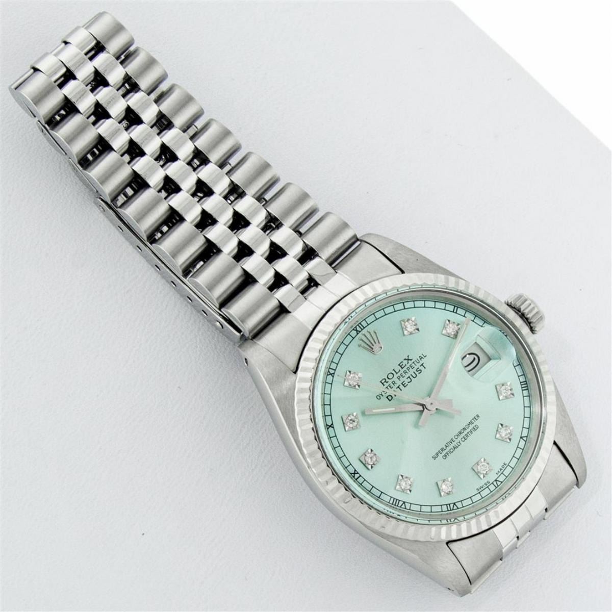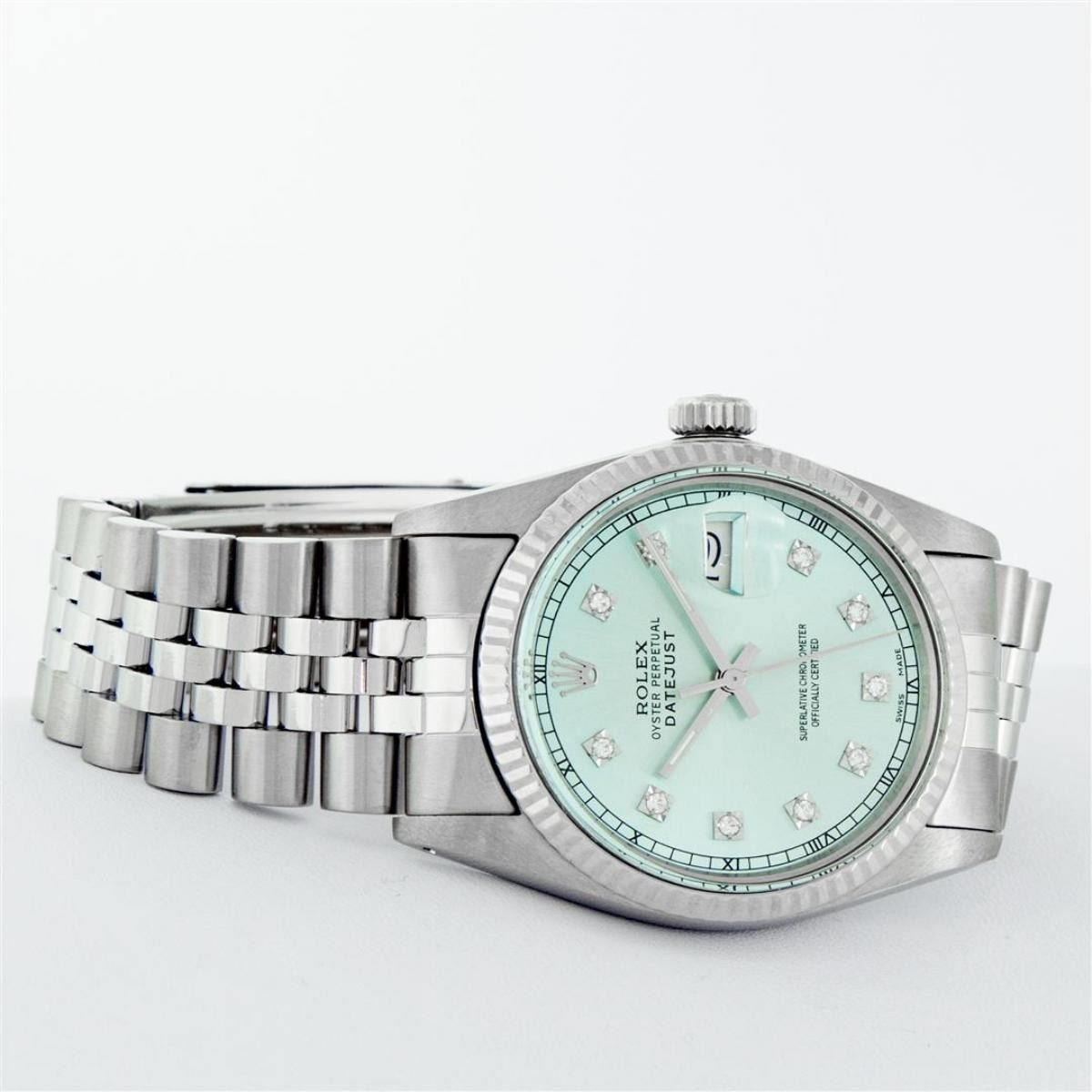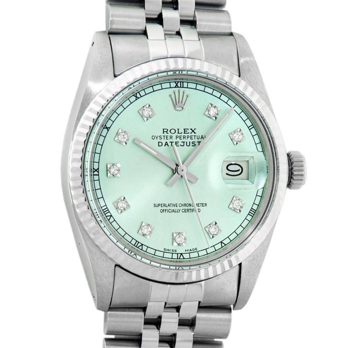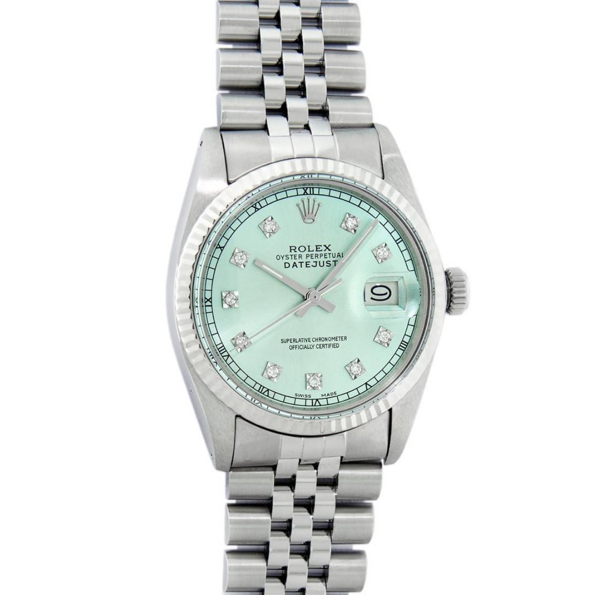 One Mens Stainless Steel Rolex Datejust Polished Bright with Satin Finish, This Watch Has Been Serviced & Electronically Tested, Stainless Steel Case: 36mm, Stainless Steel Crown, Bezel: 14K White Gold Fluted Bezel. Custom Crystal: New Acrylic Cyclops Lens. Custom Hands: New Luminescent Hands. Movement: Automatic Winding Movement. Custom Dial: Ice Blue Dial With Diamond Hour Markers and Roman Track, 10 Diamonds On Dial G To H In Color, SI-VS Clarity. Date Window: 3 O'Clock Position Date Display, Quickset, Model: Datejust, Condition: G-6 Extra Fine. Bracelet:Stainless Steel Jubilee. Bright Polish & Satin Finish. 7.0 Inch Length, Adjustable. Standard Clasp, With Rolex Logo. This Watch Has Been Serviced Time Tested And Is In Excellent Condition It Is Free Of All Scratches And Dents.