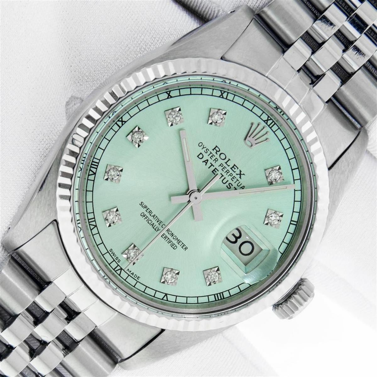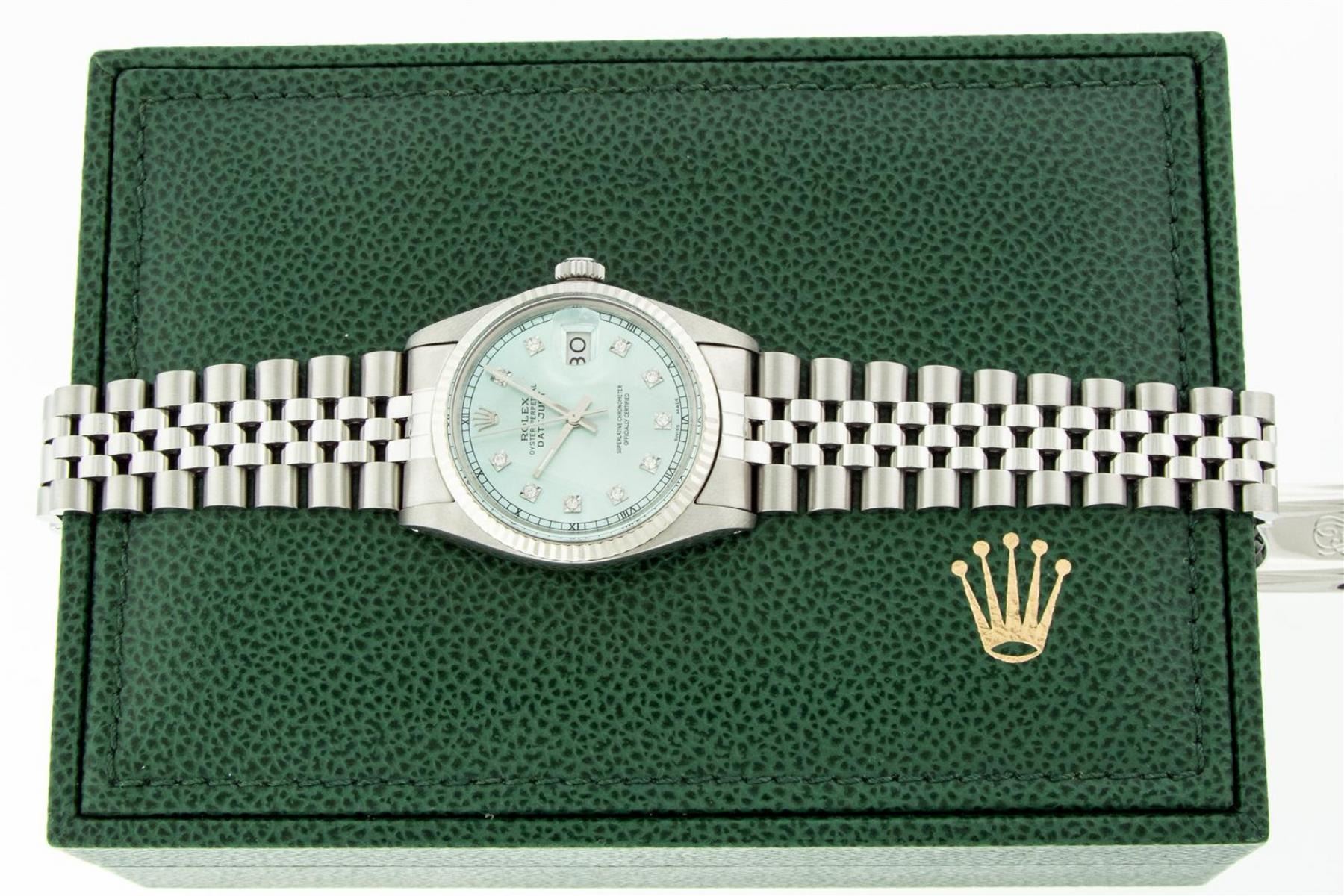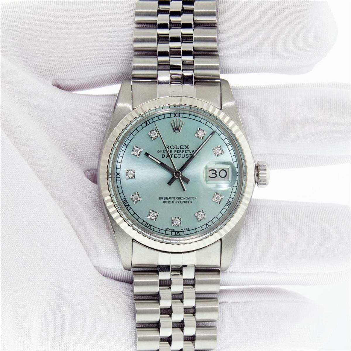 One Mens Stainless Steel Rolex Datejust Polished Bright with Satin Finish, This Watch Has Been Serviced & Electronically Tested, Stainless Steel Case: 36mm, Stainless Steel Crown, Bezel: 14K White Gold Fluted Bezel. Custom Crystal: New Acrylic Cyclops Len