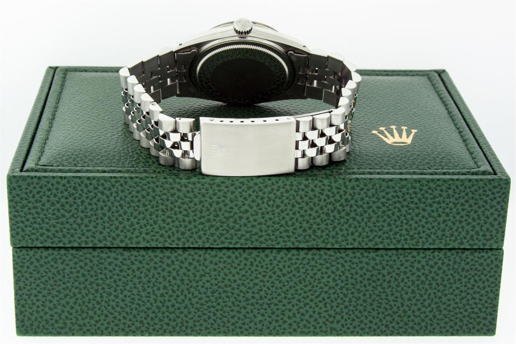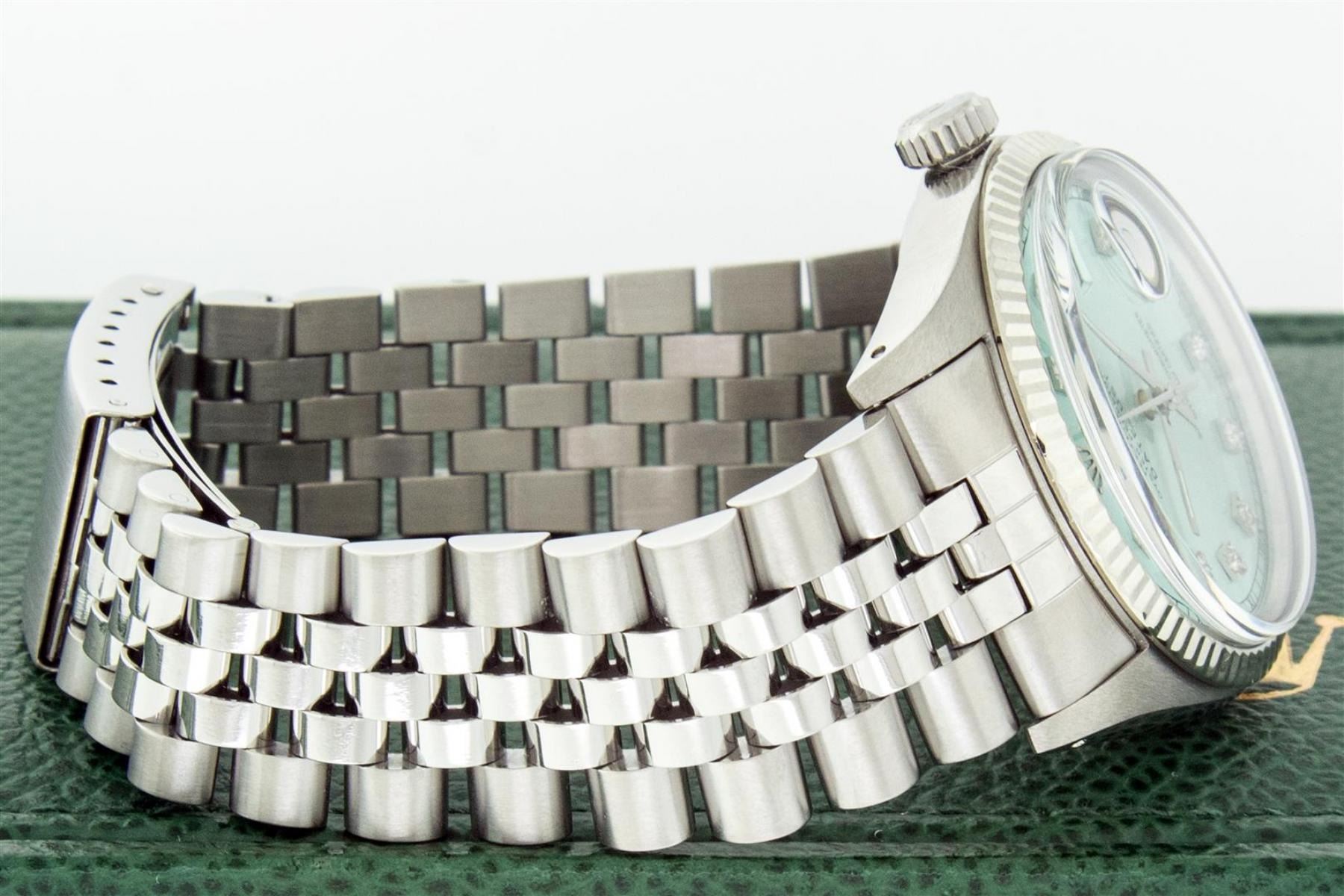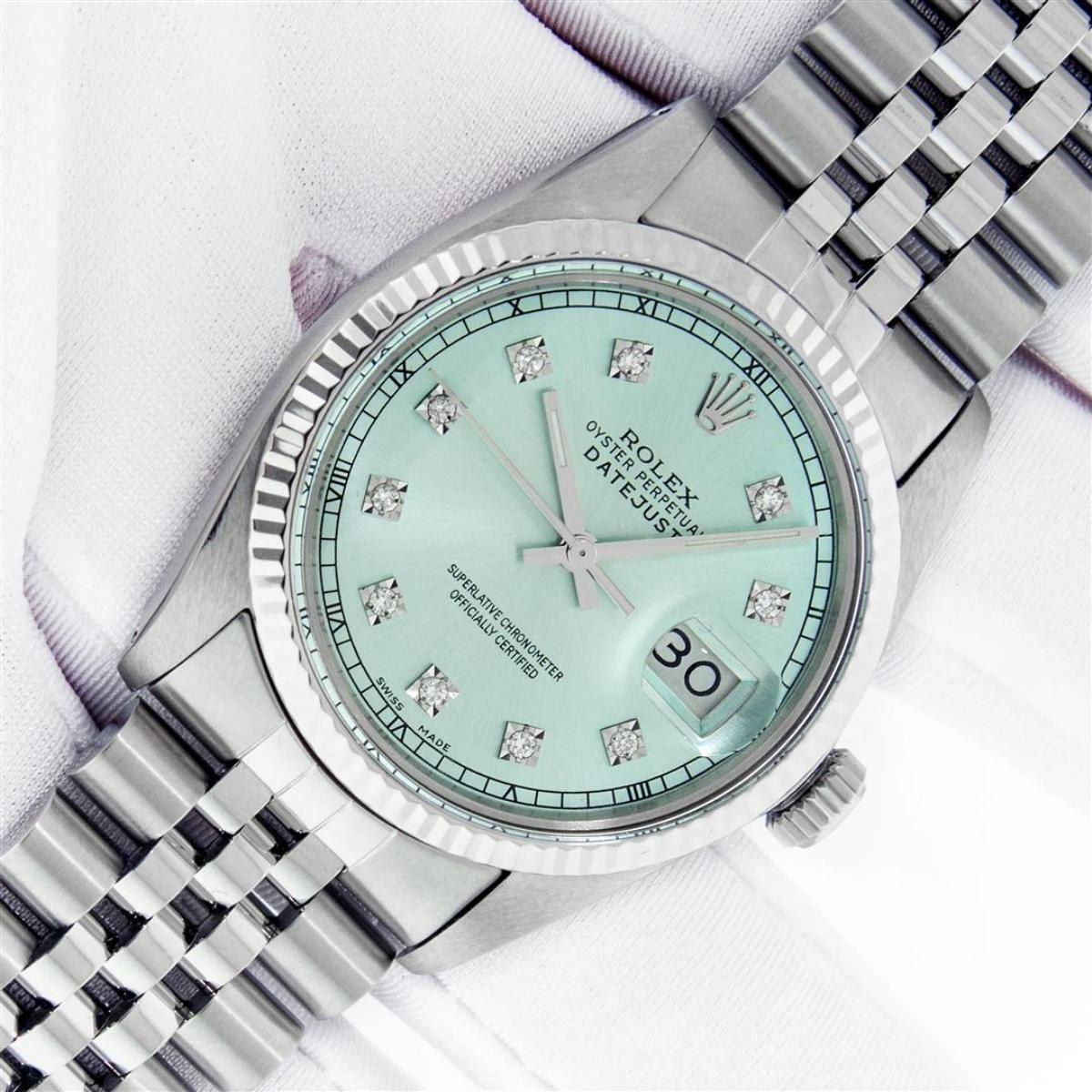 One Mens Stainless Steel Rolex Datejust Polished Bright with Satin Finish, This Watch Has Been Serviced & Electronically Tested, Stainless Steel Case: 36mm, Stainless Steel Crown, Bezel: 14K White Gold Fluted Bezel. Custom Crystal: New Acrylic Cyclops Len