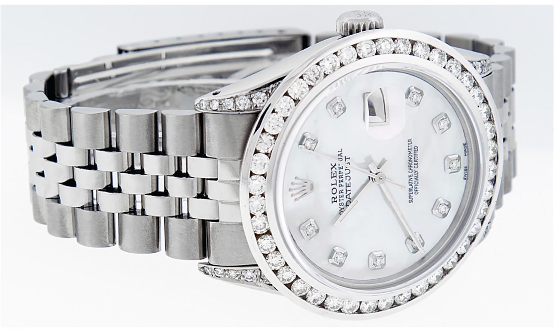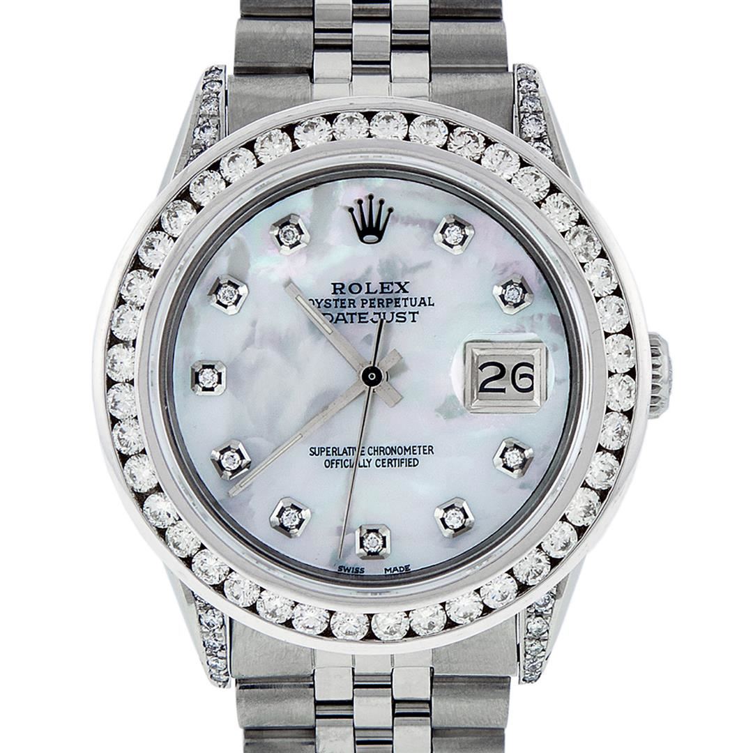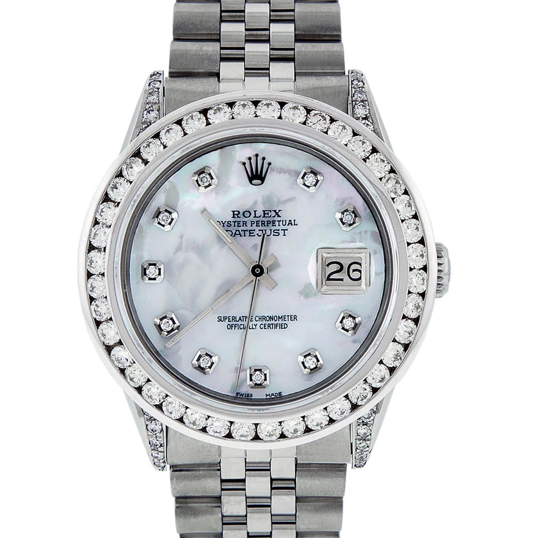 One Mens Stainless Steel Rolex Datejust Polished Bright with Satin Finish, Serviced & Electronically Tested, Stainless Steel Case: 36mm, Diamond Lugs: 24 Diamonds On Lugs, Color: G to H, Clarity: SI-VS. Stainless Steel Crown, New Custom Bezel: 18K White Gold 3.00 Ctw Diamond Bezel, Diamond Count: 40 Diamonds, Total Weight 3.0 Carat, Clarity: SI-VS, Color: G to H. Custom Crystal: New Scratch Resistant Synthetic Sapphire Cyclops Lens. Movement: Automatic Winding Movement Caliber 3035. Custom Dial: Mother Of Pearl Diamond Dial, Diamond Count: 10 Diamonds In Dial. G To H In Color, Clarity: SI-VS. Date Window: 3 O'Clock Position Date Display, Quickset, Model: Quickset Datejust, Condition: G-6 Extra Fine. Bracelet: Stainless Steel Jubilee Band. Bright Polish & Satin Finish. 7.0 Inch Length, Adjustable. Standard Clasp, With Rolex Logo. This Watch Has Been Serviced Time Tested And Is In Excellent Condition It Is Free Of All Scratches And Dents. This Watch Also Comes With A Brand New Wooden Watch Winder.