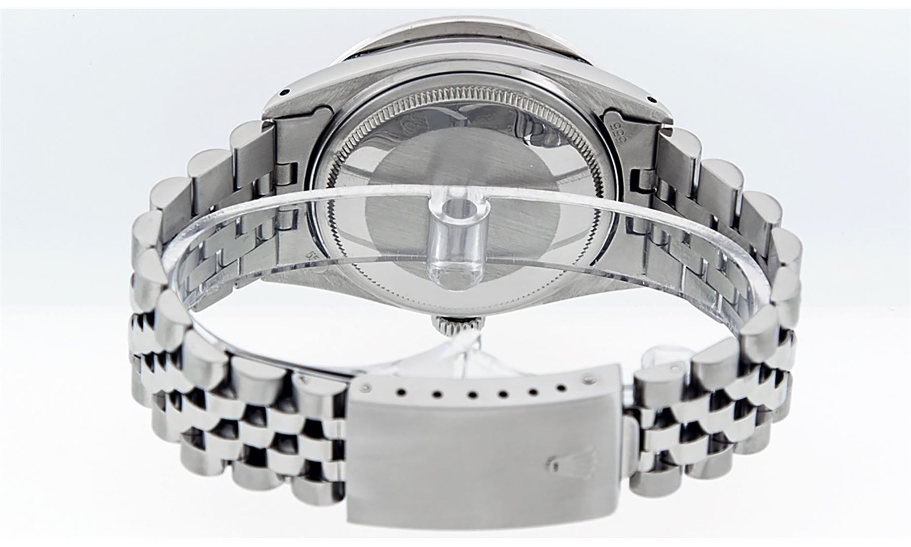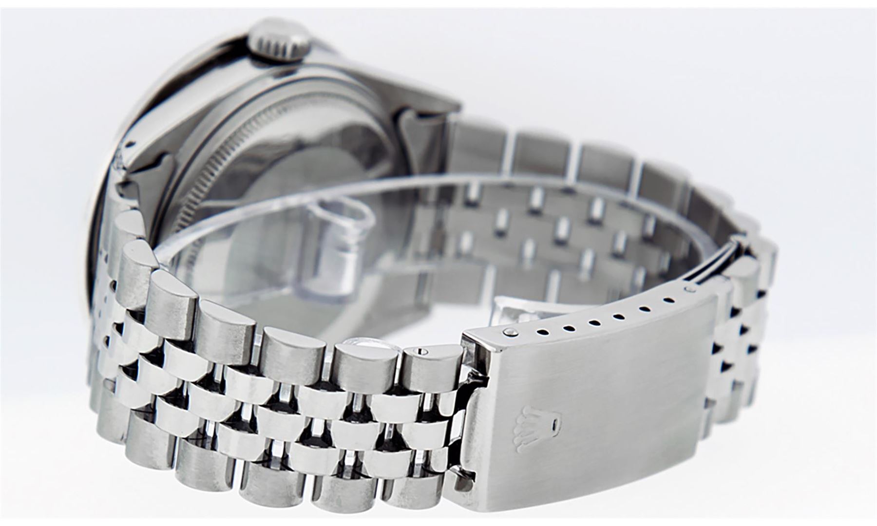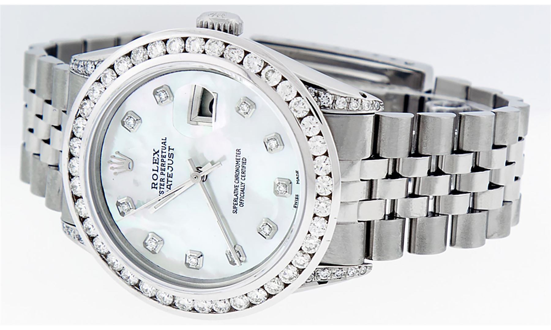 One Mens Stainless Steel Rolex Datejust Polished Bright with Satin Finish, Serviced & Electronically Tested, Stainless Steel Case: 36mm, Diamond Lugs: 24 Diamonds On Lugs, Color: G to H, Clarity: SI-VS. Stainless Steel Crown, New Custom Bezel: 18K White Gold 3.00 Ctw Diamond Bezel, Diamond Count: 40 Diamonds, Total Weight 3.0 Carat, Clarity: SI-VS, Color: G to H. Custom Crystal: New Scratch Resistant Synthetic Sapphire Cyclops Lens. Movement: Automatic Winding Movement Caliber 3035. Custom Dial: Mother Of Pearl Diamond Dial, Diamond Count: 10 Diamonds In Dial. G To H In Color, Clarity: SI-VS. Date Window: 3 O'Clock Position Date Display, Quickset, Model: Quickset Datejust, Condition: G-6 Extra Fine. Bracelet: Stainless Steel Jubilee Band. Bright Polish & Satin Finish. 7.0 Inch Length, Adjustable. Standard Clasp, With Rolex Logo. This Watch Has Been Serviced Time Tested And Is In Excellent Condition It Is Free Of All Scratches And Dents. This Watch Also Comes With A Brand New Wooden Watch Winder.