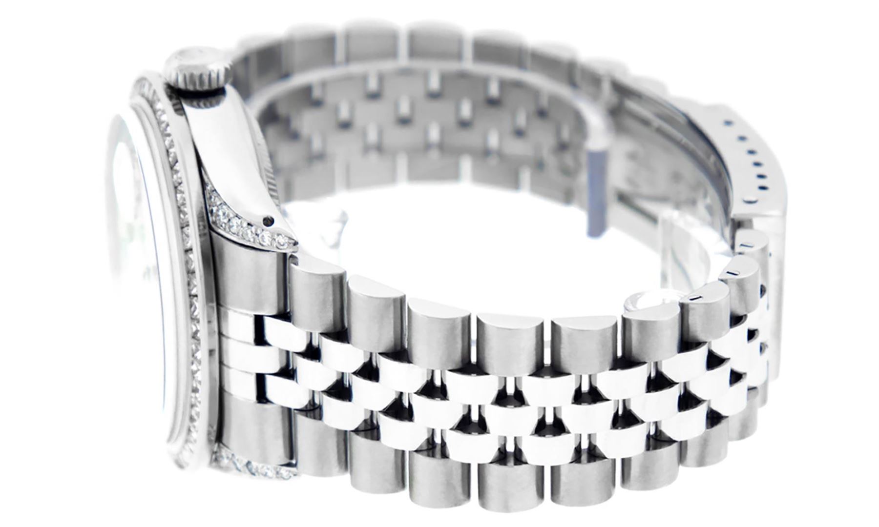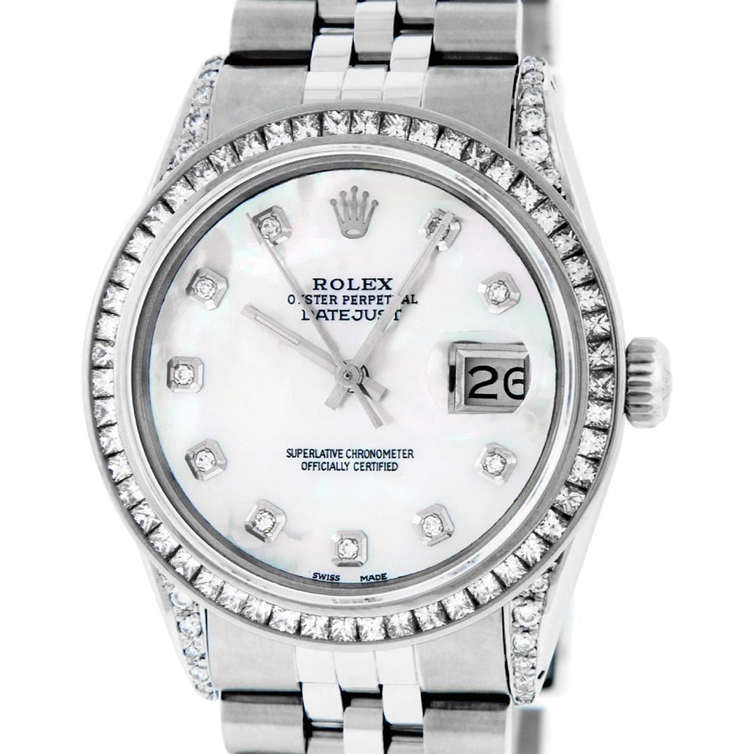 One Mens Rolex Datejust Polished Bright with Satin Finish, Serviced & Electronically Tested, Stainless Steel Case: 36mm, Custom Diamond Lugs: 28 Diamonds In Lugs, Color: G to H, Clarity: SI-VS. Stainless Steel Crown, Custom Bezel: New 14K White Gold Princess Cut Diamond Bezel, Diamond Count: 53 Diamonds, Total Weight 2.75 Carat, Clarity: SI-VS, Color: G to H. Custom Crystal: New Scratch Resistant Synthetic Sapphire Cyclops Lens. Custom Hands: New Luminescent Hands. Movement: Automatic Winding Movement. Custom Dial: Mother Of Pearl Diamond Dial, Diamond Count: 10 Diamonds In Dial, Diamond Color: G To H In Color, Clarity: SI-VS. Date Window: 3 O'Clock Position Date Display, Quickset, Model: Datejust Condition: G-6 Extra Fine. Bracelet: Stainless Steel Jubilee Band. Bright Polish & Satin Finish. 7.0 Inch Length, Adjustable. Standard Clasp, With Rolex Logo. This Watch Has Been Serviced And Polished And Its Free Of All Dents And Scratches.