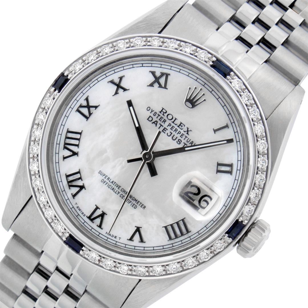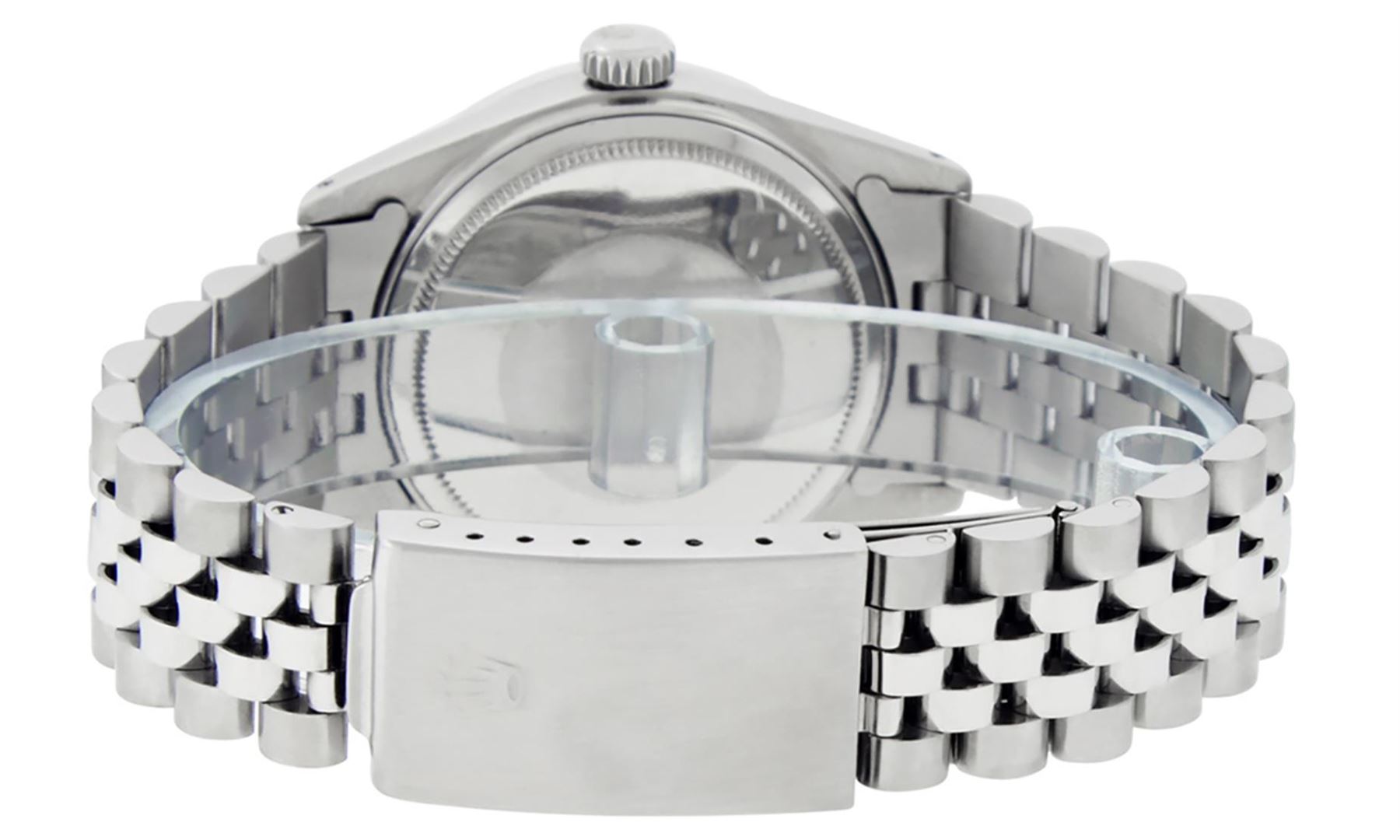 One Mens Stainless Steel Rolex Datejust Polished Bright with Satin Finish, This Watch Has Been Serviced & Electronically Tested, Stainless Steel Case: 36mm, Stainless Steel Crown, Custom Bezel: New 18K White Gold Sapphire Beadset Diamond Bezel, Diamond + Gem Count: 36 Diamonds + 4 Sapphires, Total Weight 1.00 Carat, Clarity: SI-VS, Color: G to H. Custom Crystal: New Synthetic Sapphire Cyclops Lens. Custom Hands: New Luminescent Hands. Movement: Automatic Winding Movement. Custom Dial: Mother Of Pearl With Roman Track. Date Window: 3 O'Clock Position Date Display, Quickset, Model: Datejust, Condition: G-6 Extra Fine. Bracelet: Stainless Steel Jubilee. Bracelet: 7.0 Inch Length, Adjustable. Standard Clasp, With Rolex Logo. This Watch Has Been Serviced Time Tested And Is In Excellent Condition It Is Free Of All Scratches And Dents.