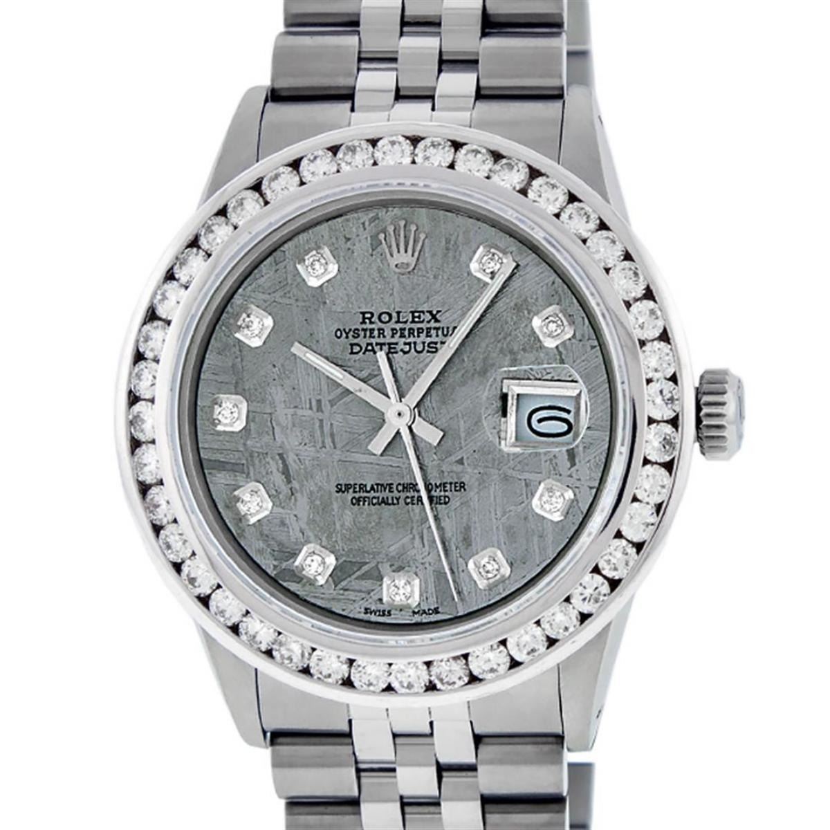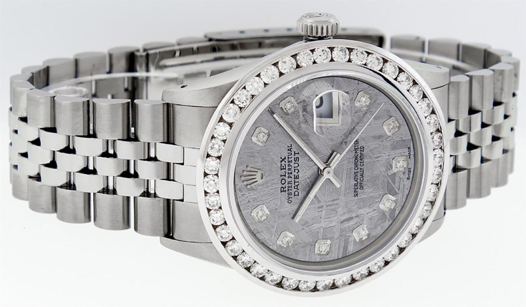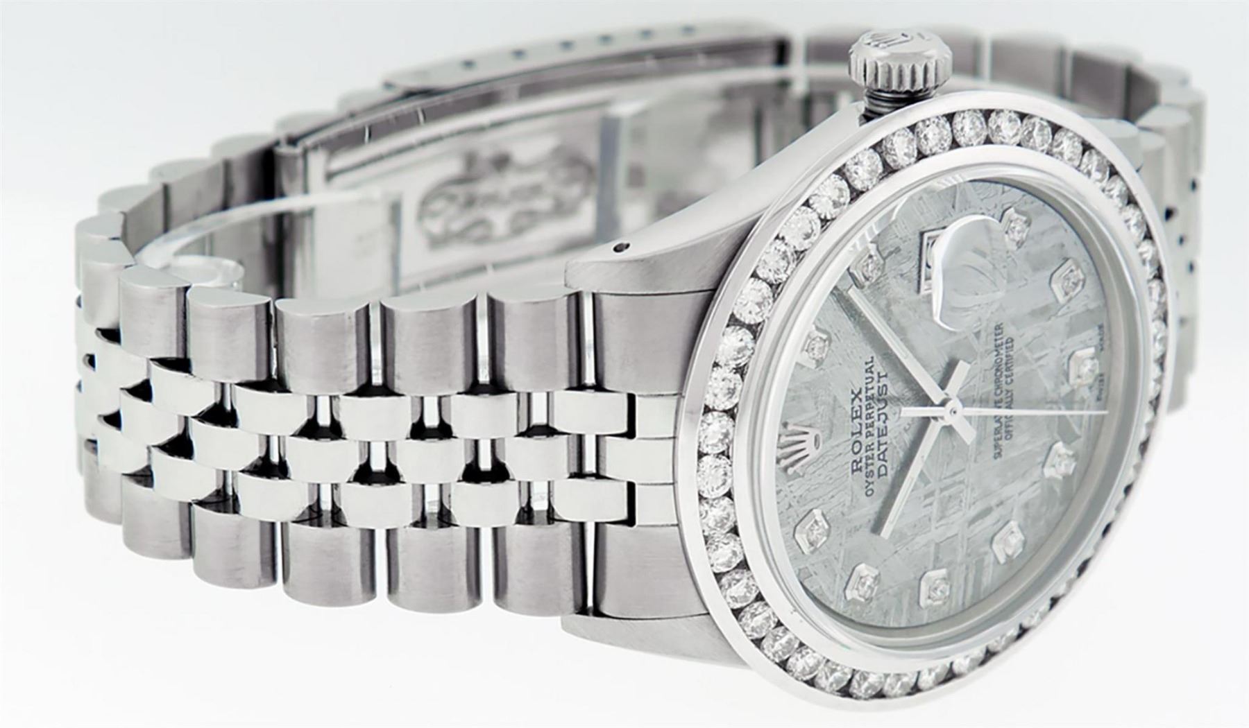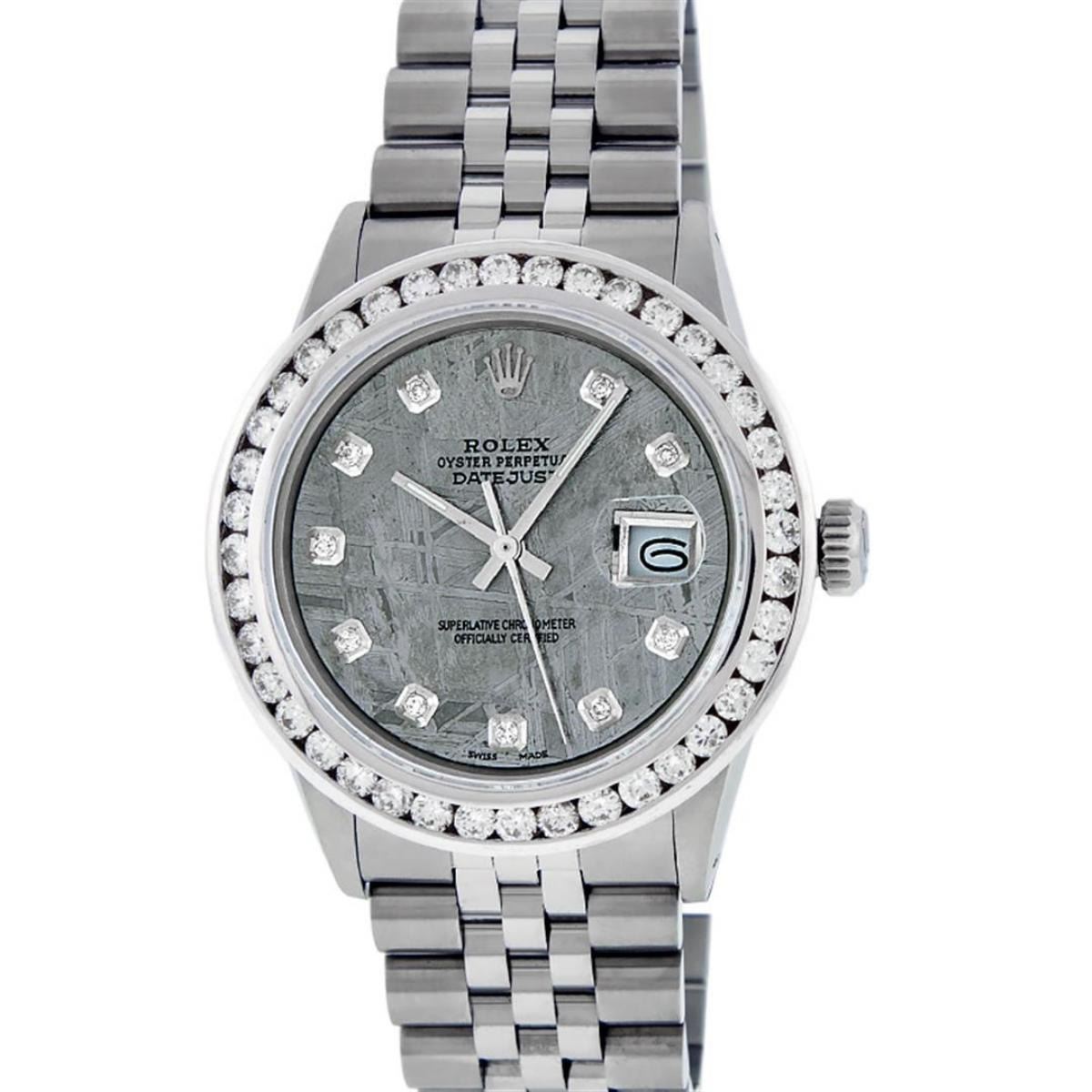 One Mens Stainless Steel Rolex Datejust Polished Bright with Satin Finish, Fully Serviced & Electronically Tested, Stainless Steel Case:36mm, Stainless Steel Crown, Custom Bezel: New 18K White Gold 3.00 Ctw Channel Set Diamond Bezel, Diamond Count: 40 Diamonds On Bezel, Total Weight 3.0 Carat, Clarity: SI-VS, Color: G to H. Custom Crystal: New Scratch Resistant Synthetic Sapphire Cyclops Lens. Custom Hands: New Luminecent Hands. Movement: Automatic Winding Movement Caliber 3035. Custom Refinshed Dial: Meteorite Diamond Dial, 10 Diamonds in Dial, G To H In Color, Clarity: SI-VS. Date Window: 3 O'Clock Position Date Display, Quickset, Model: Datejust 36mm, Condition: G-6 Extra Fine. Bracelet: Rolex Stainless Steel Jubilee Band. Bright Polish & Satin Finish. 7.0 Inch Length, Adjustable. Standard Clasp, With Rolex Logo. Watch Has Been Serviced And Polished It Is Free Of All Scratches And Dents. This Watch Comes With A Rolex Box & Watch Winder.