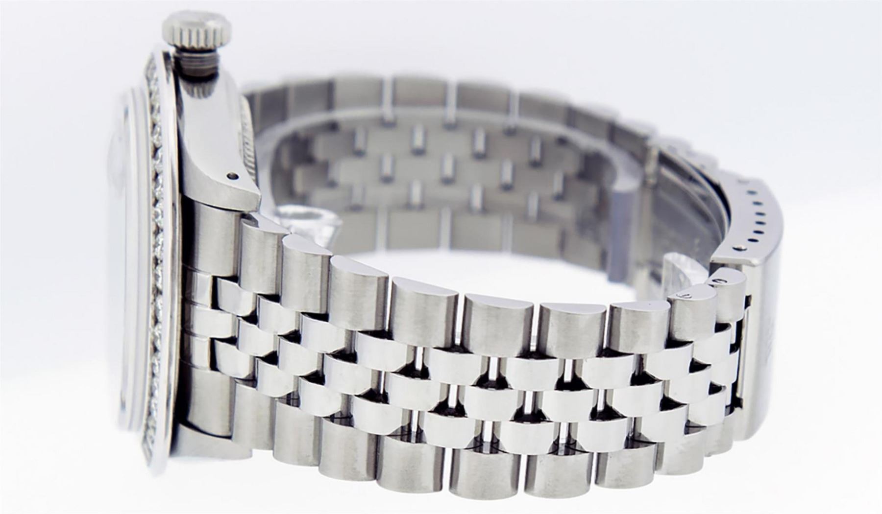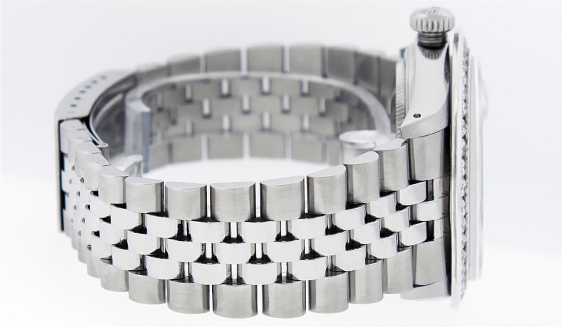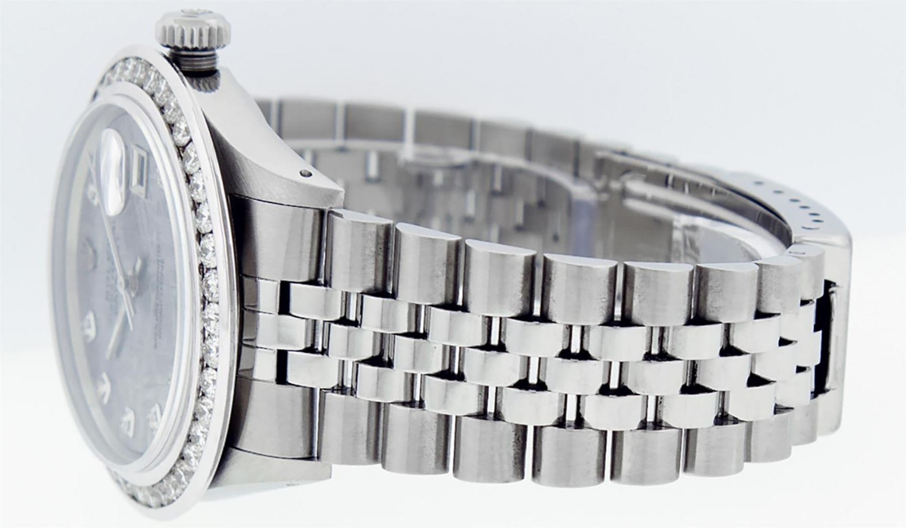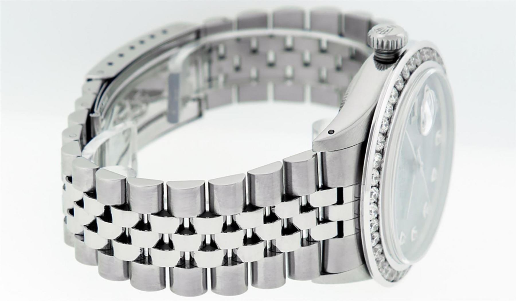 One Mens Stainless Steel Rolex Datejust Polished Bright with Satin Finish, Fully Serviced & Electronically Tested, Stainless Steel Case:36mm, Stainless Steel Crown, Custom Bezel: New 18K White Gold 3.00 Ctw Channel Set Diamond Bezel, Diamond Count: 40 Diamonds On Bezel, Total Weight 3.0 Carat, Clarity: SI-VS, Color: G to H. Custom Crystal: New Scratch Resistant Synthetic Sapphire Cyclops Lens. Custom Hands: New Luminecent Hands. Movement: Automatic Winding Movement Caliber 3035. Custom Refinshed Dial: Meteorite Diamond Dial, 10 Diamonds in Dial, G To H In Color, Clarity: SI-VS. Date Window: 3 O'Clock Position Date Display, Quickset, Model: Datejust 36mm, Condition: G-6 Extra Fine. Bracelet: Rolex Stainless Steel Jubilee Band. Bright Polish & Satin Finish. 7.0 Inch Length, Adjustable. Standard Clasp, With Rolex Logo. Watch Has Been Serviced And Polished It Is Free Of All Scratches And Dents. This Watch Comes With A Rolex Box & Watch Winder.