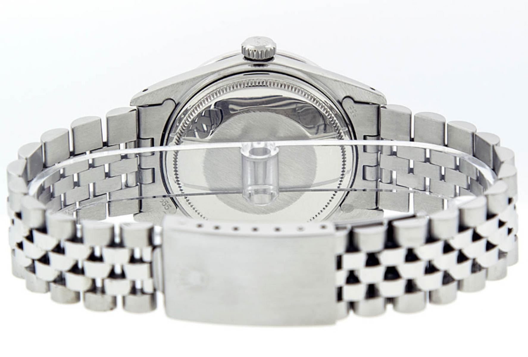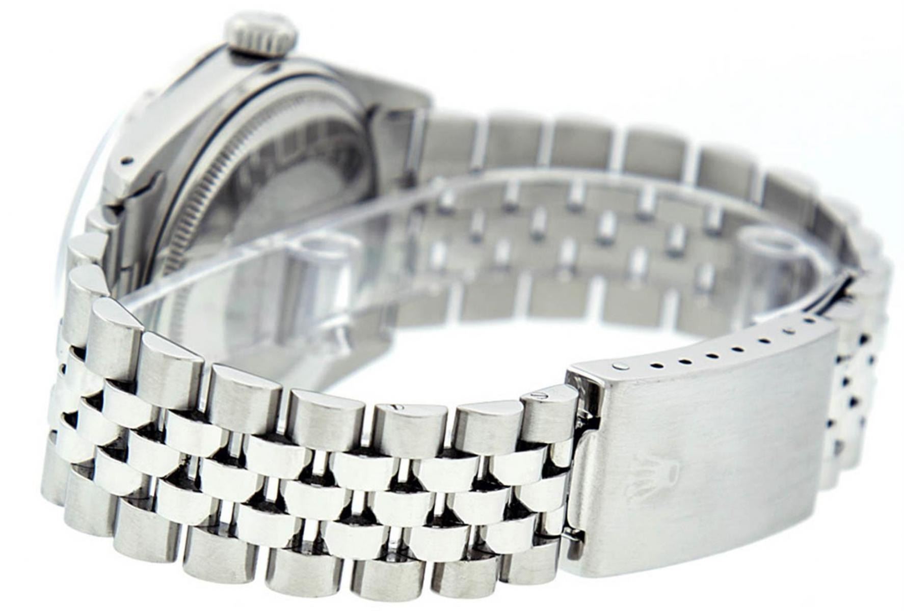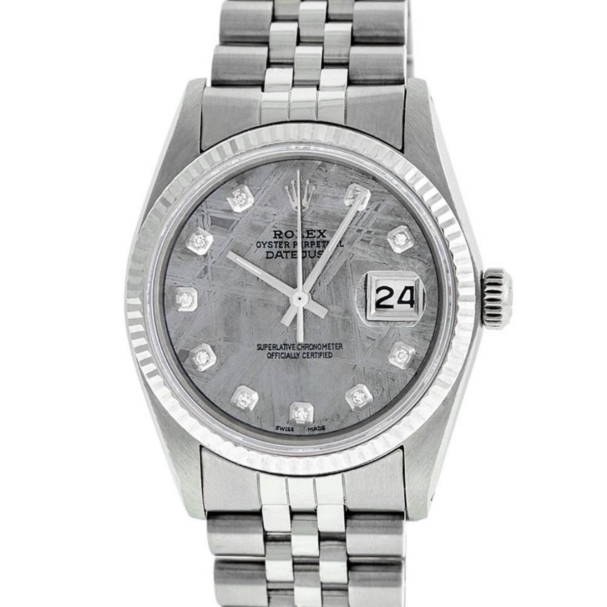 One Mens Stainless Steel Rolex Datejust Polished Bright with Satin Finish, This Watch Has Been Serviced & Electronically Tested, Stainless Steel Case: 36mm, Stainless Steel Crown, Original Bezel: 14K White Gold Fluted Bezel. Custom Crystal: New Acrylic Cyclops Lens. Custom Hands: New Luminescent Hands. Movement: Automatic Winding Movement Caliber 3035. Custom Dial: Meteorite Diamond Dial With Diamond Hour Markers, Diamond Count: 10 Diamonds in Dial, G To H In Color, SI-VS Clarity. Date Window: 3 O'Clock Position Date Display, Quickset, Model: Datejust, Condition: G-6 Extra Fine. Bracelet:Stainless Steel Jubilee. Bright Polish & Satin Finish. 7.0 Inch Length, Adjustable. Standard Clasp, With Rolex Logo. This Watch Has Been Serviced Time Tested And Is In Excellent Condition It Is Free Of All Scratches And Dents