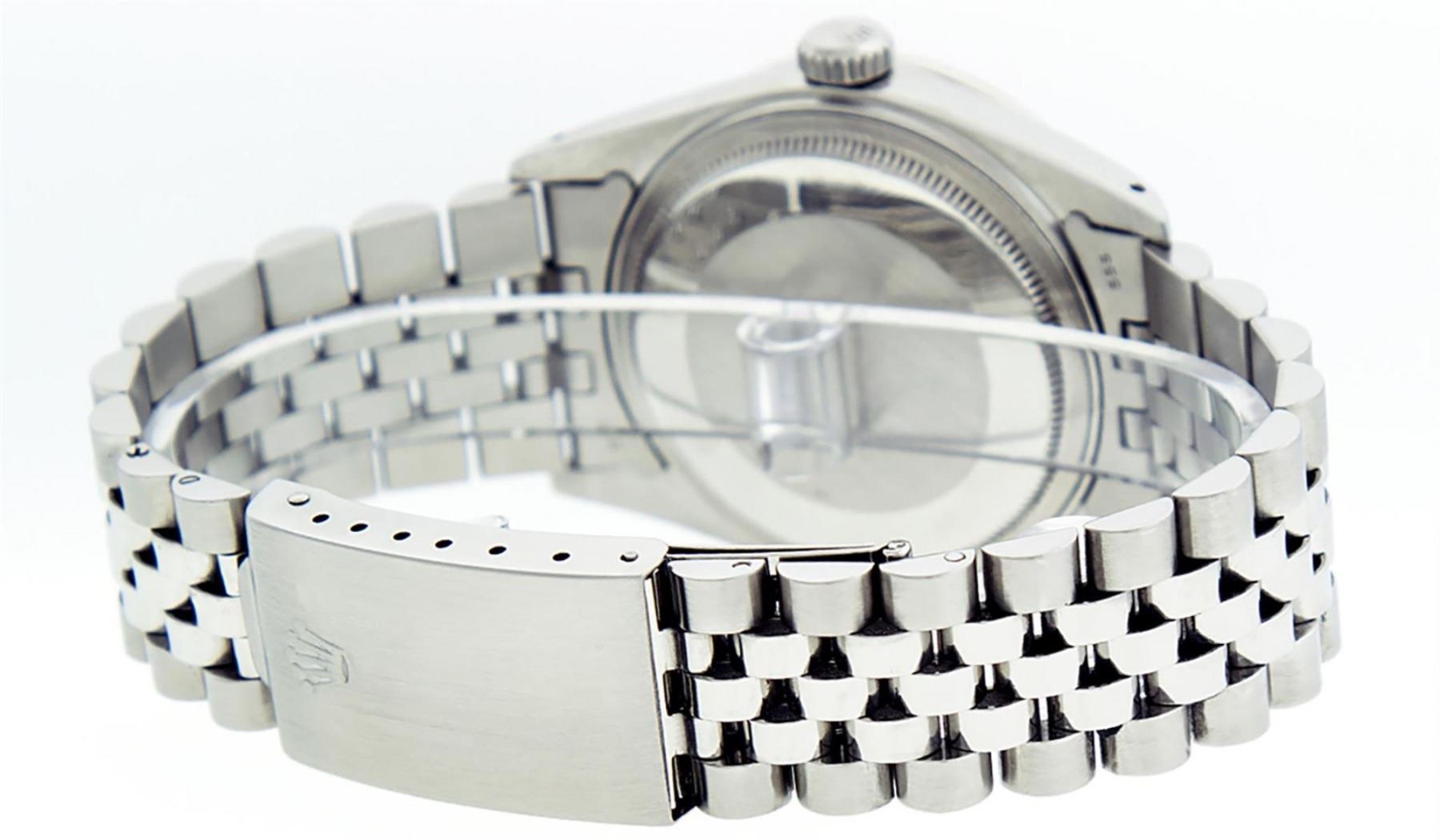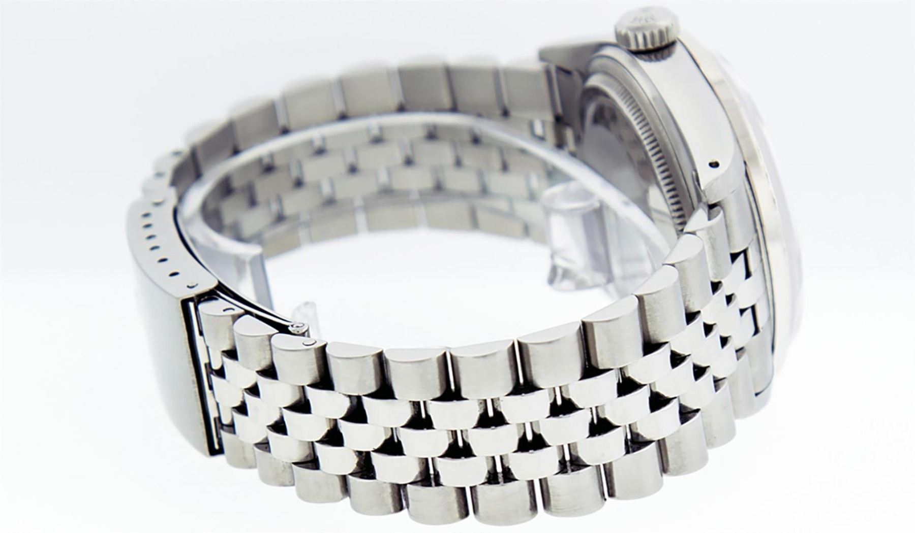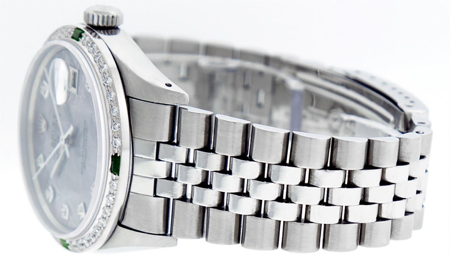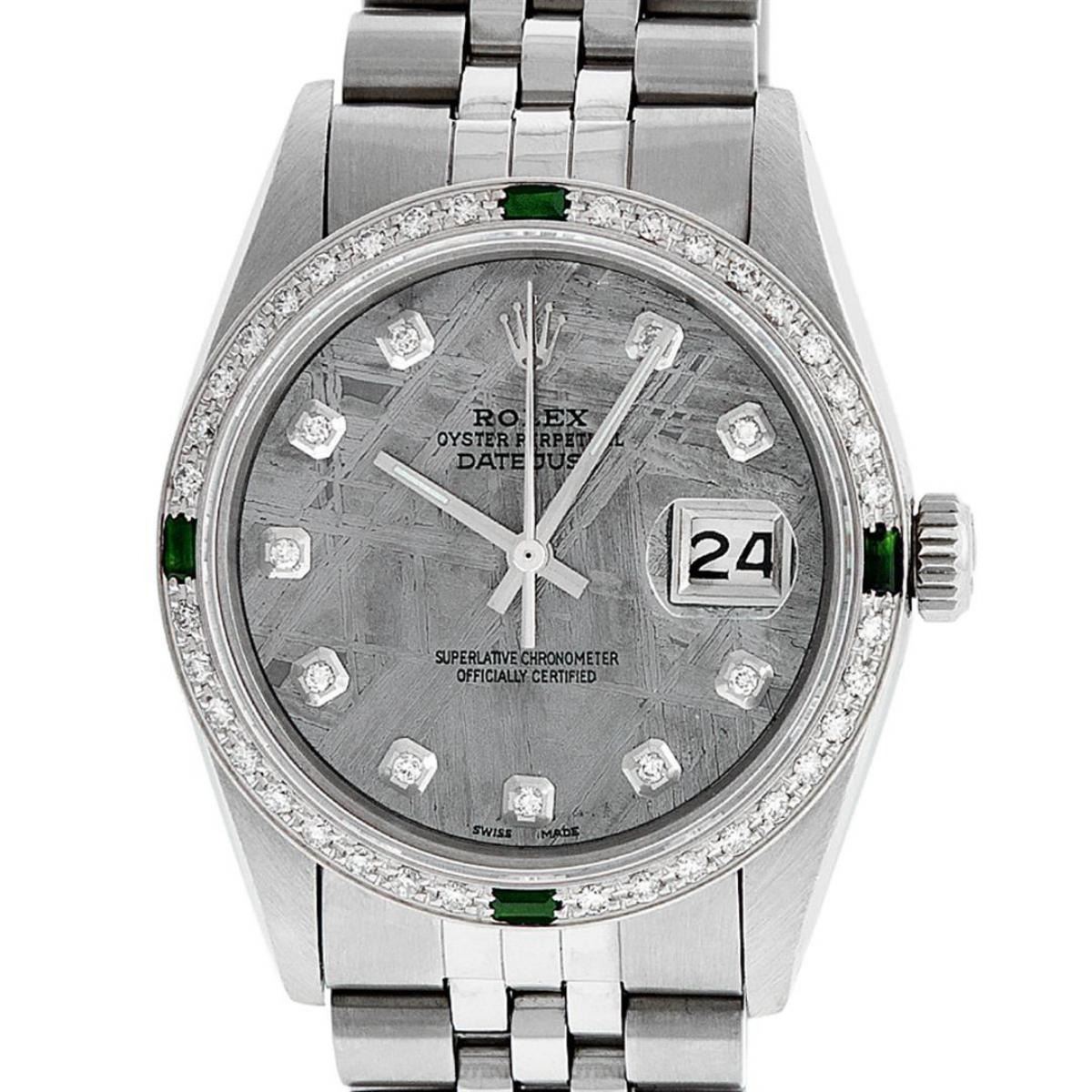 One Mens Stainless Steel Rolex Datejust Polished, Serviced & Electronically Tested, Stainless Steel Case: 36mm, Stainless Steel Crown, Custom Bezel: New 18K White Gold Emerald Beadset Diamond Bezel, Diamond + Gem Count: 36 Diamonds + 4 Emeralds, Total Weight 1.00 Carat, Clarity: SI-VS, Color: G to H. Custom Crystal: New Scratch Resistant Synthetic Sapphire Cyclops Lens. Custom Hands: New Luminescent Hands. Movement: Automatic Winding Movement Caliber 3035. Custom Dial: Meteorite With Diamond Hour Markers, 10 Diamonds In Dial, G To H In Color, Clarity: SI-VS. Date Window: 3 O'Clock Position Date Display, Quickset, Model: Datejust. Condition: G-6 Extra Fine. Bracelet: Stainless Steel Jubilee. Bright Polish & Satin Finish. 7.0 Inch Length, Adjustable. Standard Clasp, With Rolex Logo. This Watch Has Been Serviced Time Tested And Is In Excellent Condition It Is Free Of All Scratches And Dents