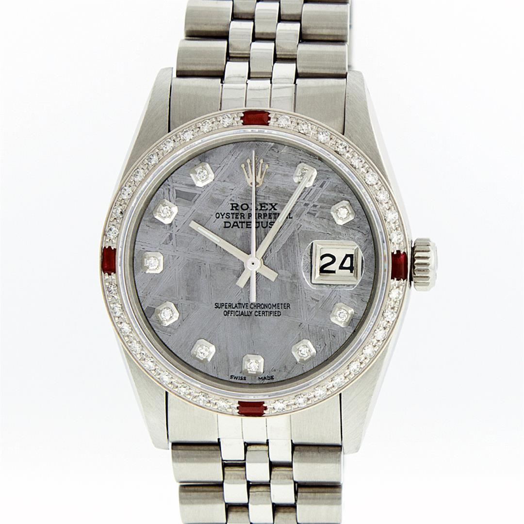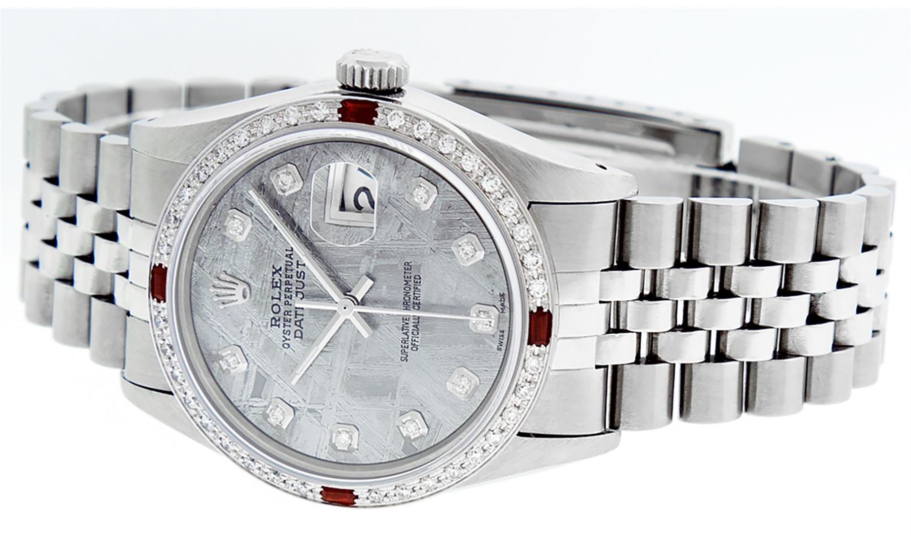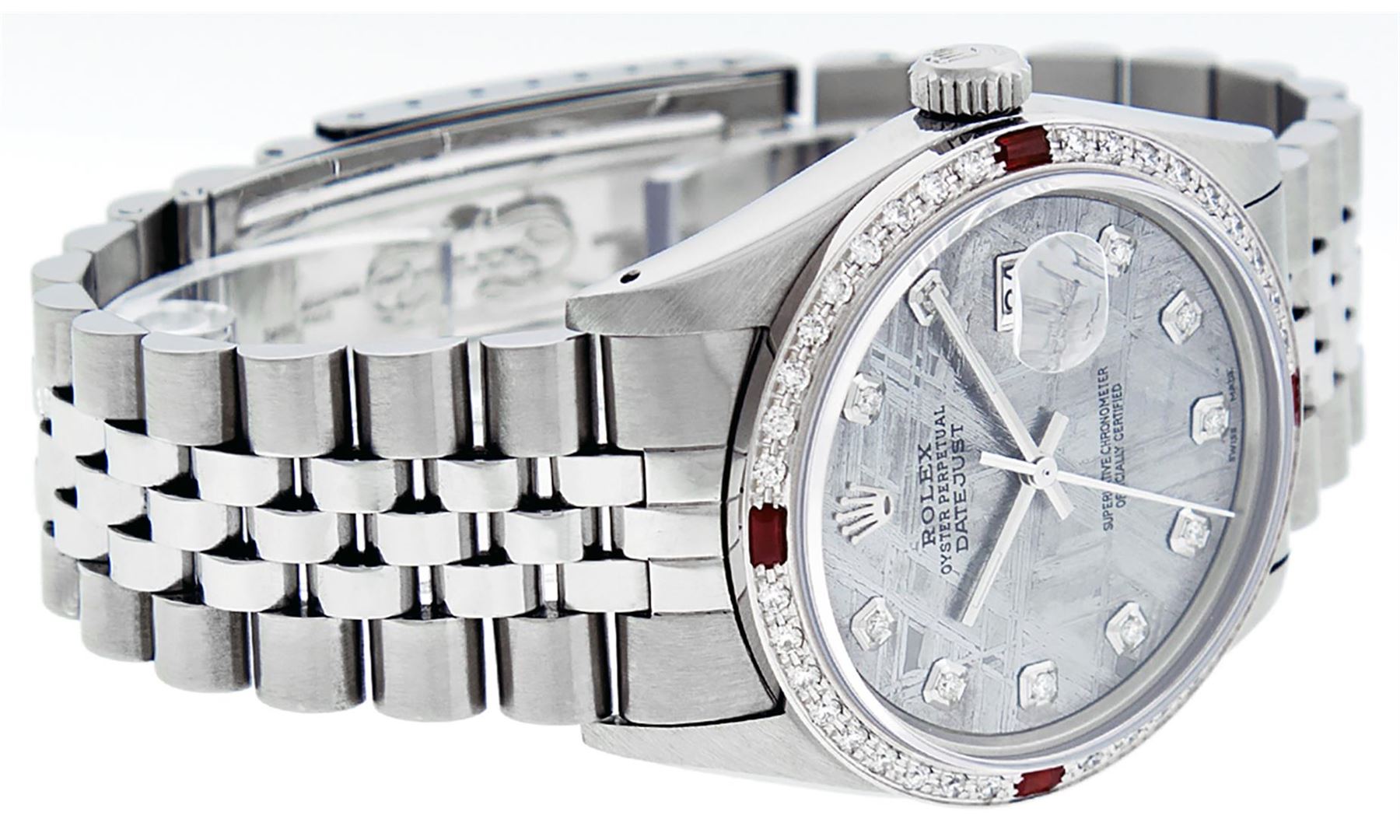 One Mens Stainless Steel Rolex Datejust Polished, Serviced & Electronically Tested, Stainless Steel Case: 36mm, Stainless Steel Crown, Custom Bezel: New 18K White Gold Ruby Beadset Diamond Bezel, Diamond + Gem Count: 36 Diamonds + 4 Rubies, Total Weight 1.00 Carat, Clarity: SI-VS, Color: G to H. Custom Crystal: New Scratch Resistant Synthetic Sapphire Cyclops Lens. Custom Hands: New Luminescent Hands. Movement: Automatic Winding Movement Caliber 3035. Custom Dial: Meteorite With Diamond Hour Markers, 10 Diamonds In Dial, G To H In Color, Clarity: SI-VS. Date Window: 3 O'Clock Position Date Display, Quickset, Model: Datejust. Condition: G-6 Extra Fine. Bracelet: Stainless Steel Jubilee. Bright Polish & Satin Finish. 7.0 Inch Length, Adjustable. Standard Clasp, With Rolex Logo. This Watch Has Been Serviced Time Tested And Is In Excellent Condition It Is Free Of All Scratches And Dents