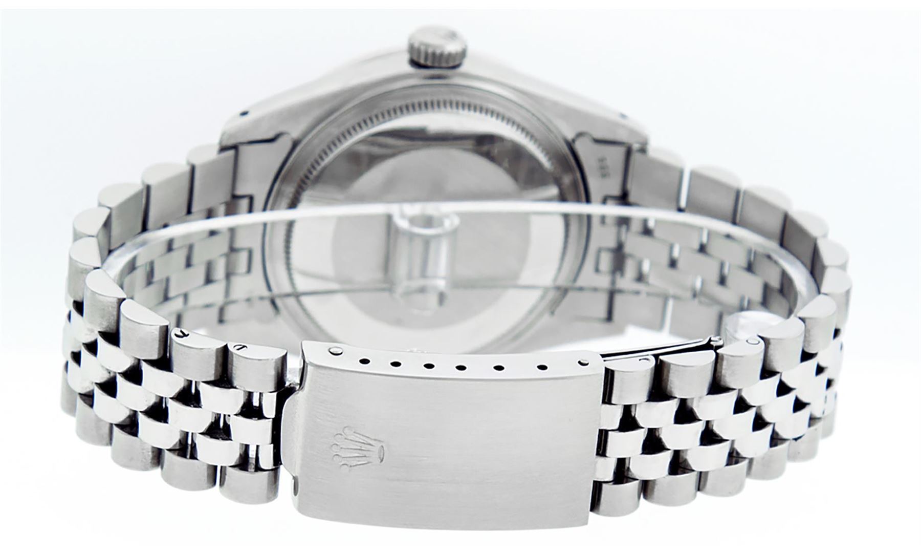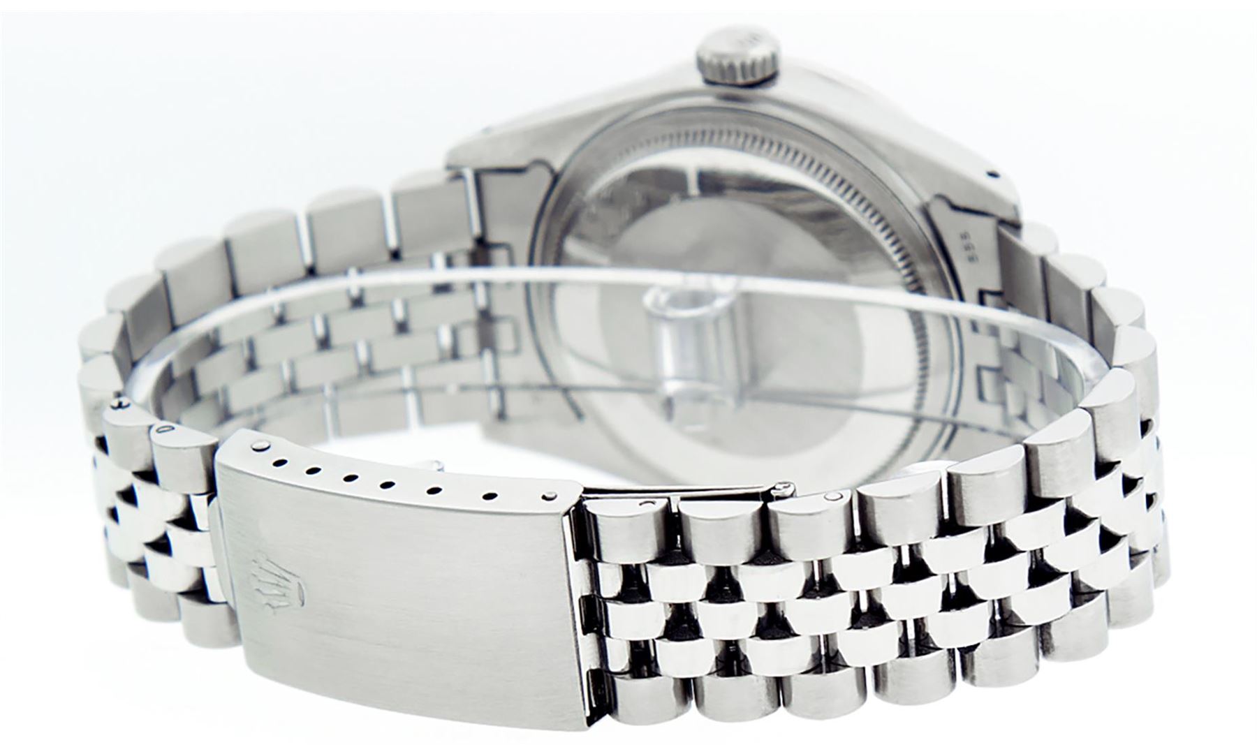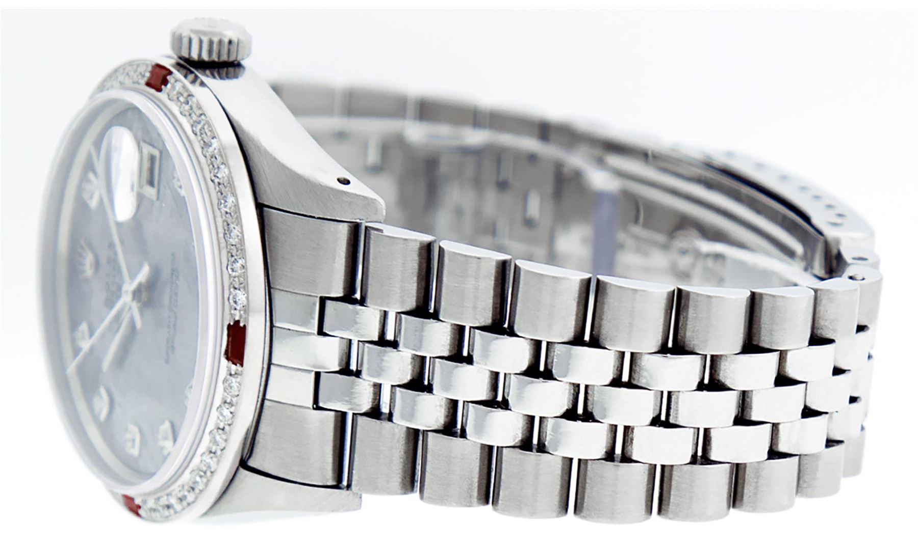One Mens Stainless Steel Rolex Datejust Polished, Serviced & Electronically Tested, Stainless Steel Case: 36mm, Stainless Steel Crown, Custom Bezel: New 18K White Gold Ruby Beadset Diamond Bezel, Diamond + Gem Count: 36 Diamonds + 4 Rubies, Total Weight 1.00 Carat, Clarity: SI-VS, Color: G to H. Custom Crystal: New Scratch Resistant Synthetic Sapphire Cyclops Lens. Custom Hands: New Luminescent Hands. Movement: Automatic Winding Movement Caliber 3035. Custom Dial: Meteorite With Diamond Hour Markers, 10 Diamonds In Dial, G To H In Color, Clarity: SI-VS. Date Window: 3 O'Clock Position Date Display, Quickset, Model: Datejust. Condition: G-6 Extra Fine. Bracelet: Stainless Steel Jubilee. Bright Polish & Satin Finish. 7.0 Inch Length, Adjustable. Standard Clasp, With Rolex Logo. This Watch Has Been Serviced Time Tested And Is In Excellent Condition It Is Free Of All Scratches And Dents