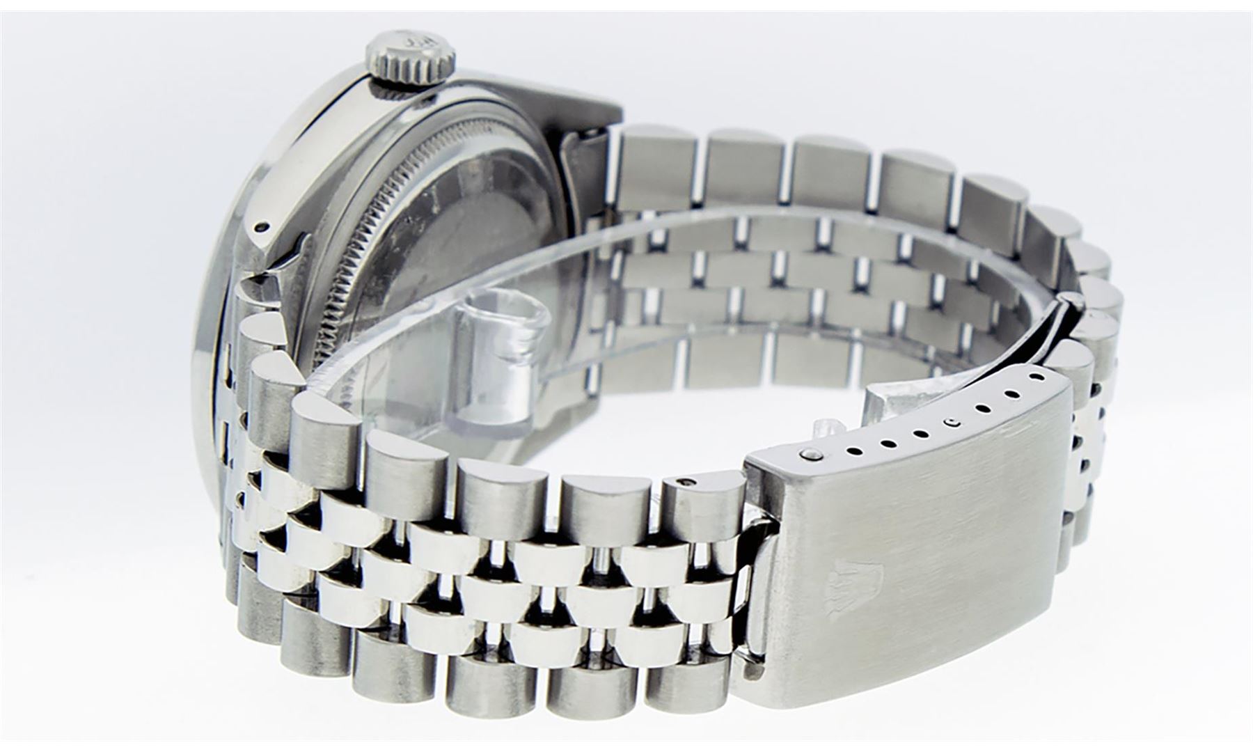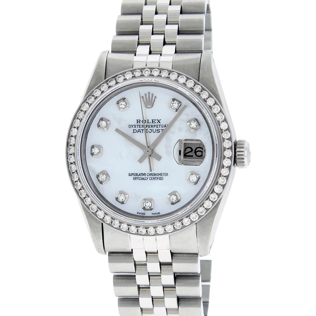 One Mens Rolex Stainless Steel Datejust Polished Bright with Satin Finish, This Watch Has Been Serviced & Electronically Tested, Stainless Steel Case: 36mm, Stainless Steel Crown, Custom Bezel: New Stainless Steel Beadset Diamond Bezel, Diamond Count: 54 Diamonds In Bezel, Total Weight 1.00 Carat, Clarity: SI-VS, Color: G to H. Custom Crystal: New Scratch Resistant Synthetic Sapphire Cyclops Lens. Custom Hands: New Luminescent Hands. Movement: Automatic Winding Movement. Custom Dial: Mother Of Pearl Diamond Dial, Diamond Count: 10 Diamonds On Dial, Color: G to H, Clarity: VS2-SI1. Date Window: 3 O'Clock Position Date Display, Quickset, Model: Datejust. Condition: G-6 Extra Fine. Bracelet: Stainless Steel Jubilee Band. Bright Polish & Satin Finish. 7.0 Inch Length, Adjustable. Standard Clasp, With Rolex Logo. This Watch Has Been Serviced Time Tested And Is In Excellent Condition It Is Free Of All Scratches And Dents.