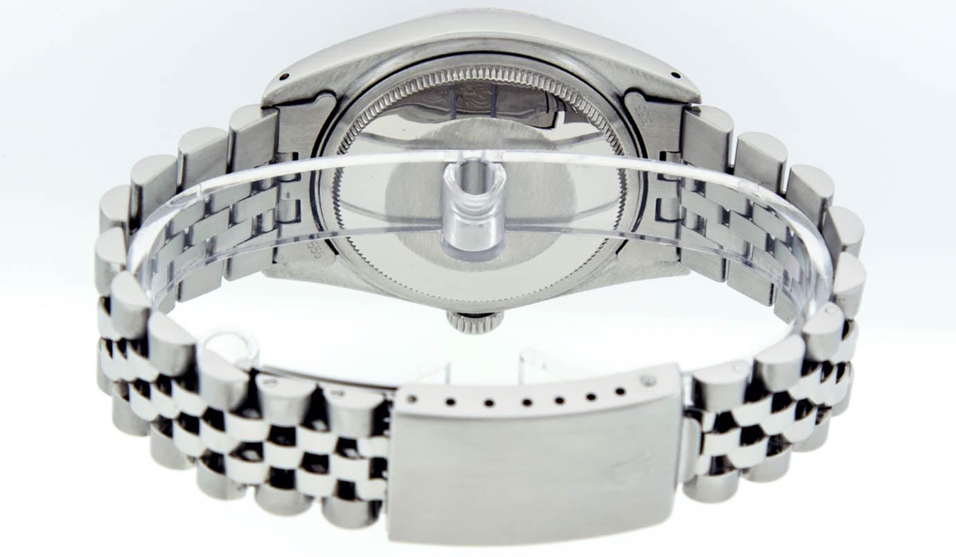 One Mens Rolex Datejust Polished Bright with Satin Finish, Serviced & Electronically Tested, Stainless Steel Case: 36mm, Stainless Steel Crown, Original Bezel: 14K White Gold Fluted Bezel. Custom Crystal: New Acrylic Cyclops Lens. Custom Hands: New Luminescent Hands. Movement: Automatic Winding Movement Caliber 3035. Custom Dial: Mother Of Pearl Emerald String Diamond Dial, Stone Count: 10 Emeralds + 48 Diamonds in Dial, G To H In Color, SI-VS Clarity. Date Window: 3 O'Clock Position Date Display, Quickset, Model: Datejust, Condition: G-6 Extra Fine. Bracelet: Stainless Steel Jubilee. Bright Polish & Satin Finish. 7.0 Inch Length, Adjustable. Standard Clasp, With Rolex Logo. Watch Has Been Serviced And Polished It Is Free Of All Scratches And Dents.