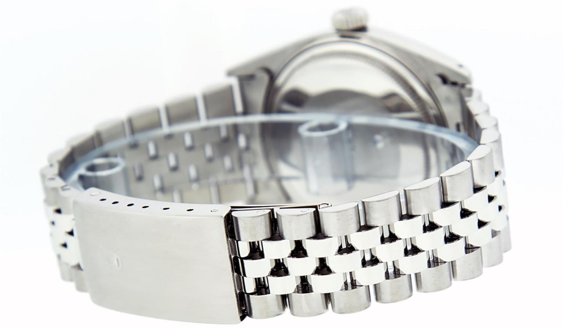 One Mens Rolex Datejust Polished Bright with Satin Finish, Serviced & Electronically Tested, Stainless Steel Case: 36mm, Stainless Steel Crown, Original Bezel: 14K White Gold Fluted Bezel. Custom Crystal: New Acrylic Cyclops Lens. Custom Hands: New Luminescent Hands. Movement: Automatic Winding Movement. Custom Dial: Mother Of Pearl Emerald String Diamond Dial, Stone Count: 10 Synthetic Emeralds + 48 Diamonds in Dial, G To H In Color, SI-VS Clarity. Date Window: 3 O'Clock Position Date Display, Quickset, Model: Datejust, Condition: G-6 Extra Fine. Bracelet: Stainless Steel Jubilee. Bright Polish & Satin Finish. 7.0 Inch Length, Adjustable. Standard Clasp, With Rolex Logo. Watch Has Been Serviced And Polished It Is Free Of All Scratches And Dents.