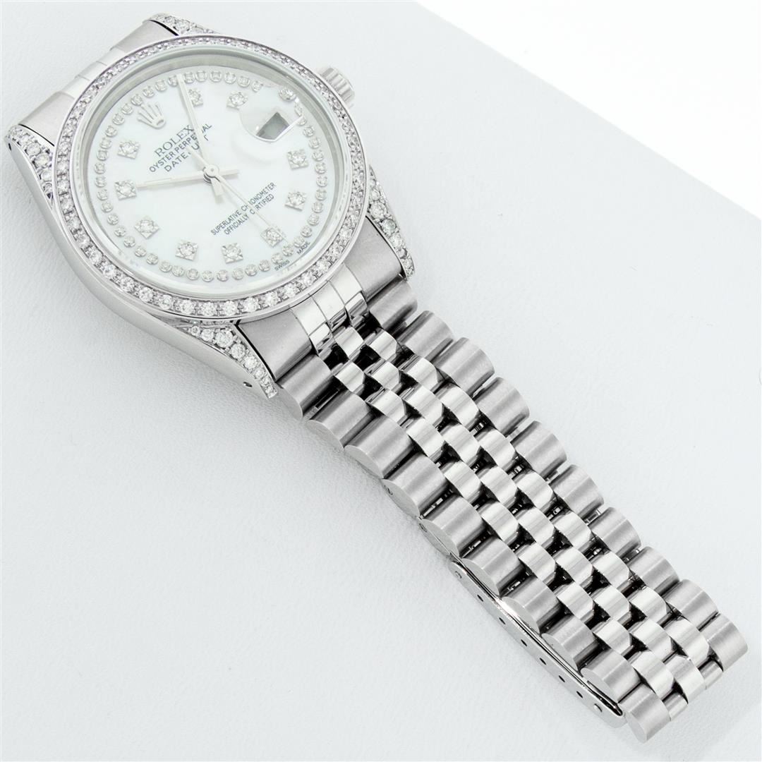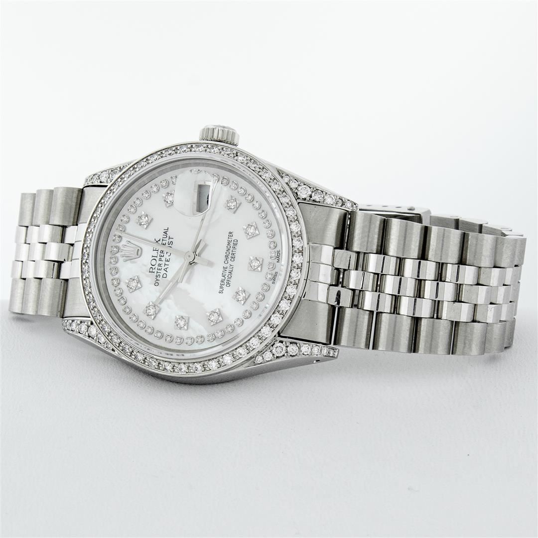 One Mens Rolex Datejust Polished Bright with Satin Finish, Serviced & Electronically Tested, Stainless Steel Case: 36mm, Custom Diamond Lugs: 28 Diamonds In Lugs, Color: G to H, Clarity: SI-VS. Stainless Steel Crown, Custom Bezel: 18K White Gold Diamond Beadset Bezel, Diamond Count: 44 Diamonds, Total Weight 1.00 Carat, Clarity: SI-VS, Color: G to H. Custom Crystal: New Scratch Resistant Synthetic Sapphire Cyclops Lens. Custom Hands: New Luminescent Hands. Movement: Automatic Winding Movement Caliber 3035. Custom Dial: Mother Of Pearl String Single Cut Diamond Dial, Stone Count: 58 Diamonds In Dial, Diamond Color: G To H In Color, Clarity: VS. Date Window: 3 O'Clock Position Date Display, Quickset, Model: Datejust Condition: G-6 Extra Fine. Bracelet: Stainless Steel Jubilee Band. Bright Polish & Satin Finish. 7.0 Inch Length, Adjustable. Standard Clasp, With Rolex Logo. This Watch Has Been Serviced And Polished And Its Free Of All Dents And Scratches.