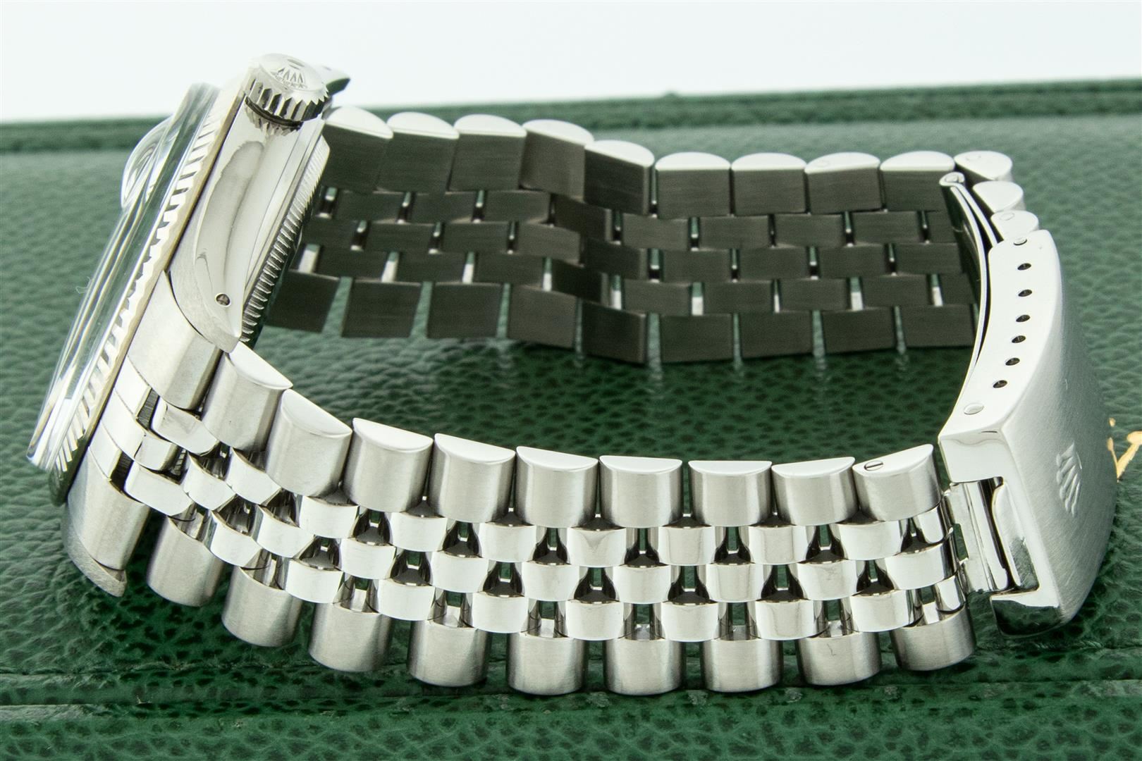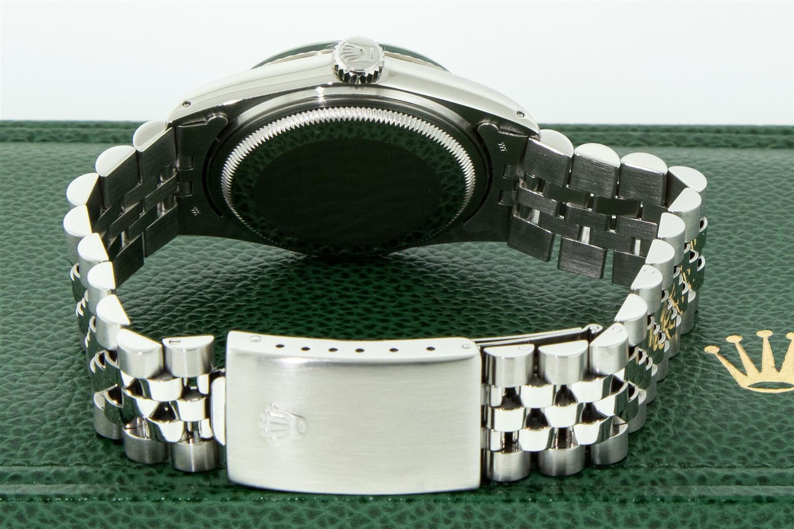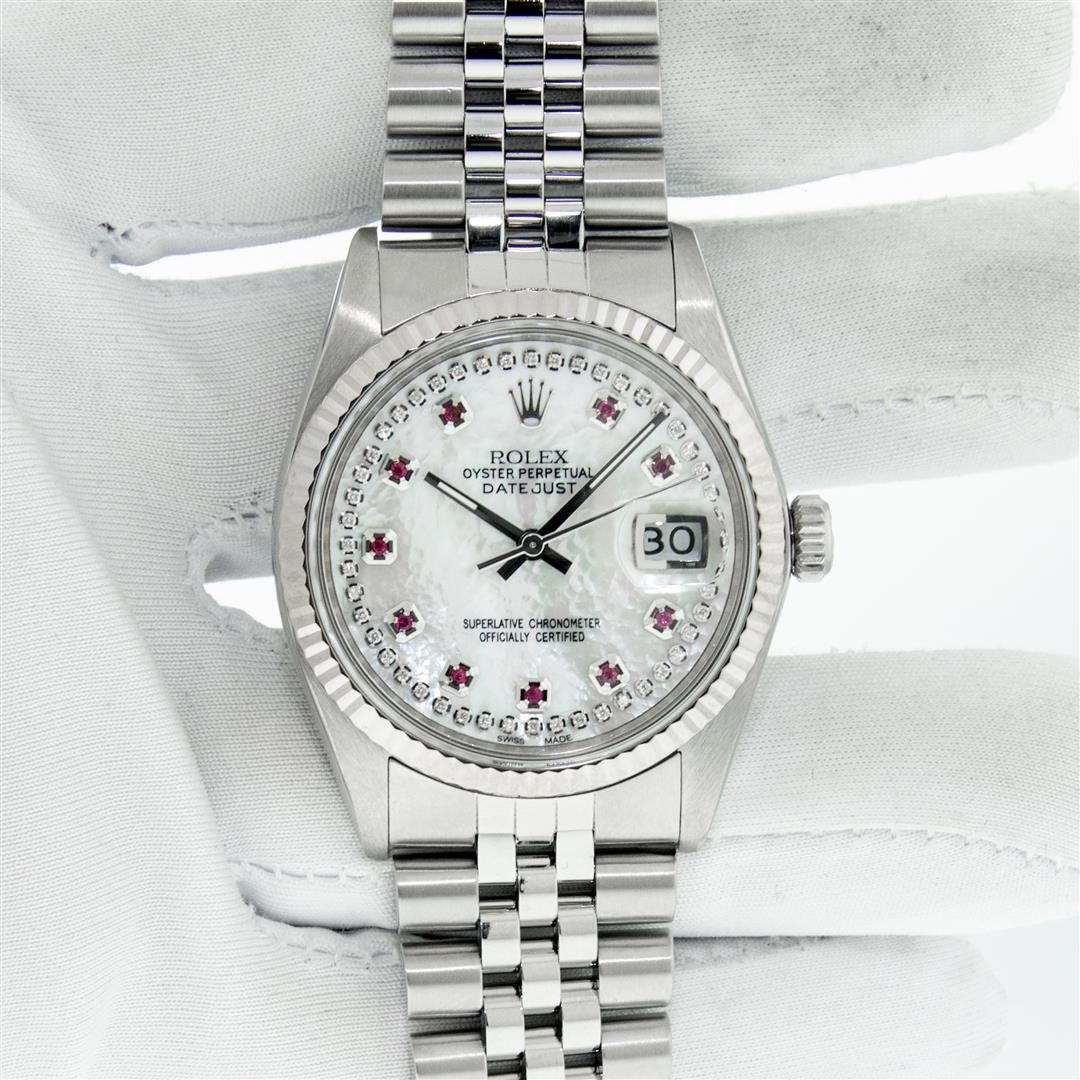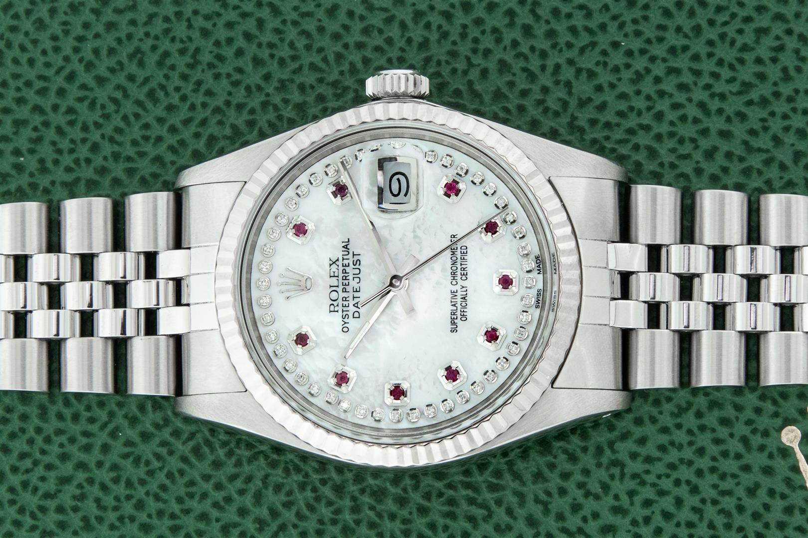 One Mens Stainless Steel Rolex Datejust Polished Bright with Satin Finish, Serviced & Electronically Tested, Stainless Steel Case: 36mm, Stainless Steel Crown, Original Bezel: White Gold Fluted Bezel. Custom Crystal: New Acrylic Cyclops Lens. Custom Hands: New Luminescent Hands. Movement: Automatic Winding Movement.. Custom Dial: Mother Of Pearl Ruby String Diamond Dial, Stone Count: 10 Rubies + 48 Diamonds in Dial, G To H In Color, SI-VS Clarity. Date Window: 3 O'Clock Position Date Display, Quickset, Model: Datejust, Condition: G-6 Extra Fine. Bracelet: Stainless Steel Jubilee. Bright Polish & Satin Finish. 7.0 Inch Length, Adjustable. Standard Clasp, With Rolex Logo. Watch Has Been Serviced And Polished It Is Free Of All Scratches And Dents. This Watch Comes With A Rolex Box.