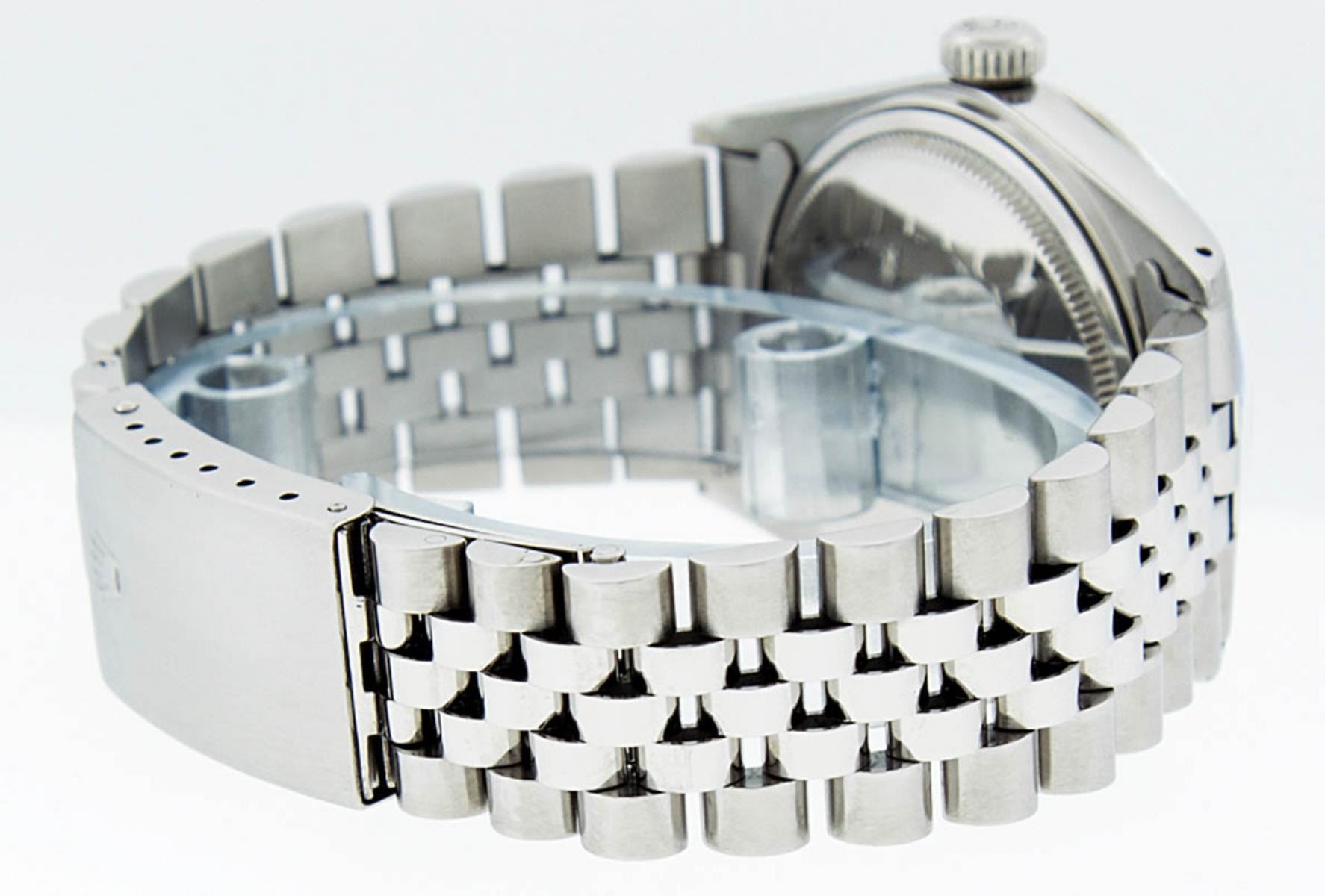 One Mens Stainless Steel Rolex Datejust Polished Bright with Satin Finish, Serviced & Electronically Tested, Stainless Steel Case: 36mm, Stainless Steel Crown, Original Bezel: 14K White Gold Fluted Bezel. Custom Crystal: New Acrylic Cyclops Lens. Custom Hands: New Luminescent Hands. Movement: Automatic Winding Movement Caliber 3035. Custom Dial: Mother Of Pearl Ruby String Diamond Dial, Stone Count: 10 Rubies + 48 Diamonds in Dial, G To H In Color, SI-VS Clarity. Date Window: 3 O'Clock Position Date Display, Quickset, Model: Datejust, Condition: G-6 Extra Fine. Bracelet: Stainless Steel Jubilee. Bright Polish & Satin Finish. 7.0 Inch Length, Adjustable. Standard Clasp, With Rolex Logo. Watch Has Been Serviced And Polished It Is Free Of All Scratches And Dents.