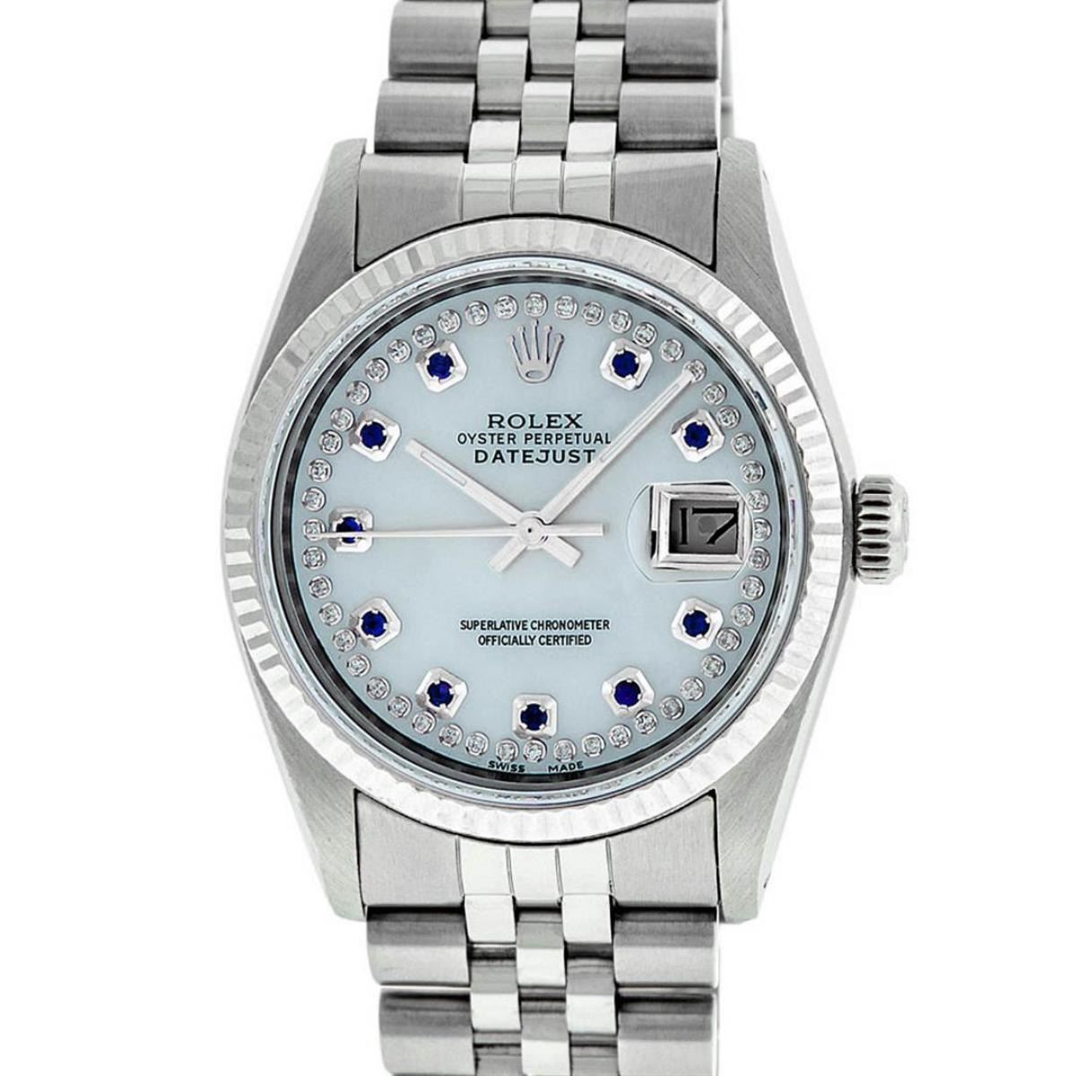 One Mens Stainless Steel Rolex Datejust Polished Bright with Satin Finish, Serviced & Electronically Tested, Stainless Steel Case: 36mm, Stainless Steel Crown, Bezel: 14K White Gold Fluted Bezel. Custom Crystal: New Acrylic Cyclops Lens. Custom Hands: New Luminescent Hands. Movement: Automatic Winding Movement Caliber 3035. Custom Dial: Mother Of Pearl Sapphire String Diamond Dial, Stone Count: 10 Sapphires + 48 Diamonds in Dial, G To H In Color, SI-VS Clarity. Date Window: 3 O'Clock Position Date Display, Quickset, Model: Datejust, Condition: G-6 Extra Fine. Bracelet: Stainless Steel Jubilee. Bright Polish & Satin Finish. 7.0 Inch Length, Adjustable. Standard Clasp, With Rolex Logo. Watch Has Been Serviced And Polished It Is Free Of All Scratches And Dents.