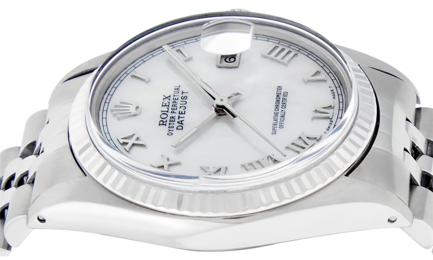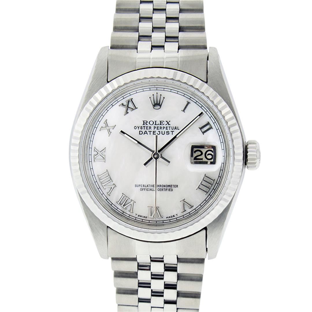 One Mens Stainless Steel Rolex Datejust Polished Bright with Satin Finish, Serviced & Electronically Tested, Stainless Steel Case: 36mm, Stainless Steel Crown, Bezel: 14K White Gold Fluted Bezel. Custom Crystal: New Acrylic Cyclops Lens. Custom Hands: New Luminecent Hands. Movement: Automatic Winding Movement Caliber 3035. Custom Dial: Mother Of Pearl Roman Dial With Square Track. Date Window: 3 O'Clock Position Date Display, Quickset, Model: Datejust, Condition: G-6 Extra Fine. Bracelet: Stainless Steel Jubilee. Bright Polish & Satin Finish. 7.0 Inch Length, Adjustable. Standard Clasp, With Rolex Logo. Watch Has Been Serviced And Polished It Is Free Of All Scratches And Dents.