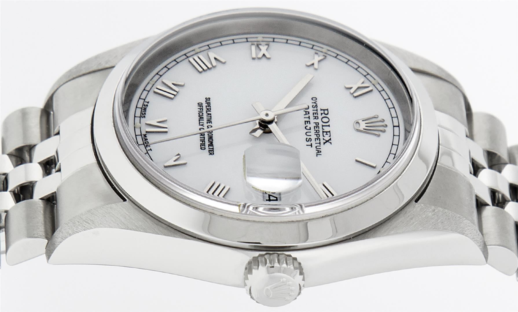 One Mens Rolex Pre Owned Quickset Stainless Steel Datejust Polished Bright with Satin Finish, Serviced & Electronically Tested, Rolex Stainless Steel Case: 36mm, Rolex Stainless Steel Crown, Rolex Bezel: Stainless Steel Smooth Bezel. Crystal: Sapphire With Magnified Date Window. Rolex Movement: Automatic Winding Movement Caliber 3135. Rolex Dial: White Roman With Square Track and Lumi Dot. Date Window: 3 O'Clock Position Date Display, Quickset, Model: Quickset Datejust. Condition: G-6 Extra Fine. Rolex Bracelet: Stainless Steel Jubilee Band. Bright Polish & Satin Finish. 7.0 Inch Length, Adjustable. Standard Clasp, With Rolex Logo. This Pre Owned Watch Has Been Serviced Time Tested And Is In Excellent Condition It Is Free Of All Scratches And Dents.