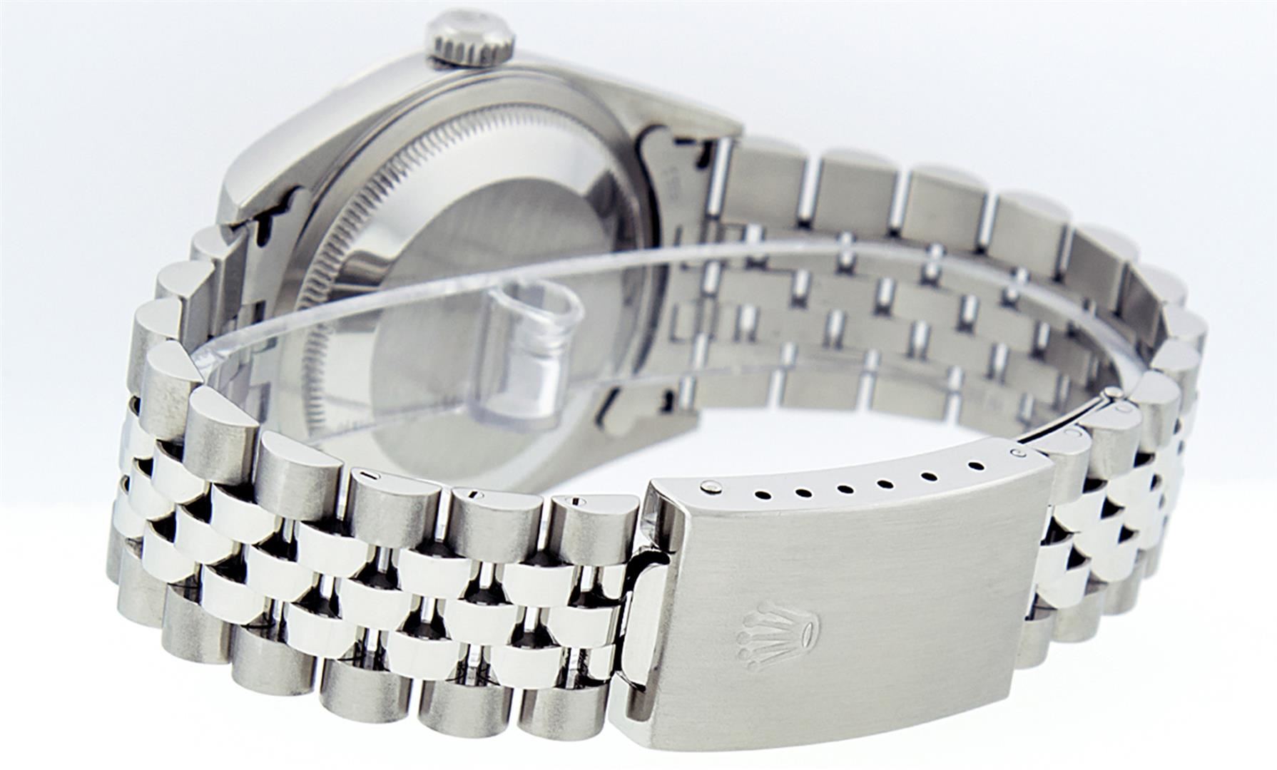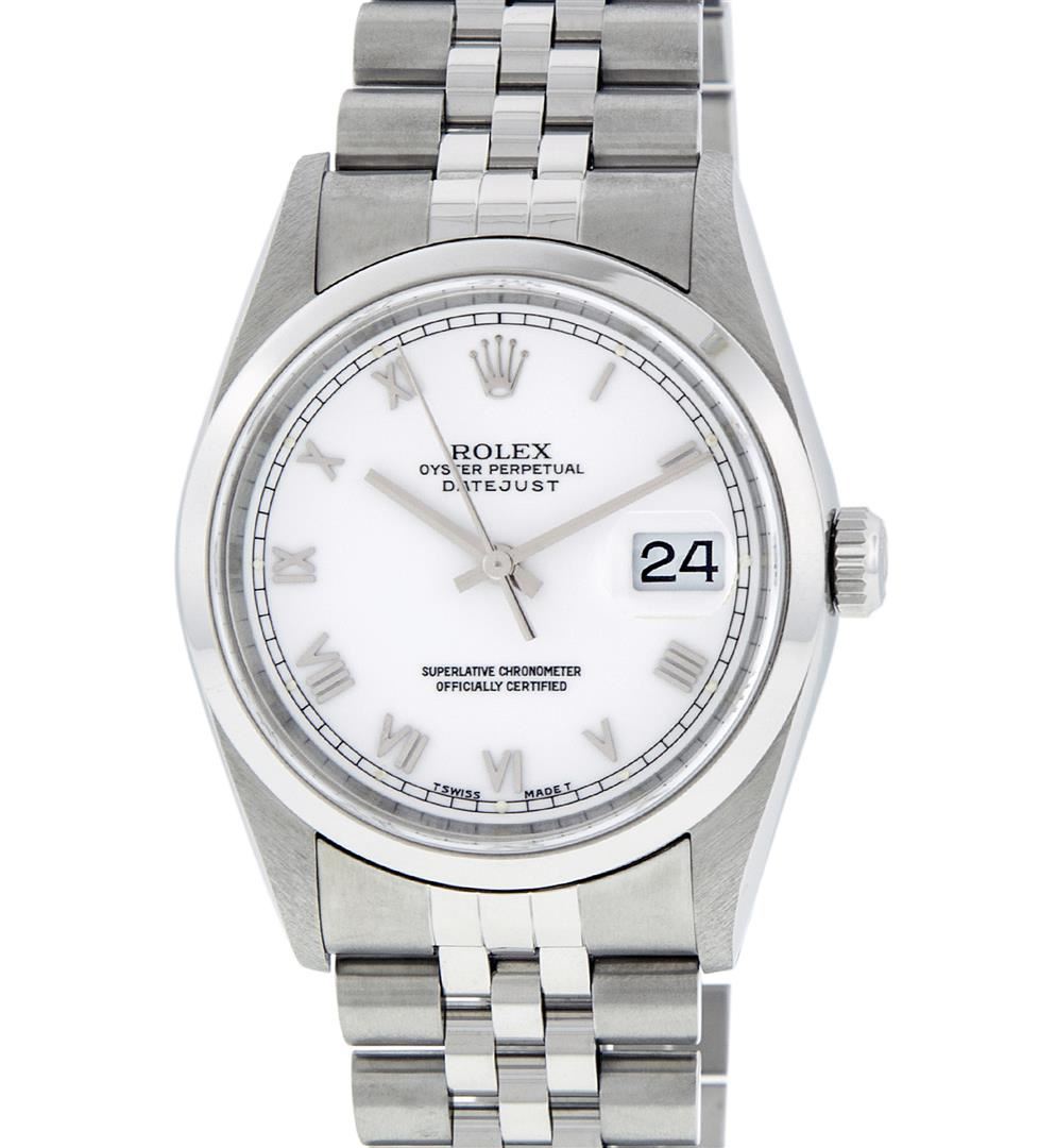 One Mens Rolex Pre Owned Quickset Stainless Steel Datejust Polished Bright with Satin Finish, Serviced & Electronically Tested, Rolex Stainless Steel Case: 36mm, Rolex Stainless Steel Crown, Rolex Bezel: Stainless Steel Smooth Bezel. Crystal: Sapphire With Magnified Date Window. Rolex Movement: Automatic Winding Movement Caliber 3135. Rolex Dial: White Roman With Square Track and Lumi Dot. Date Window: 3 O'Clock Position Date Display, Quickset, Model: Quickset Datejust. Condition: G-6 Extra Fine. Rolex Bracelet: Stainless Steel Jubilee Band. Bright Polish & Satin Finish. 7.0 Inch Length, Adjustable. Standard Clasp, With Rolex Logo. This Pre Owned Watch Has Been Serviced Time Tested And Is In Excellent Condition It Is Free Of All Scratches And Dents.