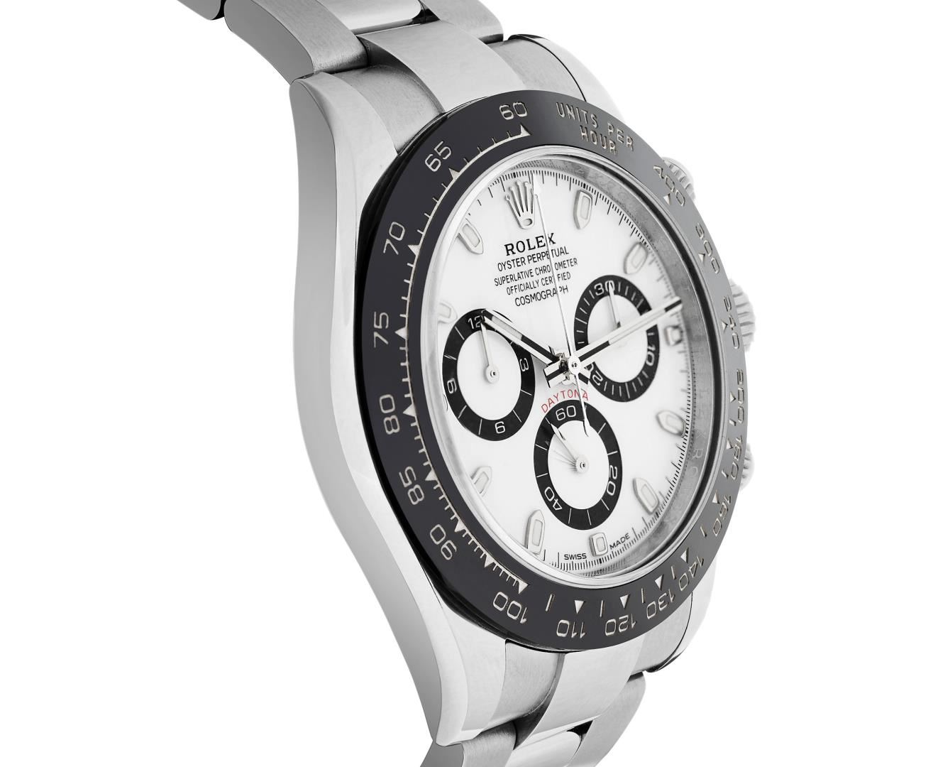 One Mens Pre Owned Stainless Steel Rolex Daytona With Date Polished, Serviced And Electronically Tested, Rolex Stainless Steel Case: 40mm, Rolex Stainless Steel Crown, Rolex Bezel: Stainless Steel Rotatable Bezel With Black Ceramic Insert. Crystal: Sapphire With Magnified Date Window. Rolex Movement: Automatic Winding Movement Caliber 4130. This watch features A Chronograph with Large Central Chronograph Second Hand, 30 Minute Counter Sub-Dial at 3 O'Clock, 12 Hour Counter Sub-Dial at 9 O'Clock. Small Second Sub-Dial at 6 O'Clock. Rolex Dial: White with White Luminous hands and Index hour markers with small seconds hand at 6 o'clock, 30-minute counter at 3 o'clock and 12-hour counter at 9 o'clock. Date Display, Model: Daytona 116500. Condition: G-6 Extra Fine. Rolex Bracelet: Stainless Steel Oyster Band. Bright Polish & Satin Finish. 7.0 Inch Length, Adjustable. Standard Clasp, With Rolex Logo. This Watch Comes With A Rolex Box And Card.
