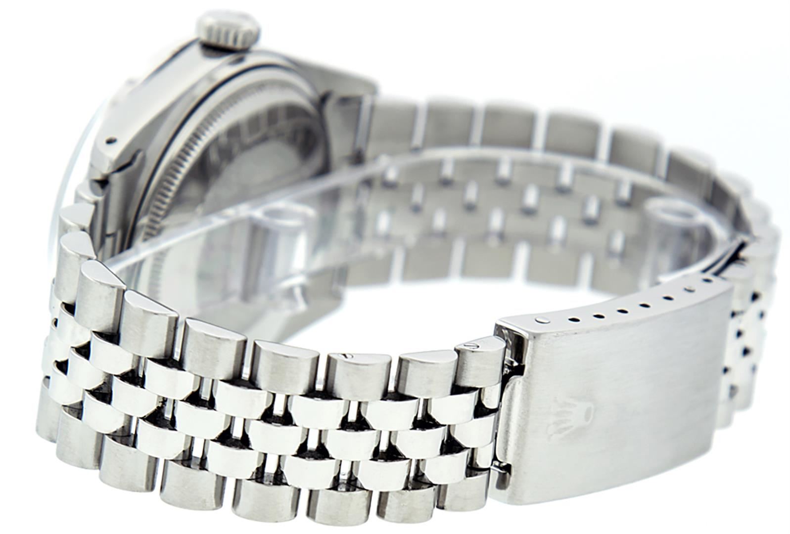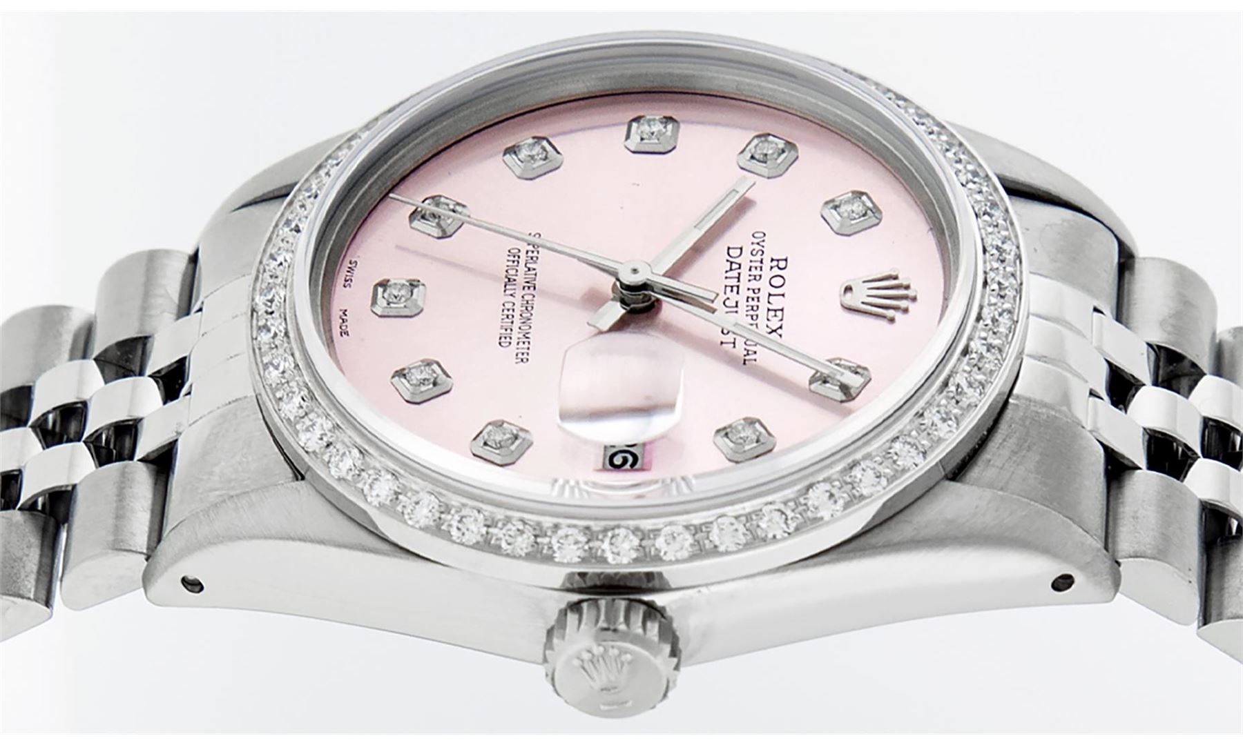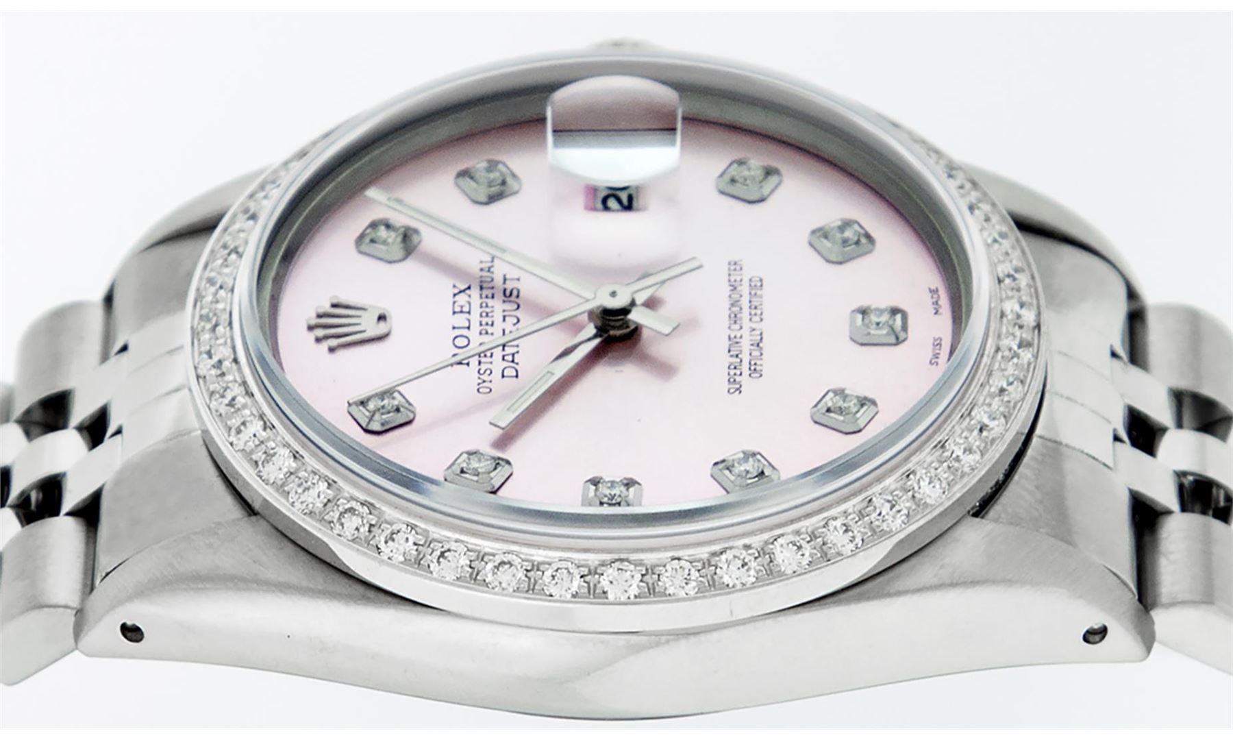 One Mens Stainless Steel Rolex Datejust Polished, Serviced & Electronically Tested, Stainless Steel Case: 36mm, Stainless Steel Crown, Custom Bezel: New 18K White Gold Beadset Diamond Bezel, Diamond Count: 44 Diamonds, Total Weight 1.00 Carat, Clarity: SI-VS, Color: G to H. Custom Crystal: New Scratch Resistant Synthetic Sapphire Cyclops Lens. Custom Hands: New Luminescent Hands. Movement: Automatic Winding Movement. Custom Dial: Ice Pink With Diamond Hour Markers, 10 Diamonds In Dial, G To H In Color, Clarity: SI-VS. Date Window: 3 O'Clock Position Date Display, Quickset, Model: Datejust. Condition: G-6 Extra Fine. Bracelet: Stainless Steel Jubilee Band. Bright Polish & Satin Finish. 7.0 Inch Length, Adjustable. Standard Clasp, With Rolex Logo. This Watch Has Been Serviced Time Tested And Is In Excellent Condition It Is Free Of All Scratches And Dents.