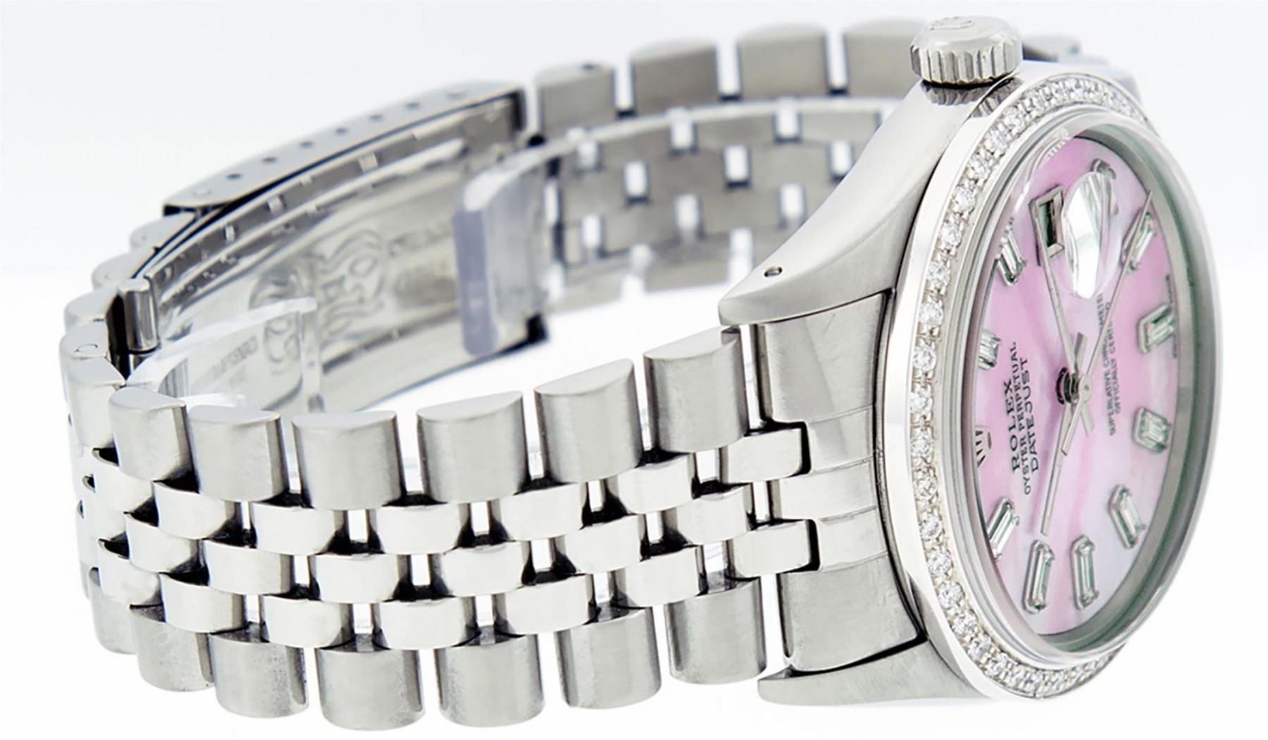 One Mens Stainless Steel Rolex Datejust Polished, Serviced & Electronically Tested, Stainless Steel Case: 36mm, Stainless Steel Crown, New Custom Bezel: 18K White Gold Beadset Diamond Bezel, Diamond Count: 44 Diamonds. Total Weight 1.00 Carat, Clarity: SI-VS, Color: G to H. Custom Crystal: New Scratch Resistant Synthetic Sapphire Cyclops Lens. Custom Hands: New Luminescent Hands. Movement: Automatic Winding Movement Caliber 3035. Custom Refinshed Dial: Pink Mother Of Pearl With Baguette Diamond Hour Markers, Stone Count: 10 Baguette Diamonds On Dial. G To H In Color, Clarity: SI-VS. Date Window: 3 O'Clock Position Date Display, Quickset, Model: Datejust. Condition: G-6 Extra Fine. Bracelet: Stainless Steel Jubilee Band. Bright Polish & Satin Finish. 7.0 Inch Length, Adjustable. Standard Clasp, With Rolex Logo. This Watch Has Been Serviced Time Tested And Is In Excellent Condition It Is Free Of All Scratches And Dents.