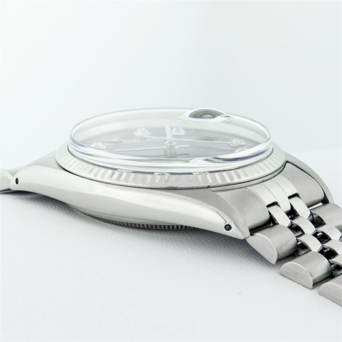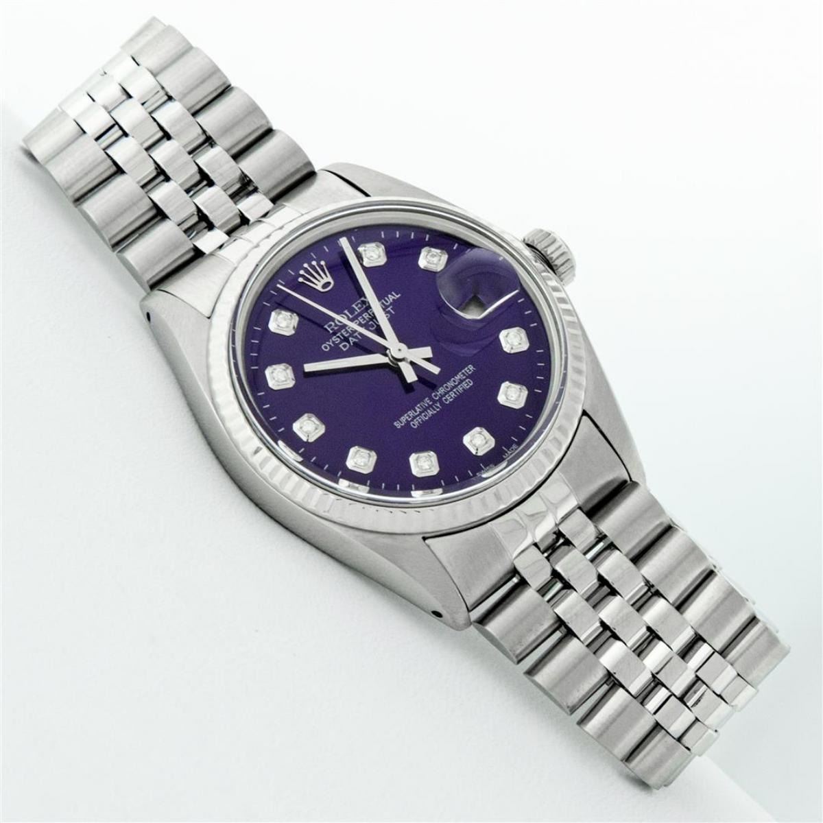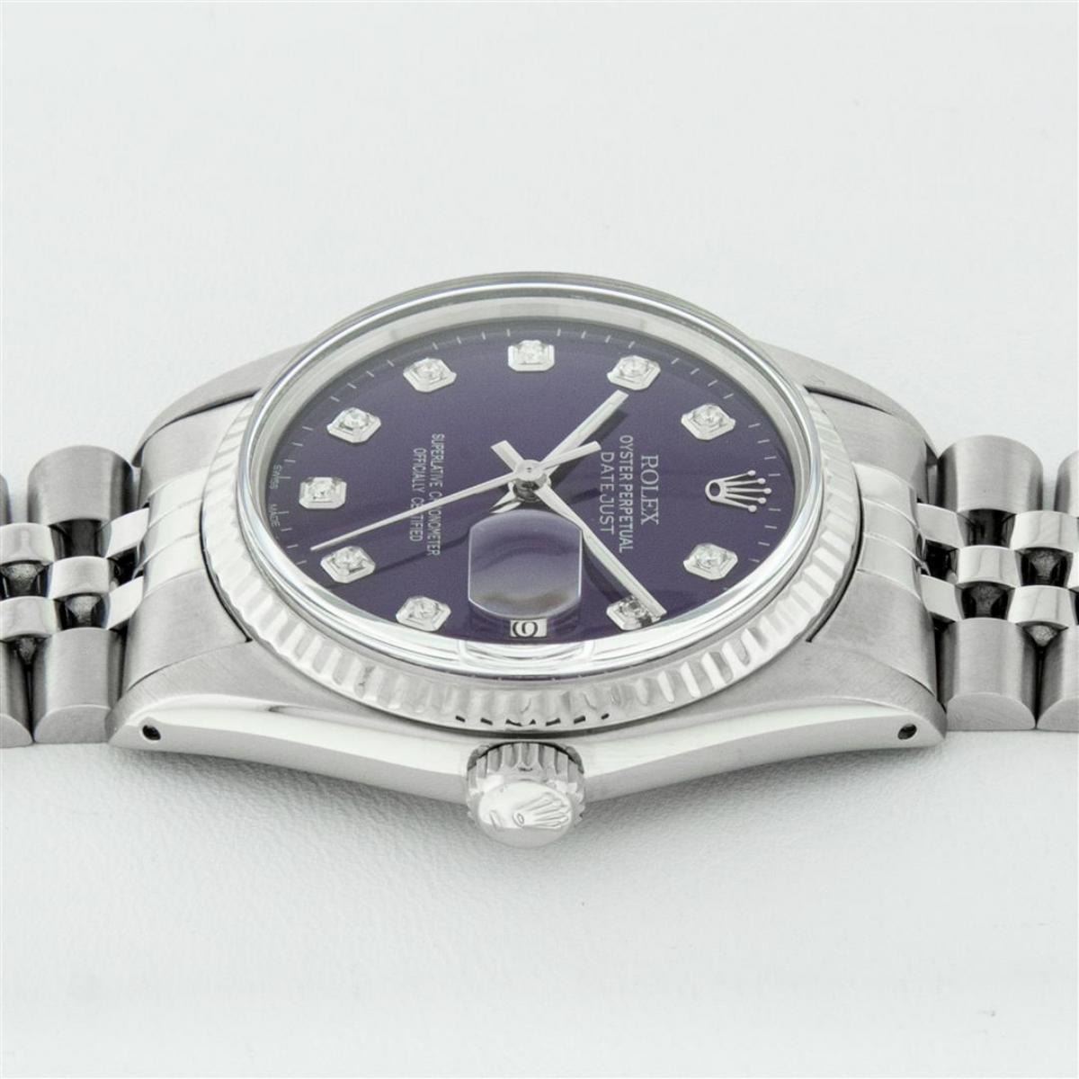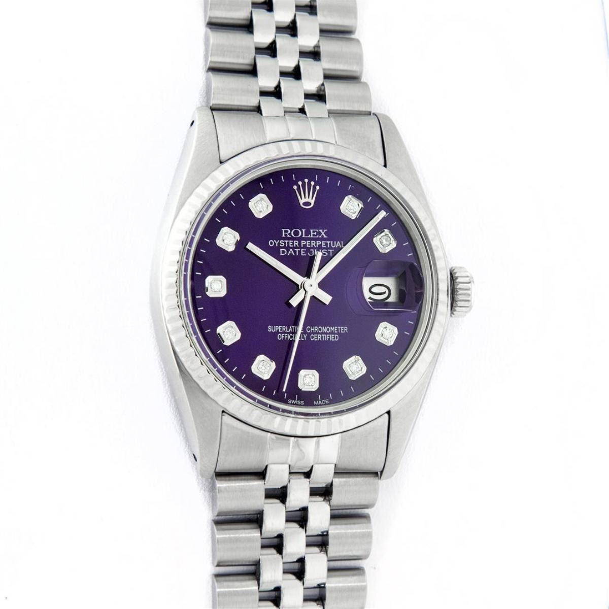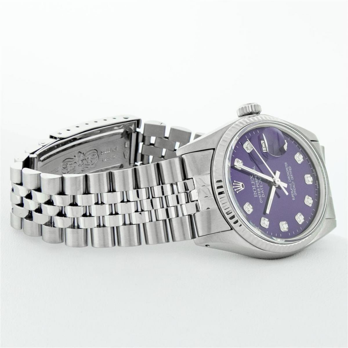 One Mens Stainless Steel Rolex Datejust Polished Bright with Satin Finish, This Watch Has Been Serviced & Electronically Tested, Stainless Steel Case: 36mm, Stainless Steel Crown, Bezel: 14K White Gold Fluted Bezel. Custom Crystal: New Acrylic Cyclops Lens. Custom Hands: New Luminescent Hands. Movement: Automatic Winding Movement Caliber 3035. Custom Dial: Purple Diamond Dial With Diamond Hour Markers And Dash Track, Diamond Count: 10 Diamonds in Dial G To H In Color, SI-VS Clarity. Date Window: 3 O'Clock Position Date Display, Quickset, Model: Datejust, Condition: G-6 Extra Fine. Bracelet: Stainless Steel Jubilee Band. Bright Polish & Satin Finish. 7.0 Inch Length, Adjustable. Standard Clasp, With Rolex Logo. This Watch Has Been Serviced Time Tested And Is In Excellent Condition It Is Free Of All Scratches And Dents. This Watch Comes With A Rolex Box.