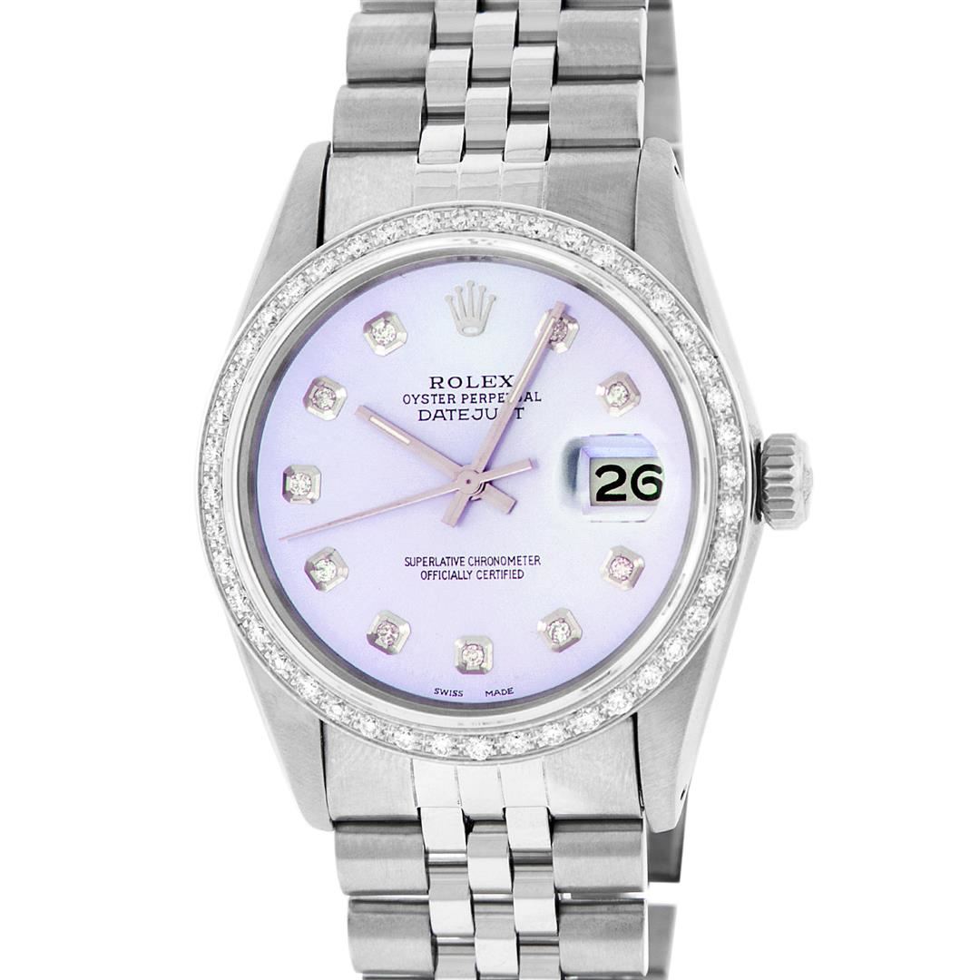 One Mens Stainless Steel Rolex Datejust Polished, Serviced & Electronically Tested, Stainless Steel Case: 36mm, Stainless Steel Crown, Custom Bezel: New 18K White Gold Beadset Diamond Bezel, Diamond Count: 44 Diamonds In Bezel, Total Weight 1.00 Carat, Clarity: SI-VS, Color: G to H. Custom Crystal: New Scratch Resistant Synthetic Sapphire Cyclops Lens. Custom Hands: New Luminescent Hands. Movement: Automatic Winding Movement Caliber 3035. Custom Dial: Purple Diamond Dial, Diamond Count: 10 Diamonds in Dial, G To H In Color, Clarity: SI-VS. Date Window: 3 O'Clock Position Date Display, Quickset, Model: Datejust. Condition: G-6 Extra Fine. Bracelet: Stainless Steel Jubilee Band. Bright Polish & Satin Finish. 7.0 Inch Length, Adjustable. Standard Clasp, With Rolex Logo. This Watch Has Been Serviced Time Tested And Is In Excellent Condition It Is Free Of All Scratches And Dents.