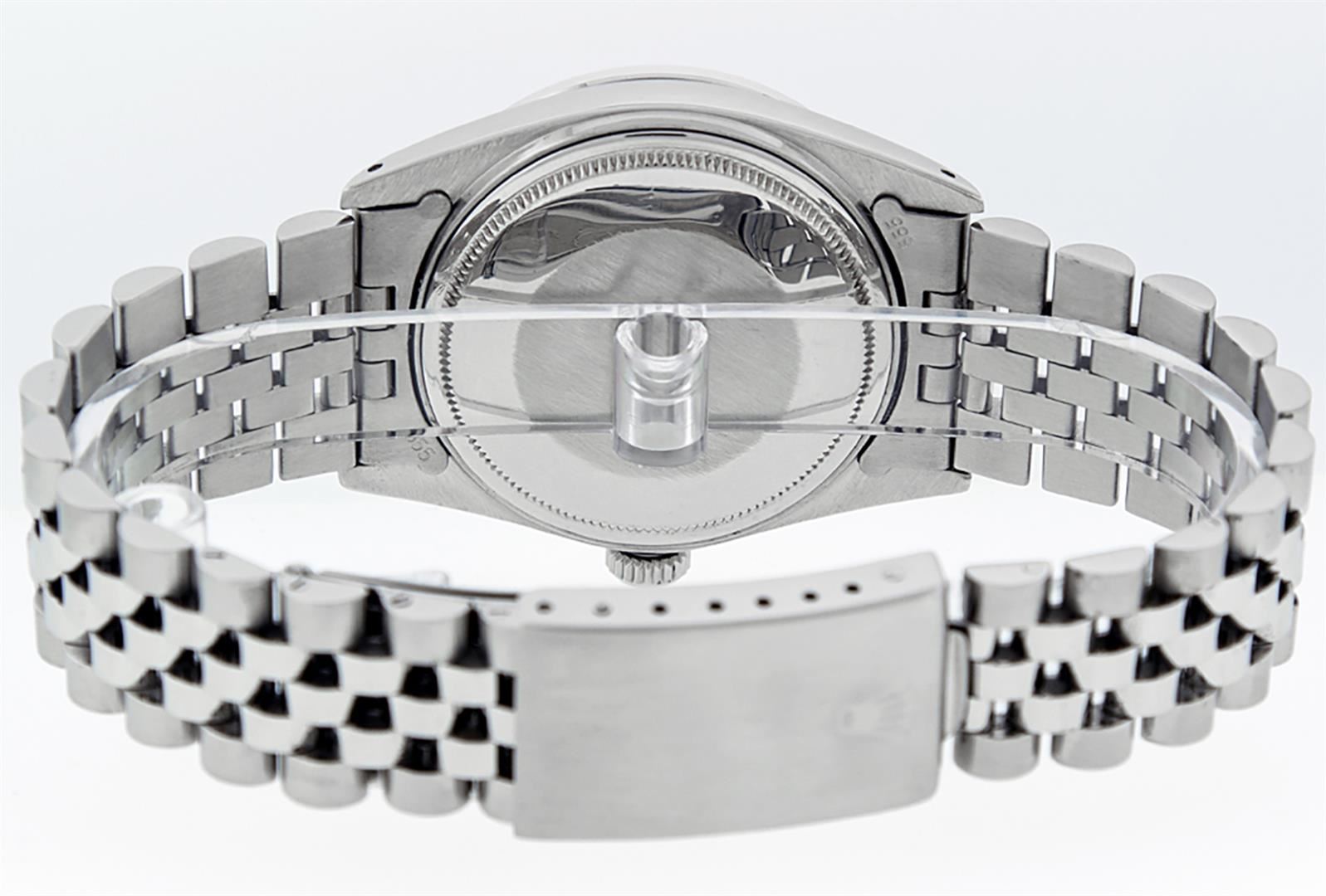 One Mens Stainless Steel Rolex Datejust Polished, Serviced & Electronically Tested, Stainless Steel Case: 36mm, Stainless Steel Crown, Custom Bezel: New 18K White Gold Beadset Diamond Bezel, Diamond Count: 44 Diamonds In Bezel, Total Weight 1.00 Carat, Clarity: SI-VS, Color: G to H. Custom Crystal: New Scratch Resistant Synthetic Sapphire Cyclops Lens. Custom Hands: New Luminescent Hands. Movement: Automatic Winding Movement Caliber 3035. Custom Dial: Purple Diamond Dial, Diamond Count: 10 Diamonds in Dial, G To H In Color, Clarity: SI-VS. Date Window: 3 O'Clock Position Date Display, Quickset, Model: Datejust. Condition: G-6 Extra Fine. Bracelet: Stainless Steel Jubilee Band. Bright Polish & Satin Finish. 7.0 Inch Length, Adjustable. Standard Clasp, With Rolex Logo. This Watch Has Been Serviced Time Tested And Is In Excellent Condition It Is Free Of All Scratches And Dents.