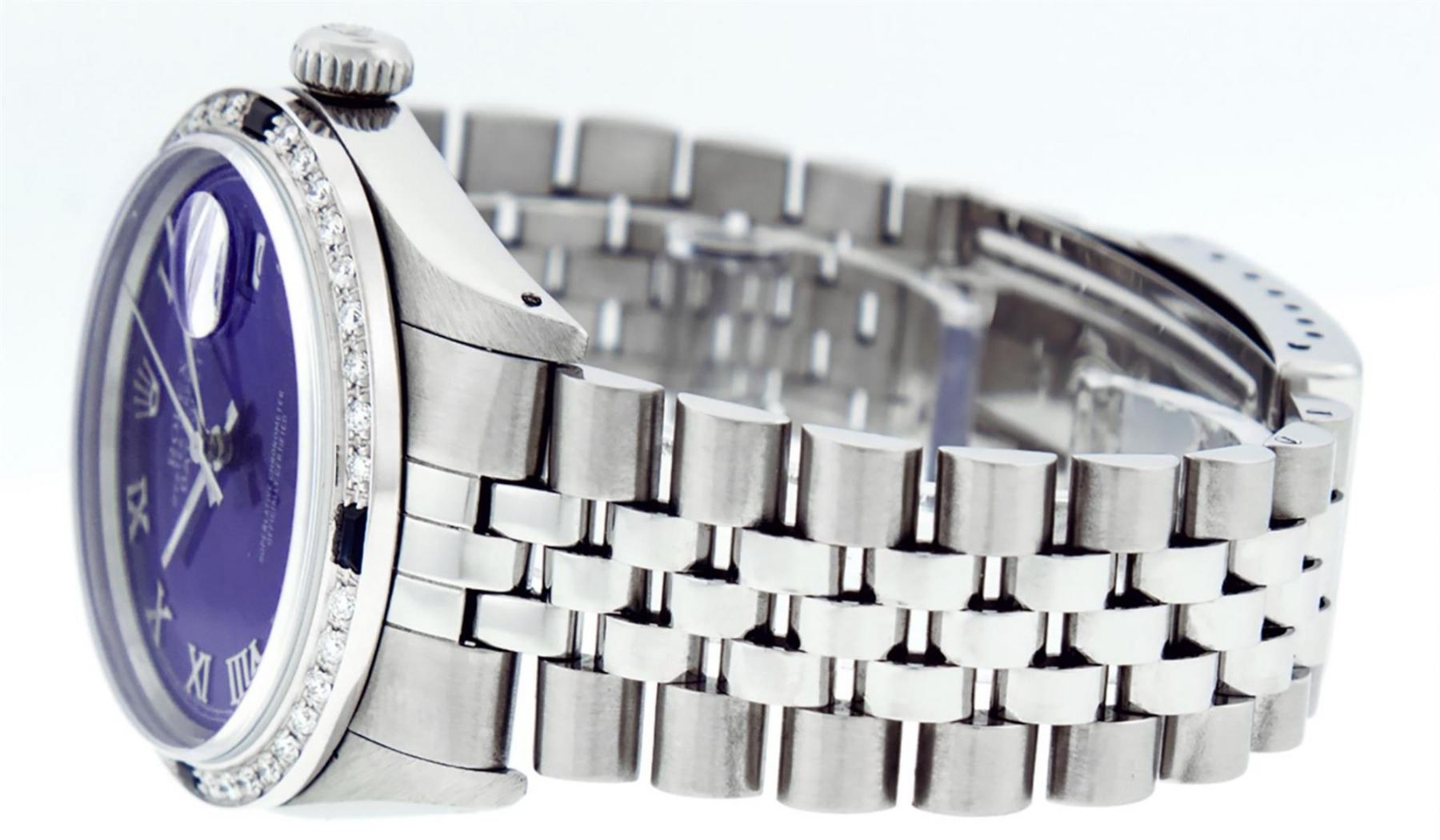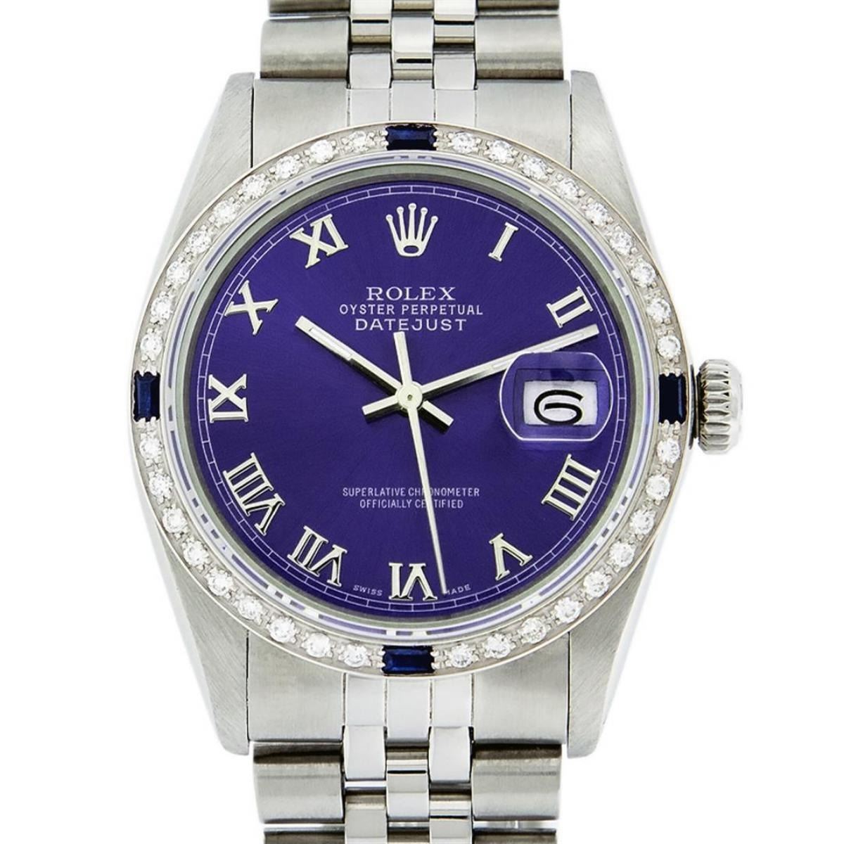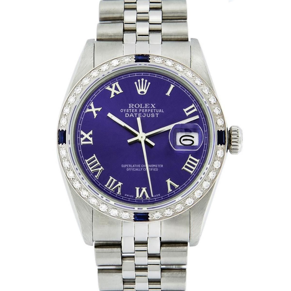 One Mens Stainless Steel Rolex Datejust Polished Bright with Satin Finish, This Watch Has Been Serviced & Electronically Tested, Stainless Steel Case: 36mm, Stainless Steel Crown, Custom Bezel: New 18K White Gold Sapphire Beadset Diamond Bezel, Diamond + Gem Count: 36 Diamonds + 4 Sapphires, Total Weight 1.00 Carat, Clarity: SI-VS, Color: G to H. Custom Crystal: New Scratch Resistant Synthetic Sapphire Cyclops Lens. Custom Hands: New Luminescent Hands. Movement: Automatic Winding Movement Caliber 3035. Custom Dial: Purple With Roman Hour Marker & Square Track. Date Window: 3 O'Clock Position Date Display, Quickset, Model: Datejust, Condition: G-6 Extra Fine. Bracelet: Stainless Steel Jubilee Band. Bracelet: 7.0 Inch Length, Adjustable. Standard Clasp, With Rolex Logo. This Watch Has Been Serviced Time Tested And Is In Excellent Condition It Is Free Of All Scratches And Dents.