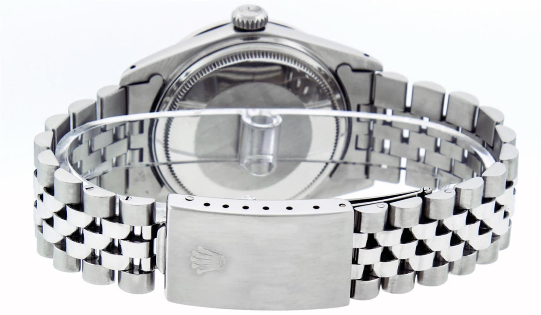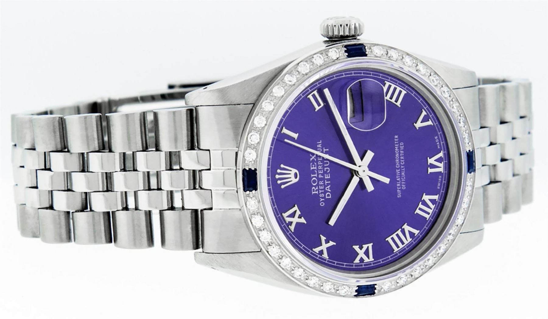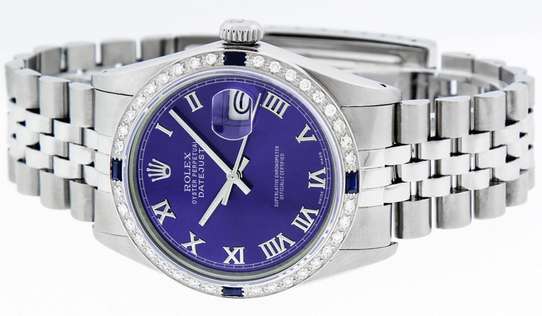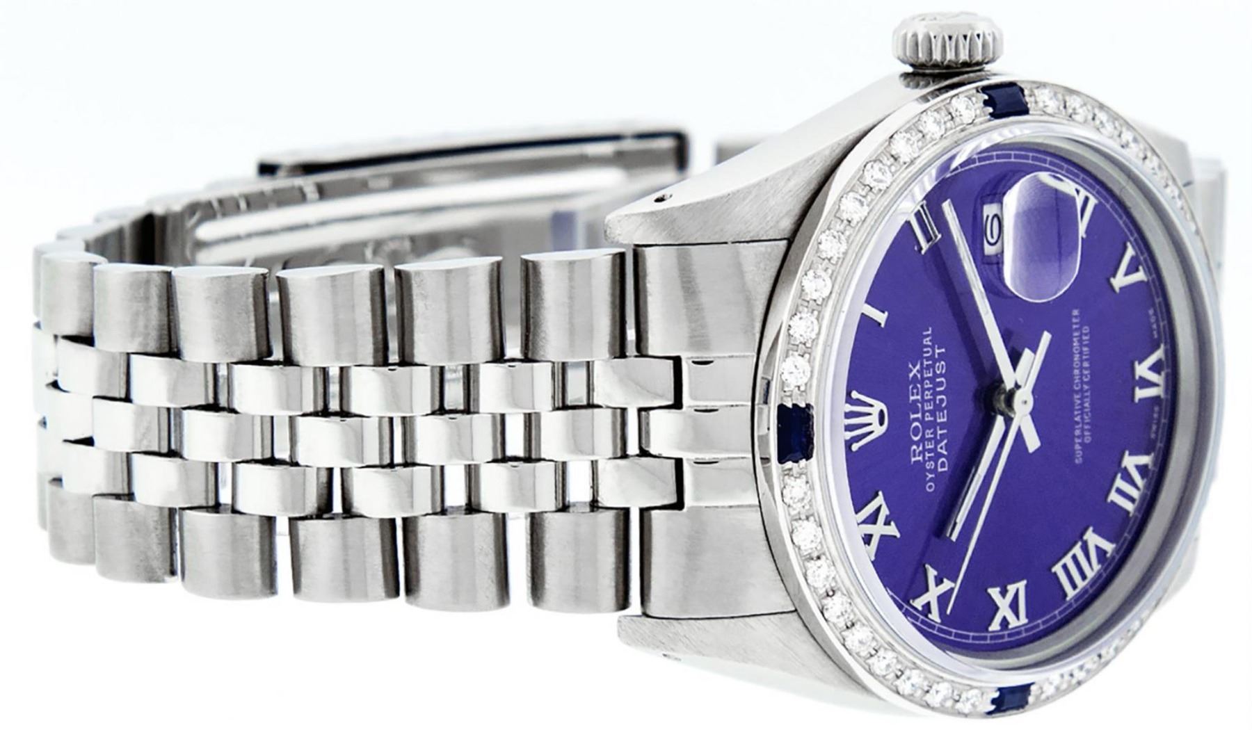 One Mens Stainless Steel Rolex Datejust Polished Bright with Satin Finish, This Watch Has Been Serviced & Electronically Tested, Stainless Steel Case: 36mm, Stainless Steel Crown, Custom Bezel: New 18K White Gold Sapphire Beadset Diamond Bezel, Diamond + Gem Count: 36 Diamonds + 4 Sapphires, Total Weight 1.00 Carat, Clarity: SI-VS, Color: G to H. Custom Crystal: New Scratch Resistant Synthetic Sapphire Cyclops Lens. Custom Hands: New Luminescent Hands. Movement: Automatic Winding Movement Caliber 3035. Custom Dial: Purple With Roman Hour Marker & Square Track. Date Window: 3 O'Clock Position Date Display, Quickset, Model: Datejust, Condition: G-6 Extra Fine. Bracelet: Stainless Steel Jubilee Band. Bracelet: 7.0 Inch Length, Adjustable. Standard Clasp, With Rolex Logo. This Watch Has Been Serviced Time Tested And Is In Excellent Condition It Is Free Of All Scratches And Dents.