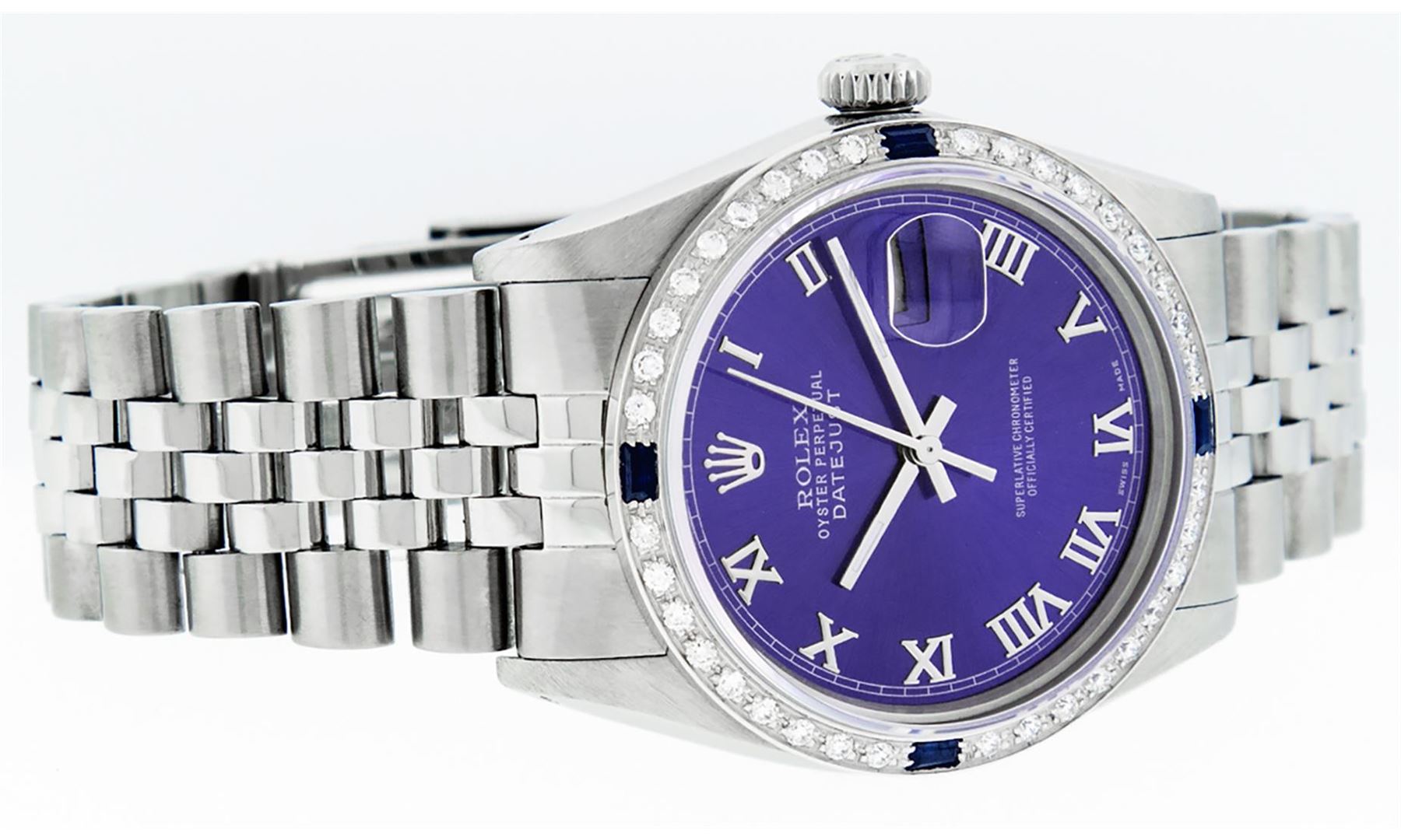 One Mens Stainless Steel Rolex Datejust Polished Bright with Satin Finish, This Watch Has Been Serviced & Electronically Tested, Stainless Steel Case: 36mm, Stainless Steel Crown, Custom Bezel: New 18K White Gold Sapphire Beadset Diamond Bezel, Diamond + Gem Count: 36 Diamonds + 4 Sapphires, Total Weight 1.00 Carat, Clarity: SI-VS, Color: G to H. Custom Crystal: New Scratch Resistant Synthetic Sapphire Cyclops Lens. Custom Hands: New Luminescent Hands. Movement: Automatic Winding Movement Caliber 3035. Custom Dial: Purple With Roman Hour Marker & Square Track. Date Window: 3 O'Clock Position Date Display, Quickset, Model: Datejust, Condition: G-6 Extra Fine. Bracelet: Stainless Steel Jubilee Band. Bracelet: 7.0 Inch Length, Adjustable. Standard Clasp, With Rolex Logo. This Watch Has Been Serviced Time Tested And Is In Excellent Condition It Is Free Of All Scratches And Dents.