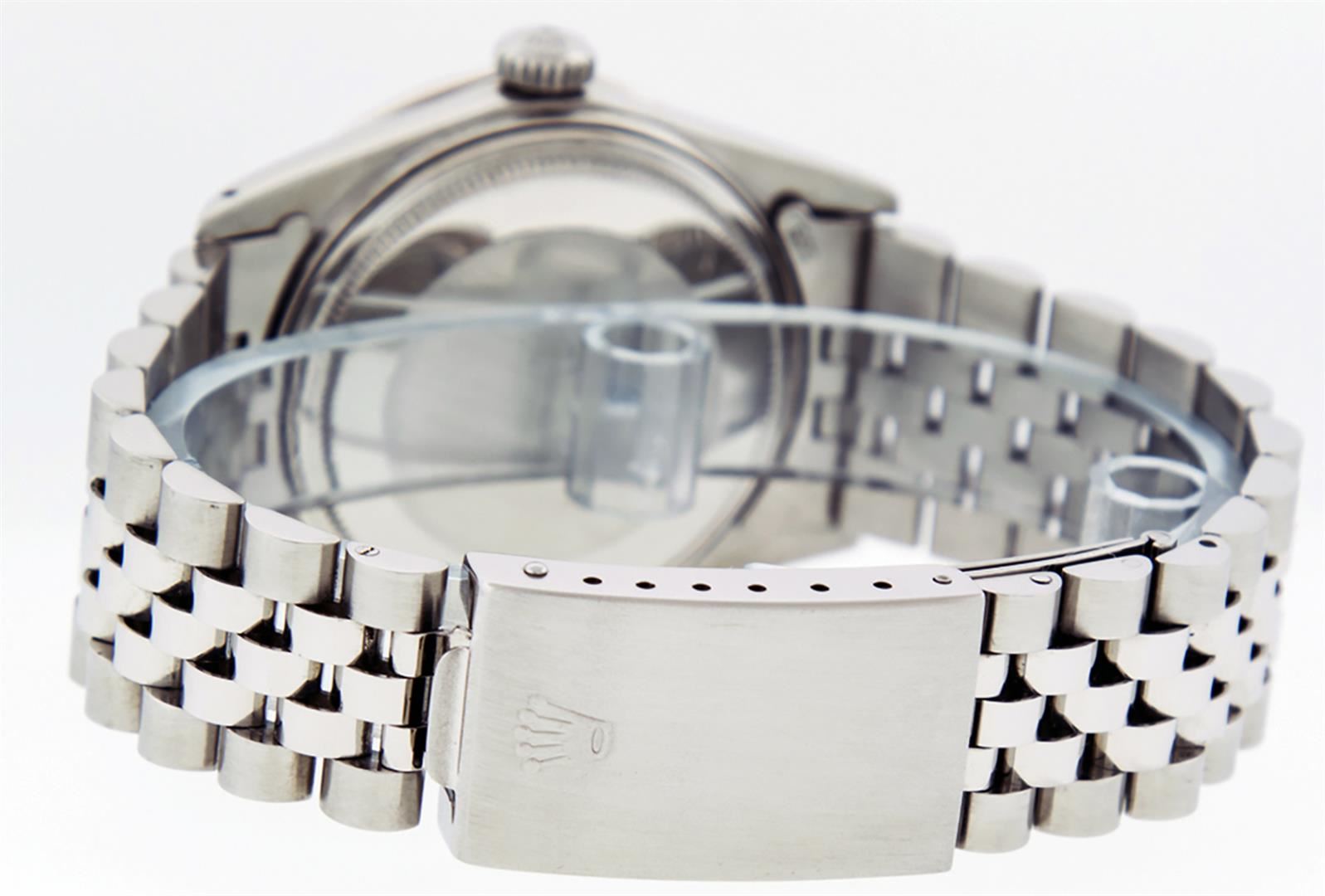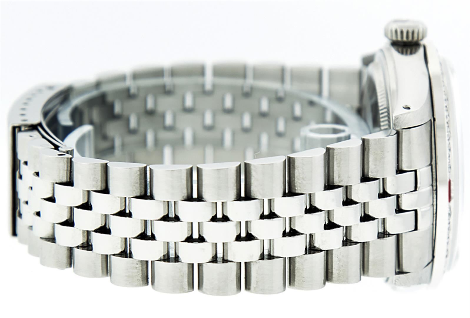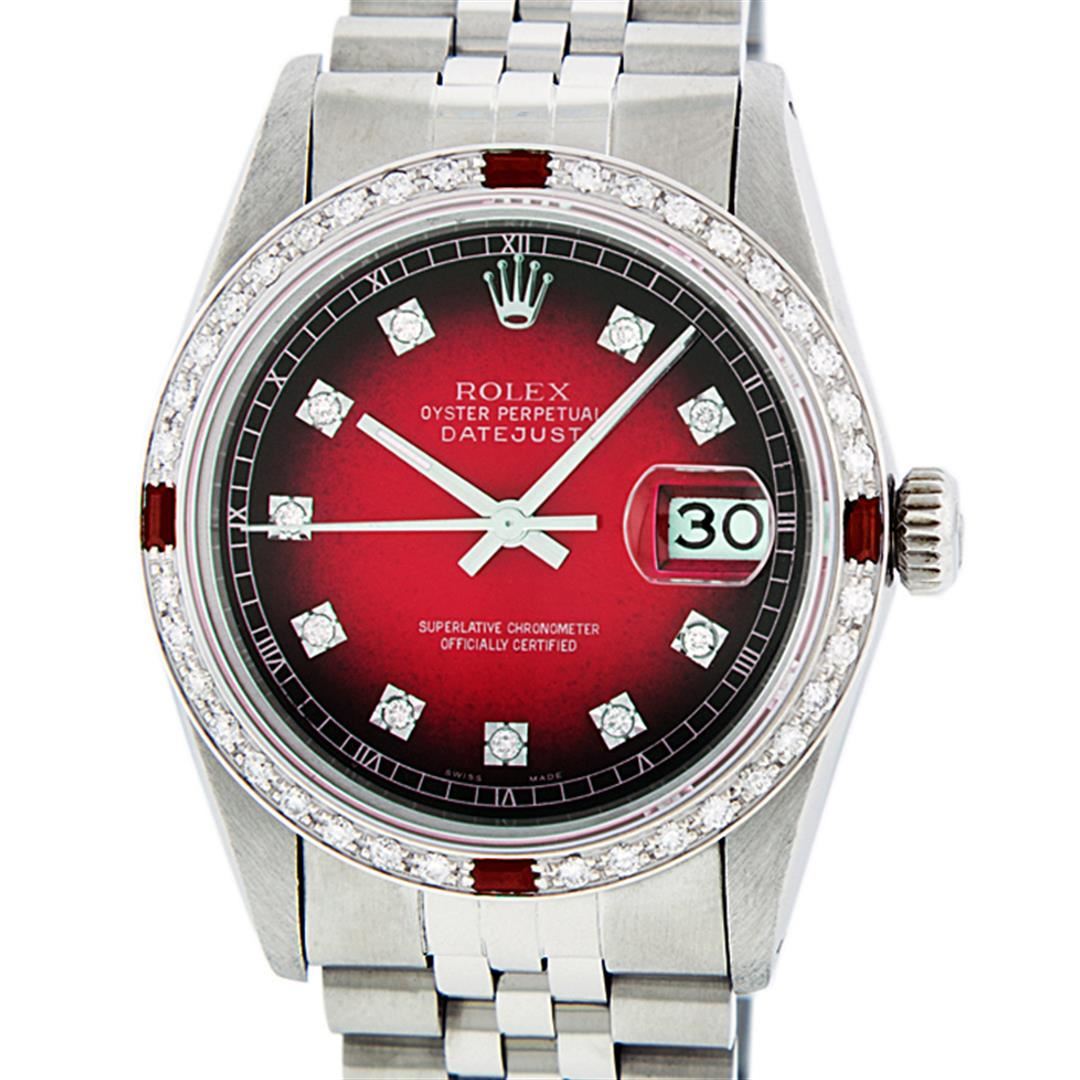 One Mens Stainless Steel Rolex Datejust Polished, Serviced & Electronically Tested, Stainless Steel Case: 36mm, Stainless Steel Crown, Custom Bezel: New 18K White Gold Ruby Beadset Diamond Bezel, Diamond + Gem Count: 36 Diamonds + 4 Rubies Total Weight 1.00 Carat, Clarity: SI-VS, Color: G to H. Custom Crystal: New Synthetic Sapphire Cyclops Lens. Custom Hands: New Luminescent Hands. Movement: Automatic Winding Movement. Custom Dial: Red Vignette With Diamond Hour Markers, 10 Diamonds in Dial, G To H In Color, Clarity: SI-VS. Date Window: 3 O'Clock Position Date Display, Quickset, Model: Datejust. Condition: G-6 Extra Fine. Bracelet: Stainless Steel Jubilee. Bright Polish & Satin Finish. 7.0 Inch Length, Adjustable. Standard Clasp, With Rolex Logo. This Watch Has Been Serviced Time Tested And Is In Excellent Condition It Is Free Of All Scratches And Dents