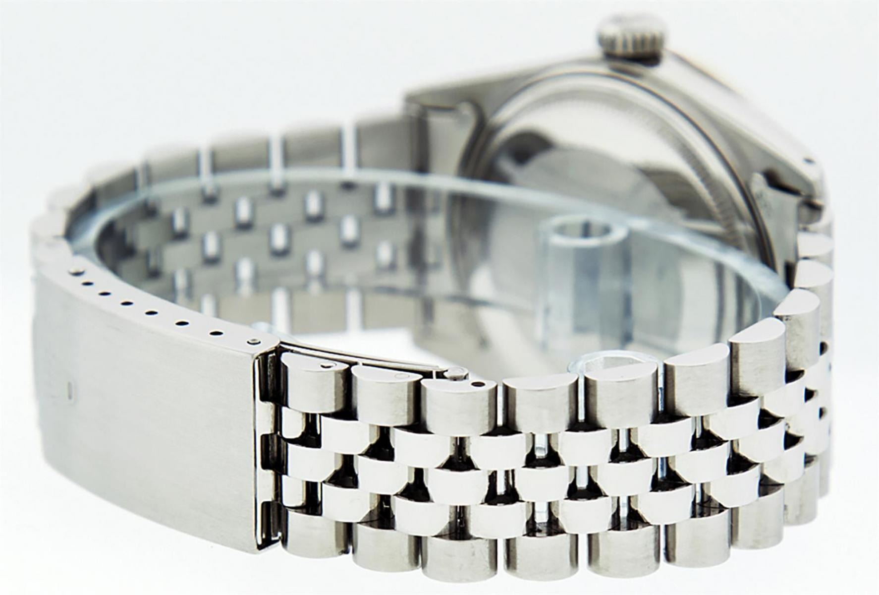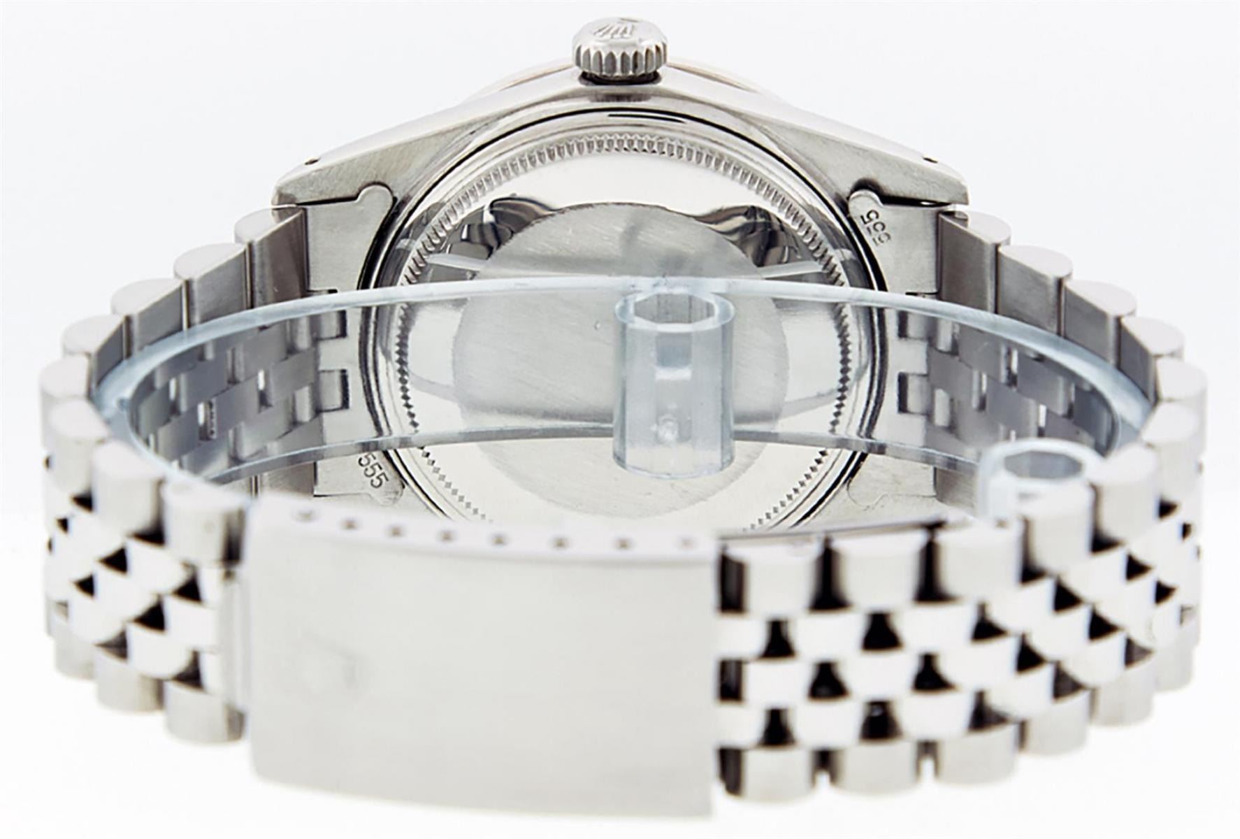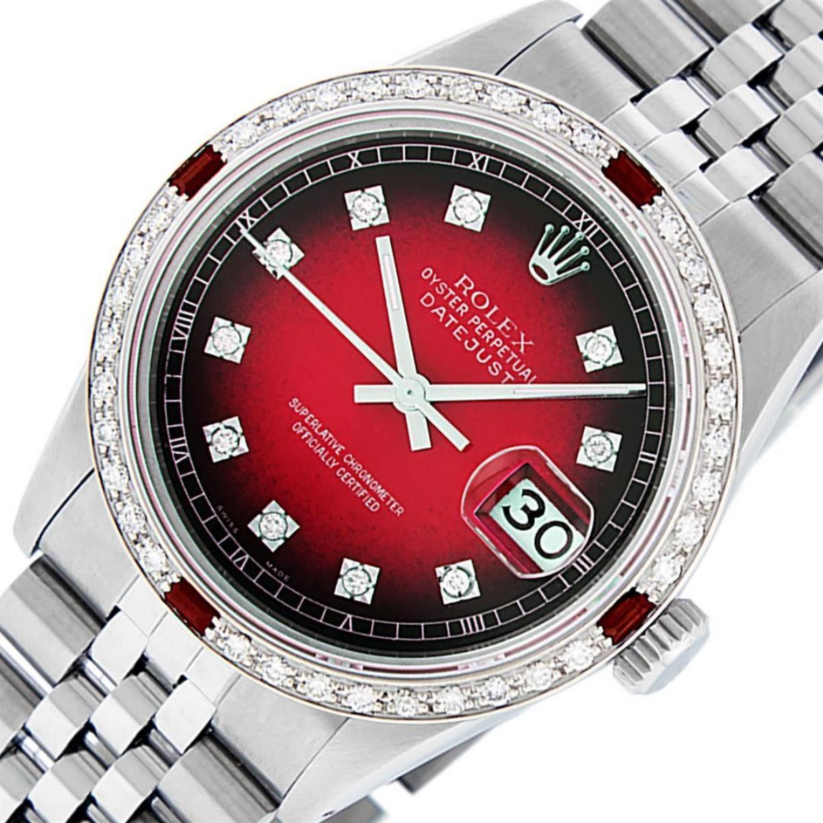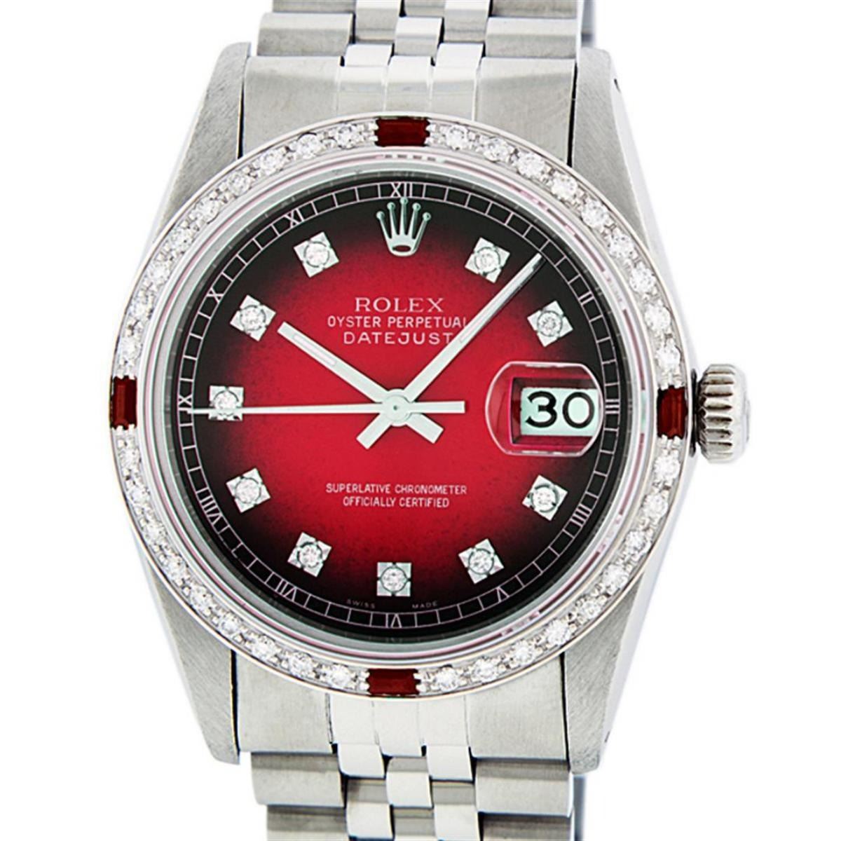 One Mens Stainless Steel Rolex Datejust Polished, Serviced & Electronically Tested, Stainless Steel Case: 36mm, Stainless Steel Crown, Custom Bezel: New 18K White Gold Ruby Beadset Diamond Bezel, Diamond + Gem Count: 36 Diamonds + 4 Rubies Total Weight 1.00 Carat, Clarity: SI-VS, Color: G to H. Custom Crystal: New Synthetic Sapphire Cyclops Lens. Custom Hands: New Luminescent Hands. Movement: Automatic Winding Movement. Custom Dial: Red Vignette With Diamond Hour Markers, 10 Diamonds in Dial, G To H In Color, Clarity: SI-VS. Date Window: 3 O'Clock Position Date Display, Quickset, Model: Datejust. Condition: G-6 Extra Fine. Bracelet: Stainless Steel Jubilee. Bright Polish & Satin Finish. 7.0 Inch Length, Adjustable. Standard Clasp, With Rolex Logo. This Watch Has Been Serviced Time Tested And Is In Excellent Condition It Is Free Of All Scratches And Dents.