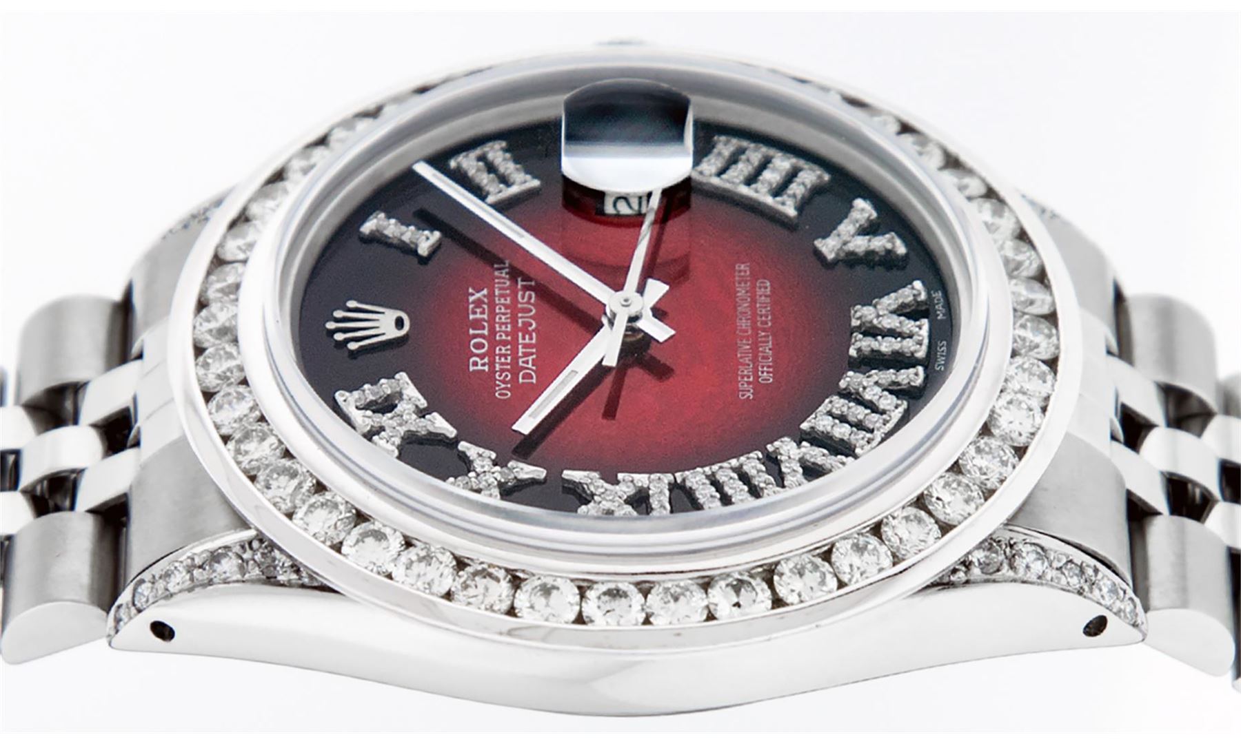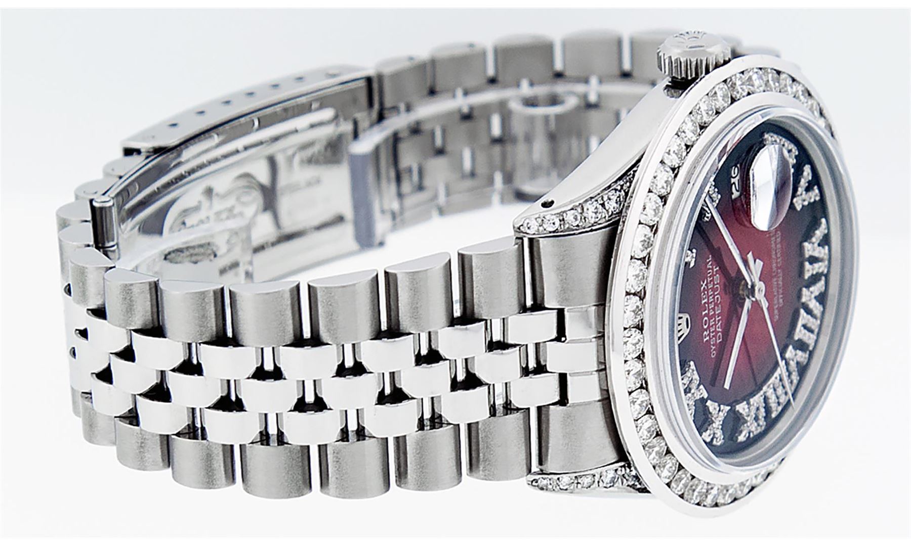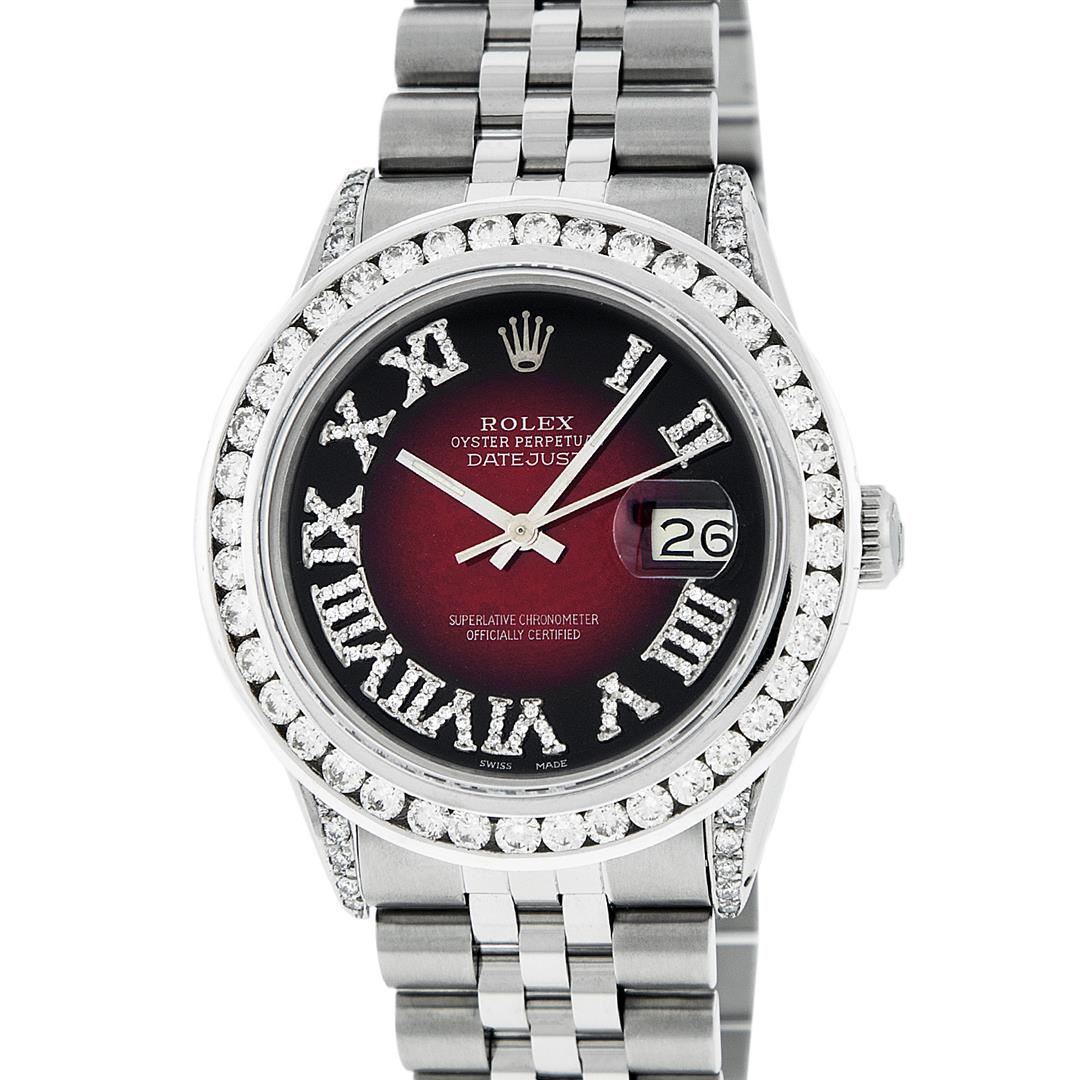 One Mens Stainless Steel Rolex Datejust Polished Bright with Satin Finish, Serviced & Electronically Tested, Stainless Steel Case: 36mm, Diamond Lugs: 24 Diamonds On Lugs, Color: G to H, Clarity: SI-VS. Stainless Steel Crown, New Custom Bezel: 18K White Gold 3.00 Ctw Diamond Bezel, Diamond Count: 40 Diamonds, Total Weight 3.0 Carat, Clarity: SI-VS, Color: G to H. Custom Crystal: New Scratch Resistant Synthetic Sapphire Cyclops Lens. Movement: Automatic Winding Movement Caliber 3035. Custom Dial: Red Vignette Roman Diamond Dial, Diamond Color: G To H In Color, Clarity: SI-VS. Date Window: 3 O'Clock Position Date Display, Quickset, Model: Quickset Datejust, Condition: G-6 Extra Fine. Bracelet: Stainless Steel Jubilee Band. Bright Polish & Satin Finish. 7.0 Inch Length, Adjustable. Standard Clasp, With Rolex Logo. This Watch Has Been Serviced Time Tested And Is In Excellent Condition It Is Free Of All Scratches And Dents. This Watch Also Comes With A Brand New Wooden Watch Winder.