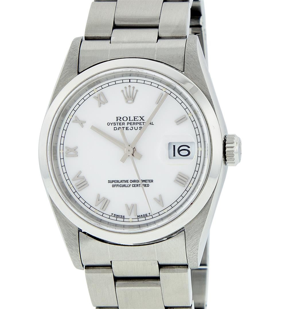 One Mens Rolex Pre Owned Quickset Stainless Steel Datejust Polished Bright with Satin Finish, Serviced & Electronically Tested, Rolex Stainless Steel Case: 36mm, Rolex Stainless Steel Crown, Rolex Bezel: Stainless Steel Smooth Bezel. Crystal: Sapphire With Magnified Date Window. Rolex Movement: Automatic Winding Movement Caliber 3135. Rolex Dial: White Roman With Square Track and Lumi Dot. Date Window: 3 O'Clock Position Date Display, Quickset, Model: Quickset Datejust. Condition: G-6 Extra Fine. Rolex Bracelet: Stainless Steel Oyster Band. Bright Polish & Satin Finish. 7.0 Inch Length, Adjustable. Standard Clasp, With Rolex Logo. This Pre Owned Watch Has Been Serviced Time Tested And Is In Excellent Condition It Is Free Of All Scratches And Dents.