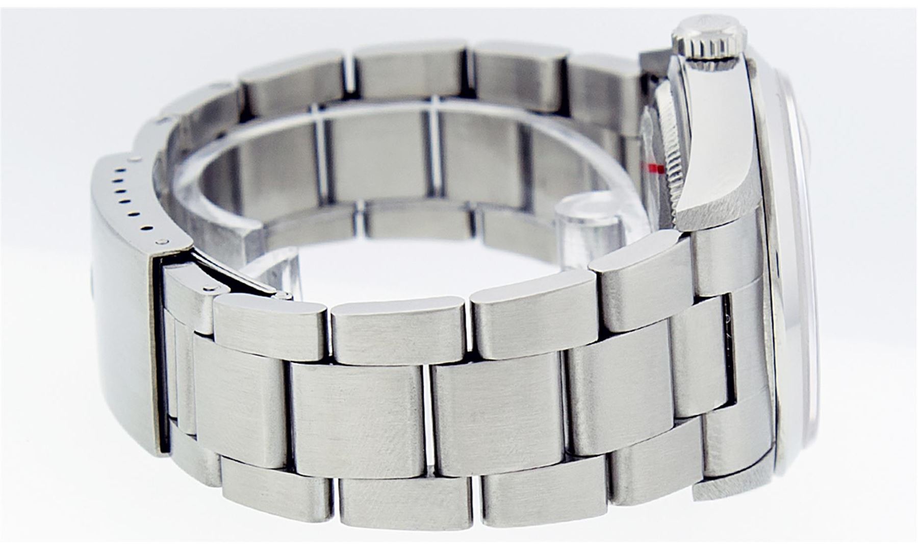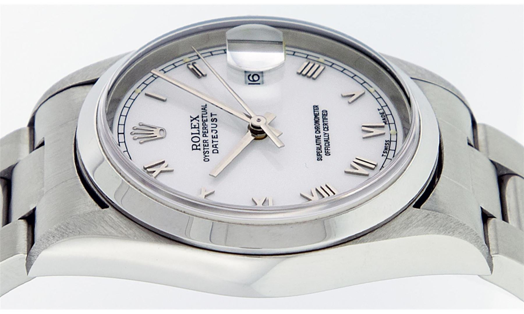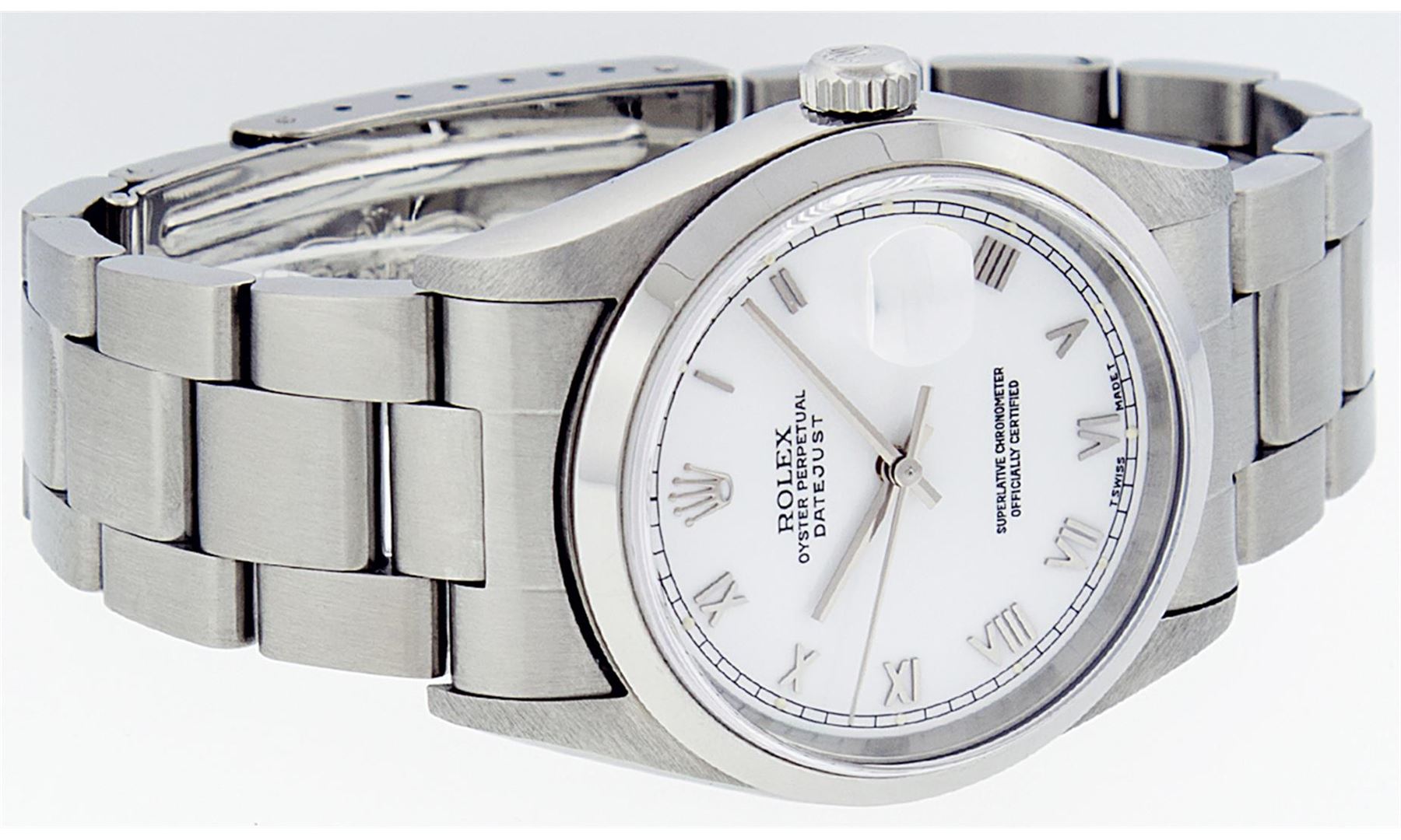 One Mens Rolex Pre Owned Quickset Stainless Steel Datejust Polished Bright with Satin Finish, Serviced & Electronically Tested, Rolex Stainless Steel Case: 36mm, Rolex Stainless Steel Crown, Rolex Bezel: Stainless Steel Smooth Bezel. Crystal: Sapphire With Magnified Date Window. Rolex Movement: Automatic Winding Movement Caliber 3135. Rolex Dial: White Roman With Square Track and Lumi Dot. Date Window: 3 O'Clock Position Date Display, Quickset, Model: Quickset Datejust. Condition: G-6 Extra Fine. Rolex Bracelet: Stainless Steel Oyster Band. Bright Polish & Satin Finish. 7.0 Inch Length, Adjustable. Standard Clasp, With Rolex Logo. This Pre Owned Watch Has Been Serviced Time Tested And Is In Excellent Condition It Is Free Of All Scratches And Dents.