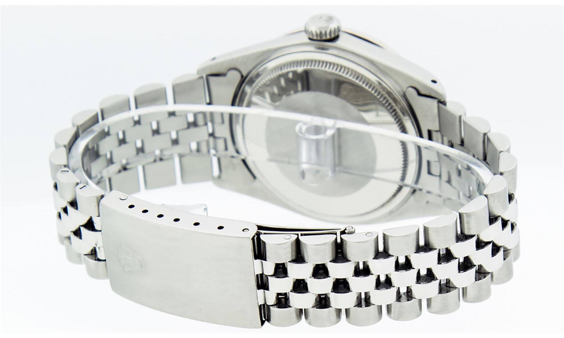 One Mens Stainless Steel Rolex Datejust Polished Bright with Satin Finish, This Watch Has Been Serviced & Electronically Tested, Stainless Steel Case: 36mm, Stainless Steel Crown, Custom Bezel: New 18K White Gold Ruby Beadset Diamond Bezel, Diamond + Gem Count: 36 Diamonds + 4 Rubies, Total Weight 1.00 Carat, Clarity: SI-VS, Color: G to H. Custom Crystal: New Scratch Resistant Synthetic Sapphire Cyclops Lens. Custom Hands: New Luminescent Hands. Movement: Automatic Winding Movement Caliber 3035. Custom Dial: Black With Roman Track. Date Window: 3 O'Clock Position Date Display, Quickset, Model: Datejust, Condition: G-6 Extra Fine. Bracelet: Stainless Steel Jubilee Band. Bracelet: 7.0 Inch Length, Adjustable. Standard Clasp, With Rolex Logo. This Watch Has Been Serviced Time Tested And Is In Excellent Condition It Is Free Of All Scratches And Dents.