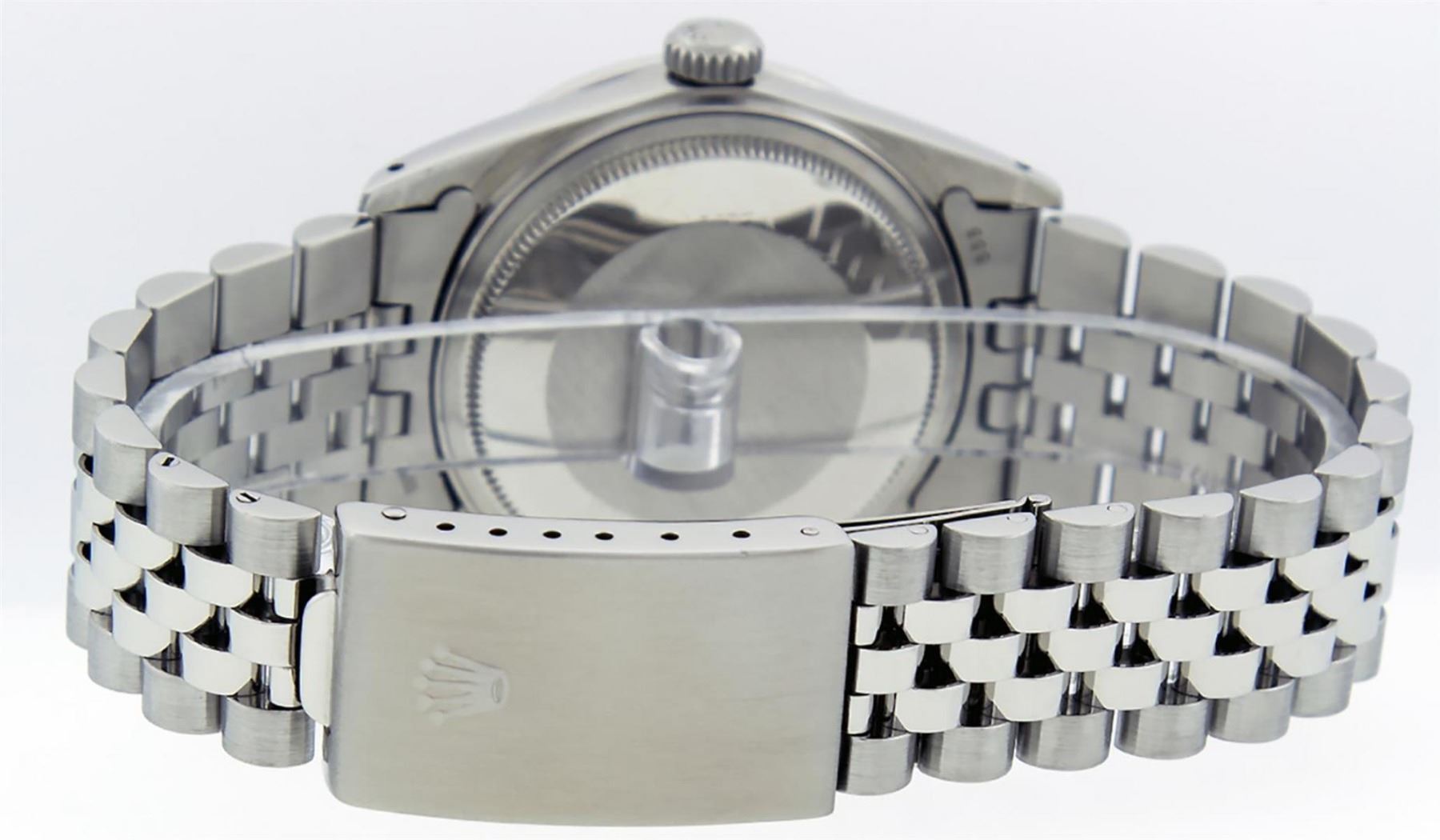 One Mens Stainless Steel Rolex Datejust Polished, Serviced & Electronically Tested, Stainless Steel Case: 36mm, Stainless Steel Crown, Custom Bezel: New 18K White Gold Beadset Diamond Bezel, Diamond Count: 44 Diamonds In Bezel, Total Weight 1.00 Carat, Clarity: SI-VS, Color: G to H. Custom Crystal: New Scratch Resistant Synthetic Sapphire Cyclops Lens. Custom Hands: New Luminescent Hands. Movement: Automatic Winding Movement Caliber 3035. Custom Dial: Silver Diamond Dial With Dash Track, Diamond Count: 10 Diamonds in Dial, G To H In Color, Clarity: SI-VS. Date Window: 3 O'Clock Position Date Display, Quickset, Model: Quickset Datejust. Condition: G-6 Extra Fine. Bracelet: Stainless Steel Jubilee Band. Bright Polish & Satin Finish. 7.0 Inch Length, Adjustable. Standard Clasp, With Rolex Logo. This Watch Has Been Serviced Time Tested And Is In Excellent Condition It Is Free Of All Scratches And Dents.