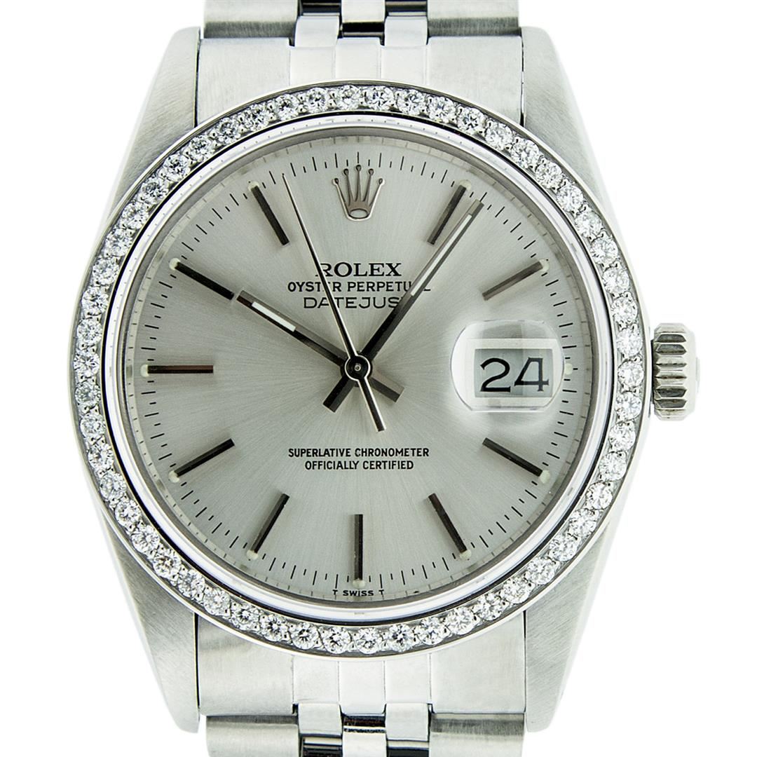 One Mens Rolex Stainless Steel Datejust Polished Bright with Satin Finish, This Watch Has Been Serviced & Electronically Tested, Stainless Steel Case: 36mm, Stainless Steel Crown, Custom Bezel: New Stainless Steel Beadset Diamond Bezel, Diamond Count: 54 Diamonds, Total Weight 1.00 Carat, Clarity: SI-VS, Color: G to H. Custom Crystal: New Synthetic Sapphire Cyclops Lens. Custom Hands: New Luminescent Hands. Movement: Automatic Winding Movement Caliber 3035. Custom Dial: Silver Index Dial With Lumi Dots & Dash Track. Date Window: 3 O'Clock Position Date Display, Quickset, Model: Datejust. Condition: G-6 Extra Fine. Bracelet: Stainless Steel Jubilee Band. Bright Polish & Satin Finish. 7.0 Inch Length, Adjustable. Standard Clasp, With Rolex Logo. This Watch Has Been Serviced Time Tested And Is In Excellent Condition It Is Free Of All Scratches And Dents.