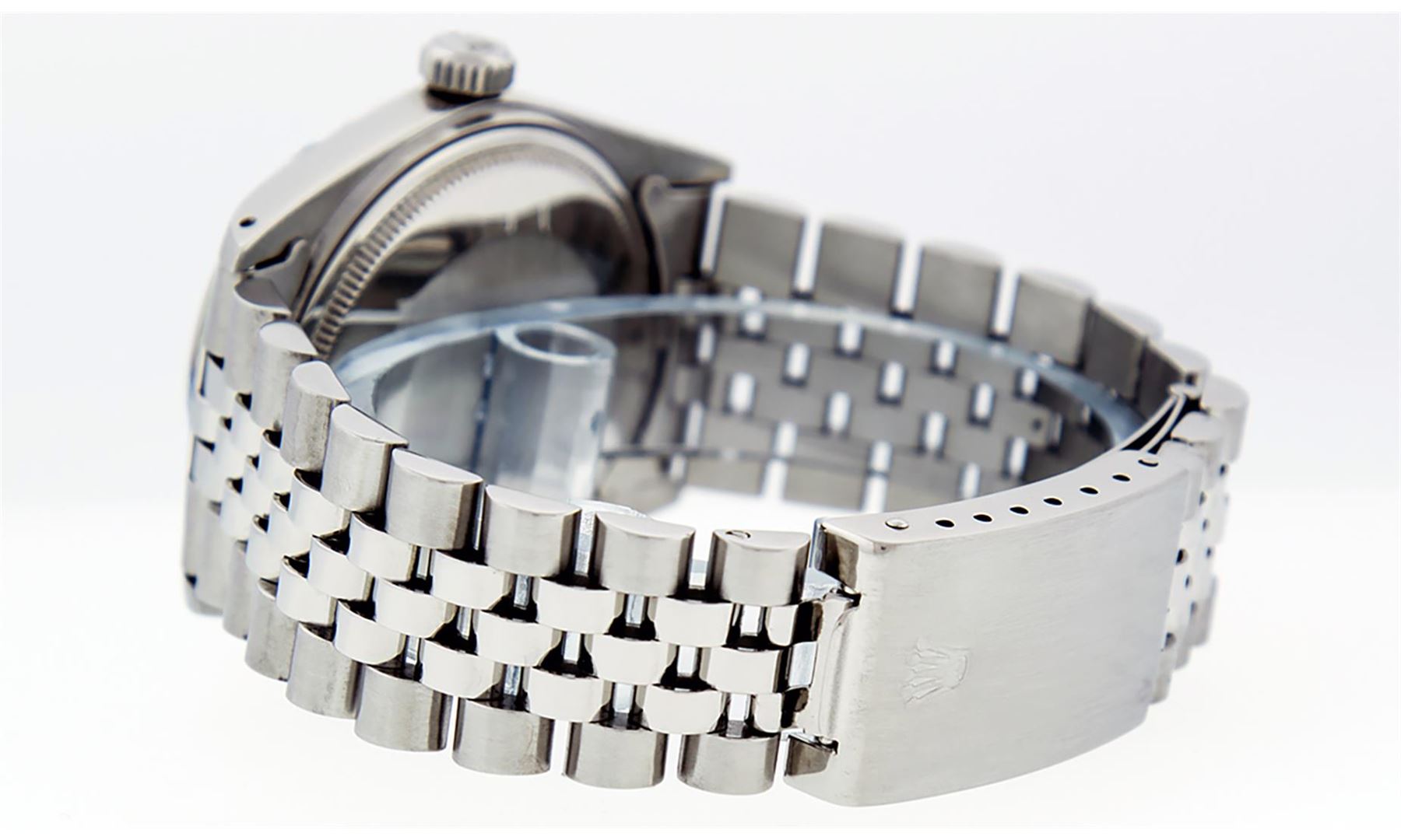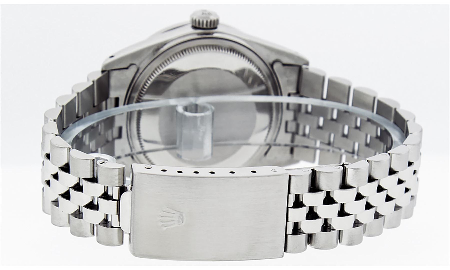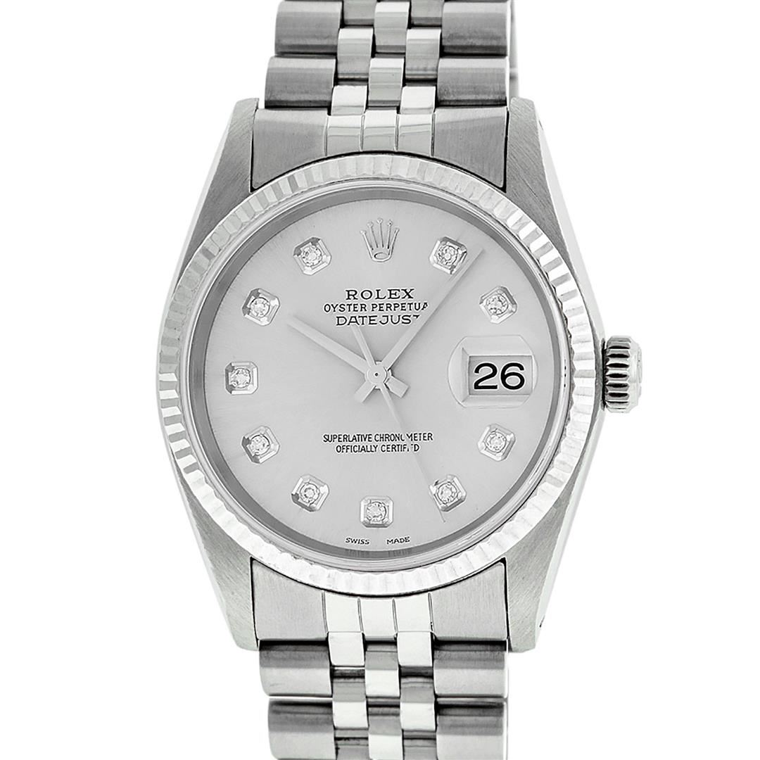 One Mens Rolex Datejust Polished Bright with Satin Finish, Serviced & Electronically Tested, Stainless Steel Case: 36mm, Stainless Steel Crown, Bezel: 14K White Gold Fluted Bezel. Custom Crystal: New Acrylic Cyclops Lens. Custom Hands: New Hands. Movement: Automatic Winding Movement. Custom Dial: Silver Diamond Dial, Diamond Count: 10 Diamonds in Dial, G To H In Color, Si-VS Clarity. Date Window: 3 O'Clock Position Date Display, Quickset, Model: Datejust, Condition: G-6 Extra Fine. Bracelet:Stainless Steel Jubilee Band. Bright Polish & Satin Finish. 7.0 Inch Length, Adjustable. Standard Clasp, With Rolex Logo. Watch Has Been Serviced And Polished It Is Free Of All Scratches And Dents.