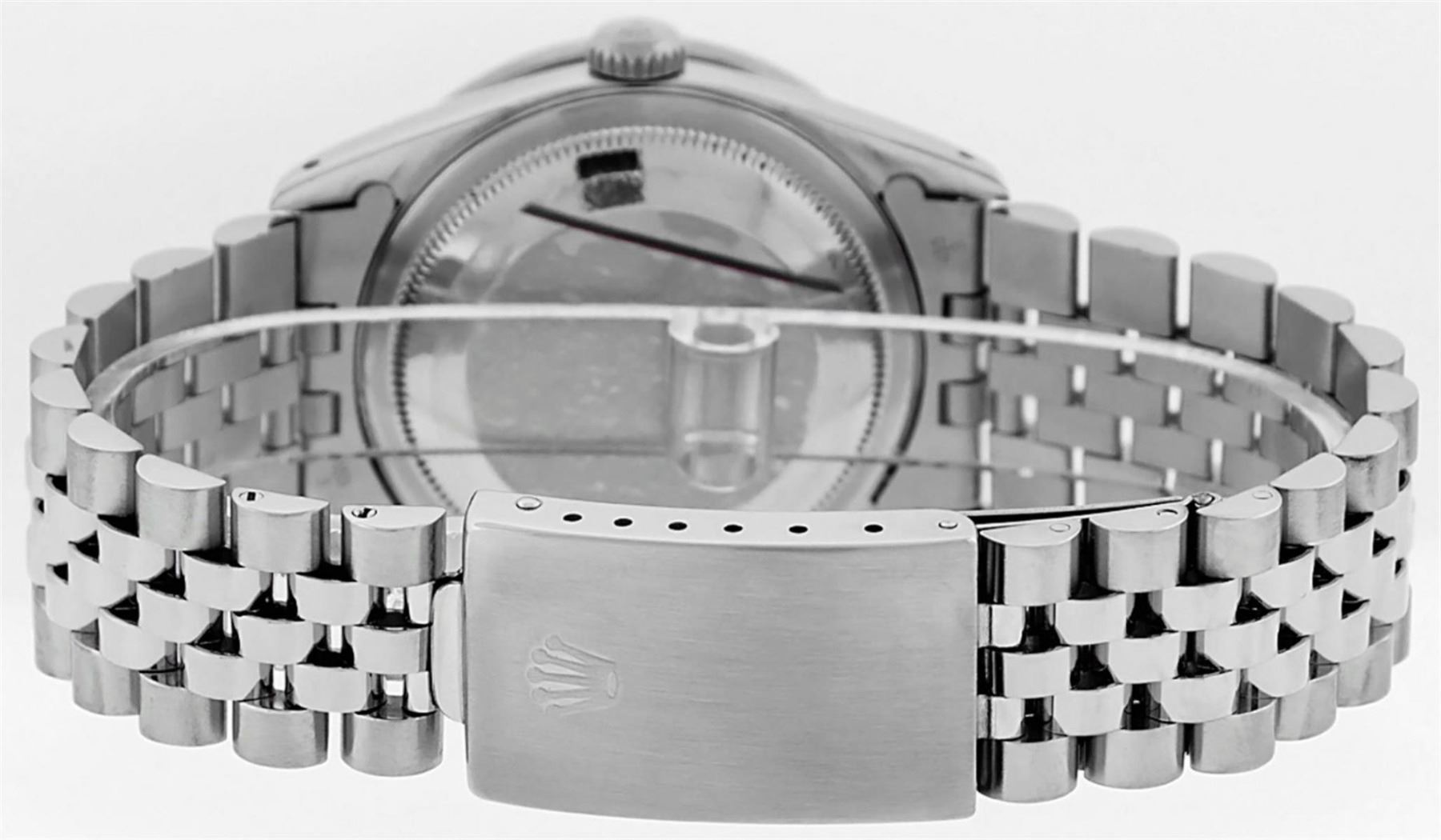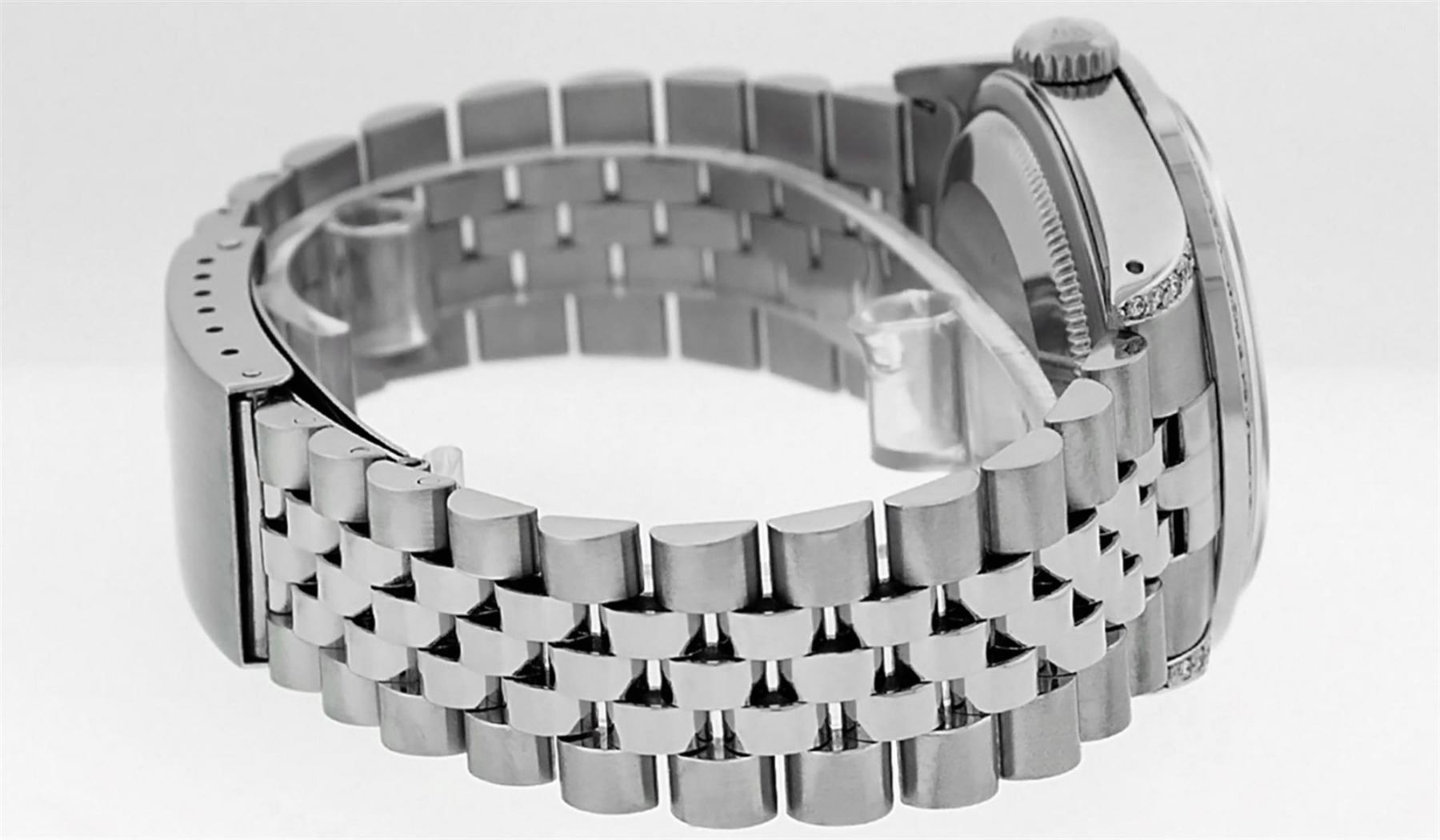 One Mens Rolex Datejust Polished Bright with Satin Finish, Serviced & Electronically Tested, Stainless Steel Case: 36mm, Custom Diamonds On Lugs: 28 Diamonds On Lugs, Color: G to H, Clarity: SI-VS. Stainless Steel Crown, Custom Bezel: 18K White Gold Pyramid Diamond Bezel, Diamond Count: 24 Diamonds On Bezel, Total Weight .75 Carat, Clarity: SI-VS, Color: G to H. Custom Crystal: New Scratch Resistant Synthetic Sapphire Cyclops Lens. Custom Hands: New Solid Hands. Movement: Automatic Winding Movement Caliber 3035. Custom Dial: Silver Single Cut Diamond Dial, Diamond Count: 10 Diamonds In Dial, Diamond Color: G To H In Color, Clarity: VS. Date Window: 3 O'Clock Position Date Display, Quickset, Model: Datejust Condition: G-6 Extra Fine. Bracelet: Stainless Steel Jubilee Band. Bright Polish & Satin Finish. 7.0 Inch Length, Adjustable. Standard Clasp, With Rolex Logo. This Watch Has Been Serviced And Polished And Its Free Of All Dents And Scratches.