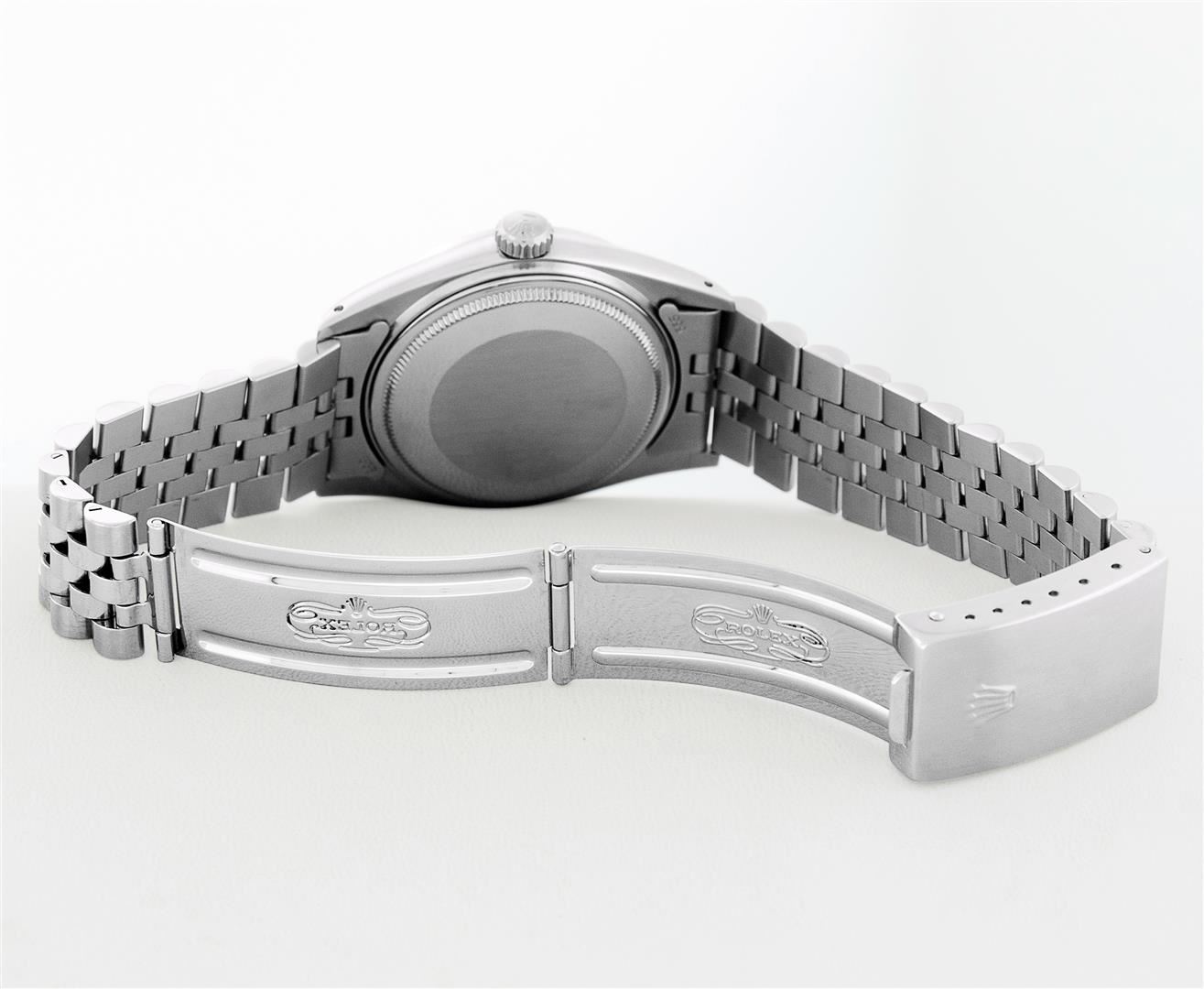 One Mens Pre Owned Stainless Steel Rolex Datejust Polished Bright with Satin Finish, This Watch Has Been Serviced & Electronically Tested, Rolex Stainless Steel Case: 36mm, Rolex Stainless Steel Crown, Custom Bezel: New 18K White Gold Ruby Beadset Diamond Bezel, Diamond + Gem Count: 36 Diamonds + 4 Rubies, Total Weight 1.00 Carat, Clarity: SI-VS, Color: G to H. Custom Crystal: New Sapphire With Magnified Date Window. Custom Hands: New Luminescent Hands. Rolex Movement: Automatic Winding Movement 3035. Rolex Dial: Silver Index With Dash Track & Lumi Dots. Date Window: 3 O'Clock Position Date Display, Quickset, Model: Datejust, Condition: G-6 Extra Fine. Rolex Bracelet: Stainless Steel Jubilee Band. Bracelet: 7.0 Inch Length, Adjustable. Standard Clasp, With Rolex Logo. This Watch Has Been Serviced Time Tested And Is In Excellent Condition It Is Free Of All Scratches And Dents.