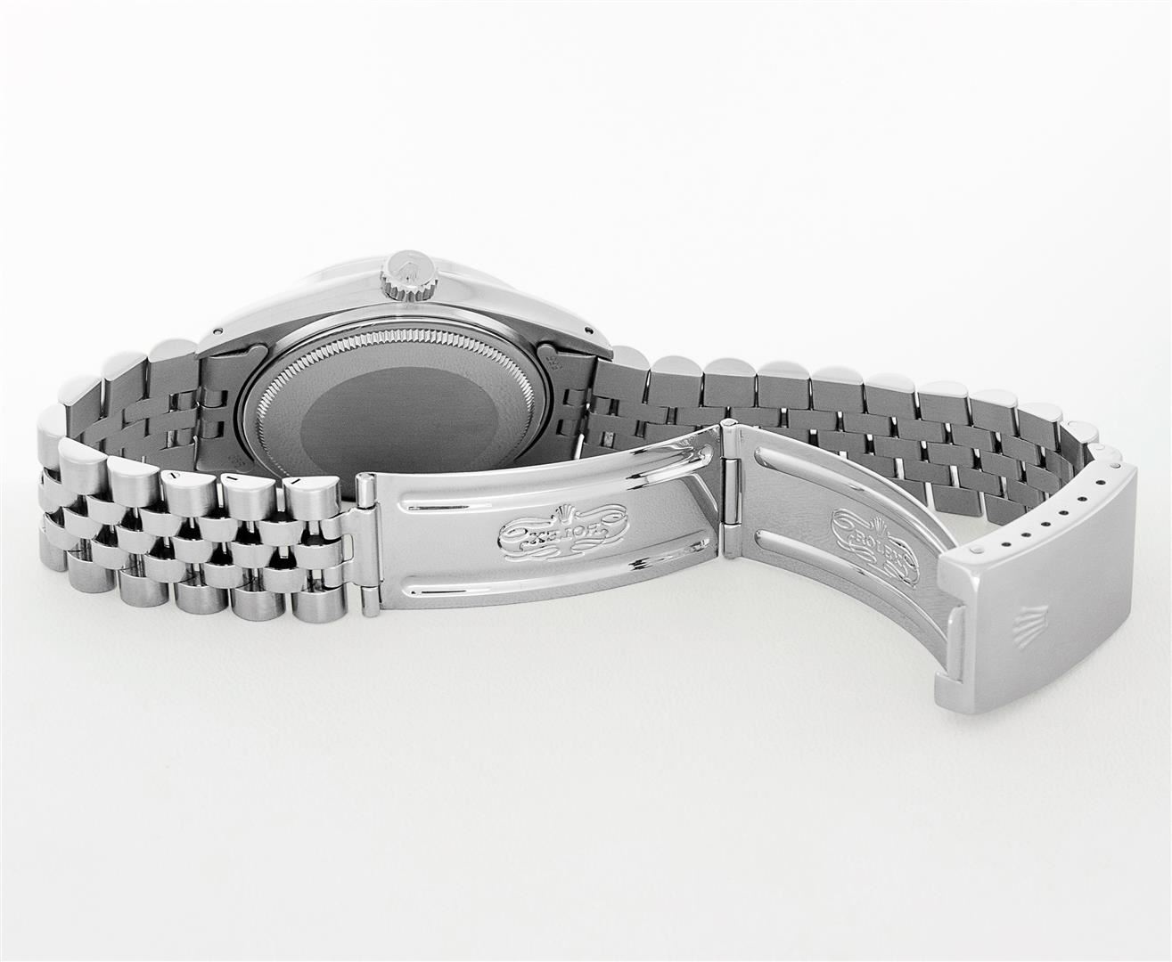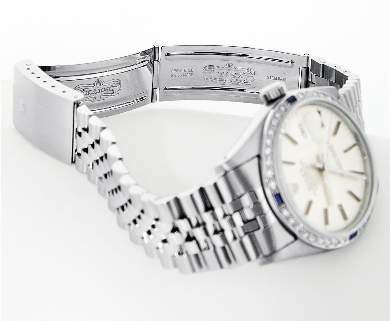 One Mens Pre Owned Stainless Steel Rolex Datejust Polished Bright with Satin Finish, This Watch Has Been Serviced & Electronically Tested, Rolex Stainless Steel Case: 36mm, Rolex Stainless Steel Crown, Custom Bezel: New 18K White Gold Sapphire Beadset Diamond Bezel, Diamond + Gem Count: 36 Diamonds + 4 Sapphires, Total Weight 1.00 Carat, Clarity: SI-VS, Color: G to H. Custom Crystal: New Sapphire With Magnified Date Window. Custom Hands: New Luminescent Hands. Rolex Movement: Automatic Winding Movement 3035. Rolex Dial: Silver Index With Dash Track & Lumi Dots. Date Window: 3 O'Clock Position Date Display, Quickset, Model: Datejust, Condition: G-6 Extra Fine. Rolex Bracelet: Stainless Steel Jubilee Band. Bracelet: 7.0 Inch Length, Adjustable. Standard Clasp, With Rolex Logo. This Watch Has Been Serviced Time Tested And Is In Excellent Condition It Is Free Of All Scratches And Dents.