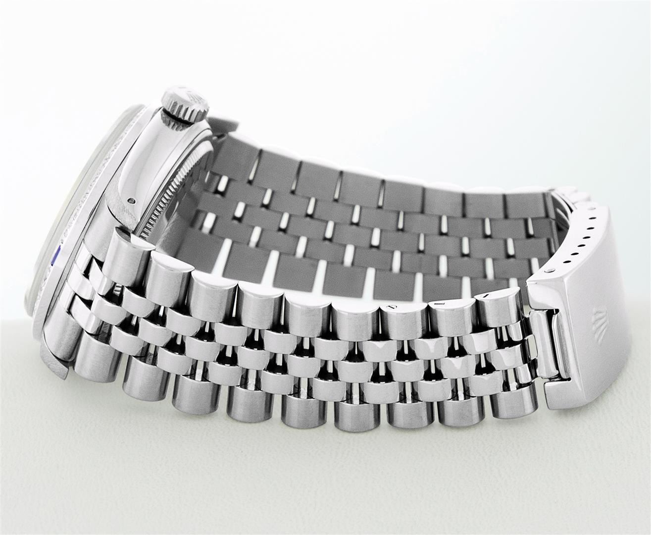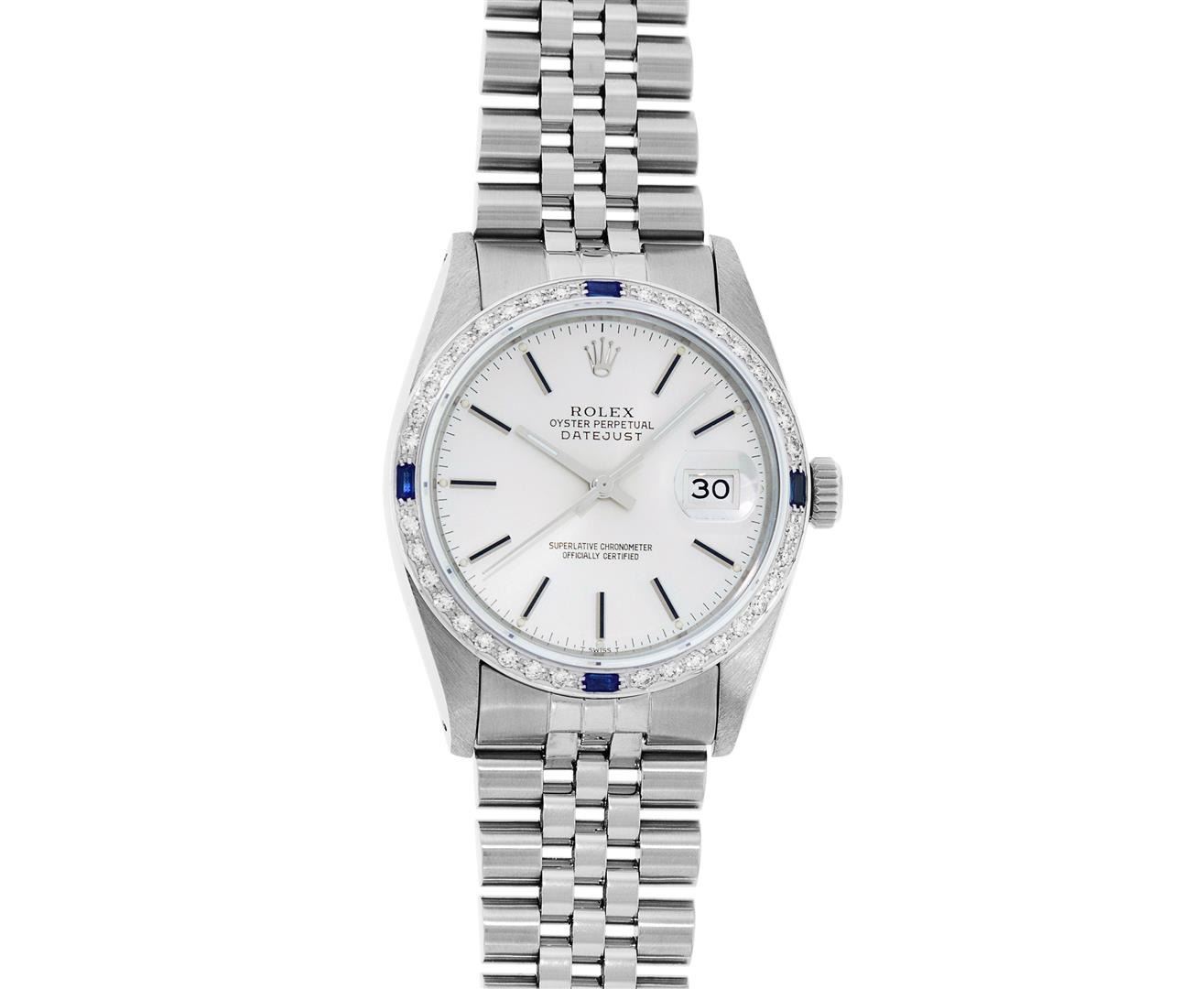 One Mens Pre Owned Stainless Steel Rolex Datejust Polished Bright with Satin Finish, This Watch Has Been Serviced & Electronically Tested, Rolex Stainless Steel Case: 36mm, Rolex Stainless Steel Crown, Custom Bezel: New 18K White Gold Sapphire Beadset Diamond Bezel, Diamond + Gem Count: 36 Diamonds + 4 Sapphires, Total Weight 1.00 Carat, Clarity: SI-VS, Color: G to H. Custom Crystal: New Sapphire With Magnified Date Window. Custom Hands: New Luminescent Hands. Rolex Movement: Automatic Winding Movement 3035. Rolex Dial: Silver Index With Dash Track & Lumi Dots. Date Window: 3 O'Clock Position Date Display, Quickset, Model: Datejust, Condition: G-6 Extra Fine. Rolex Bracelet: Stainless Steel Jubilee Band. Bracelet: 7.0 Inch Length, Adjustable. Standard Clasp, With Rolex Logo. This Watch Has Been Serviced Time Tested And Is In Excellent Condition It Is Free Of All Scratches And Dents.