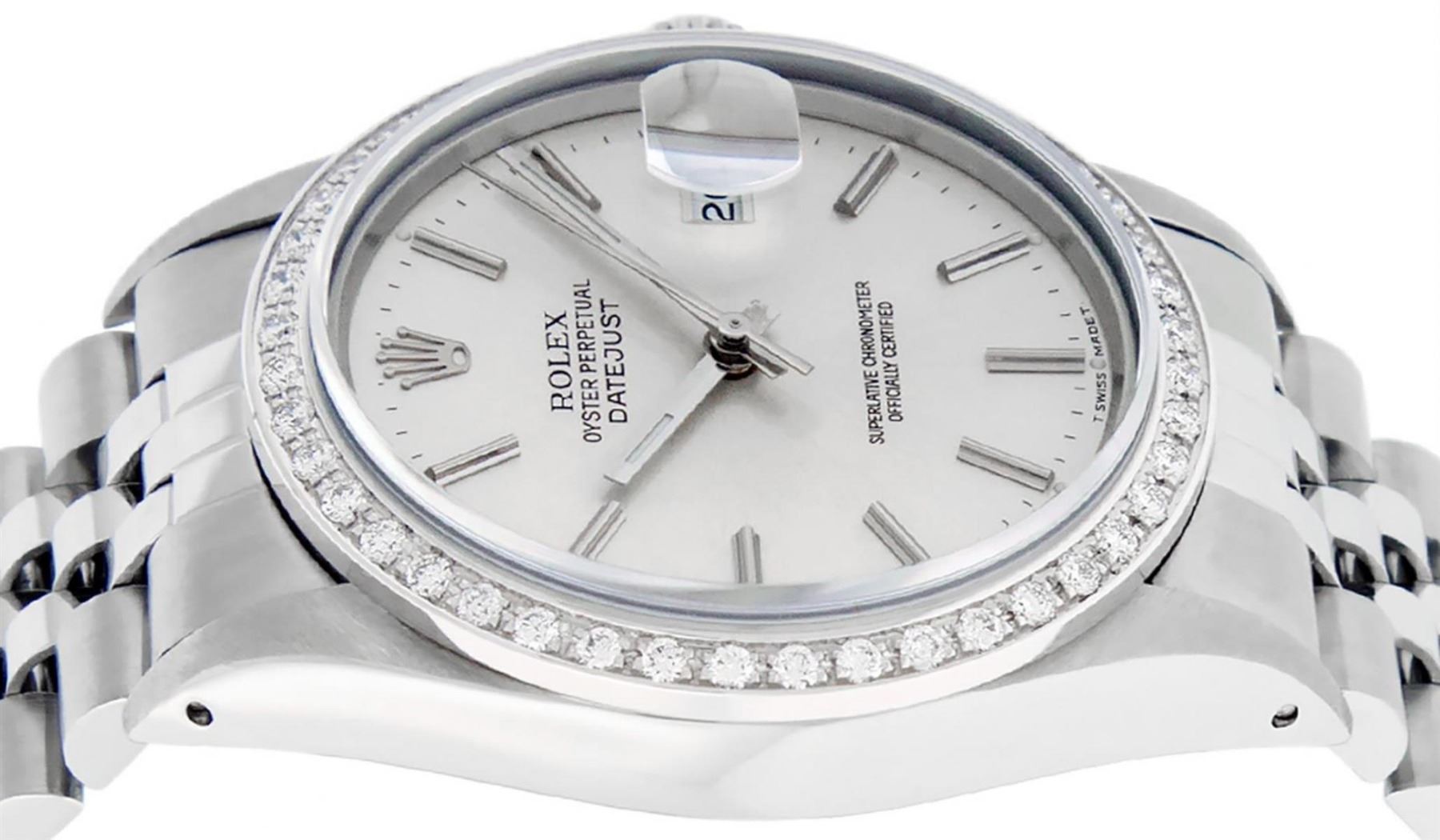 One Mens Stainless Steel Rolex Datejust Polished Bright with Satin Finish, This Watch Has Been Serviced & Electronically Tested, Stainless Steel Case: 36mm, Stainless Steel Crown, Custom Bezel: New 18K White Gold Beadset Diamond Bezel, Diamond Count: 44 Diamonds, Total Weight 1.00 Carat, Clarity: SI-VS, Color: G to H. Custom Crystal: New Scratch Resistant Synthetic Sapphire Cyclops Lens. Custom Hands: New Luminescent Hands. Movement: Automatic Winding Movement Caliber 3035. Dial: Silver Index With Dash Track & Lumi Dot. Date Window: 3 O'Clock Position Date Display, Quickset, Model: Datejust, Condition: G-6 Extra Fine. Bracelet: Stainless Steel Jubilee. Bracelet: 7.0 Inch Length, Adjustable. Standard Clasp, With Rolex Logo. This Watch Has Been Serviced Time Tested And Is In Excellent Condition It Is Free Of All Scratches And Dents.