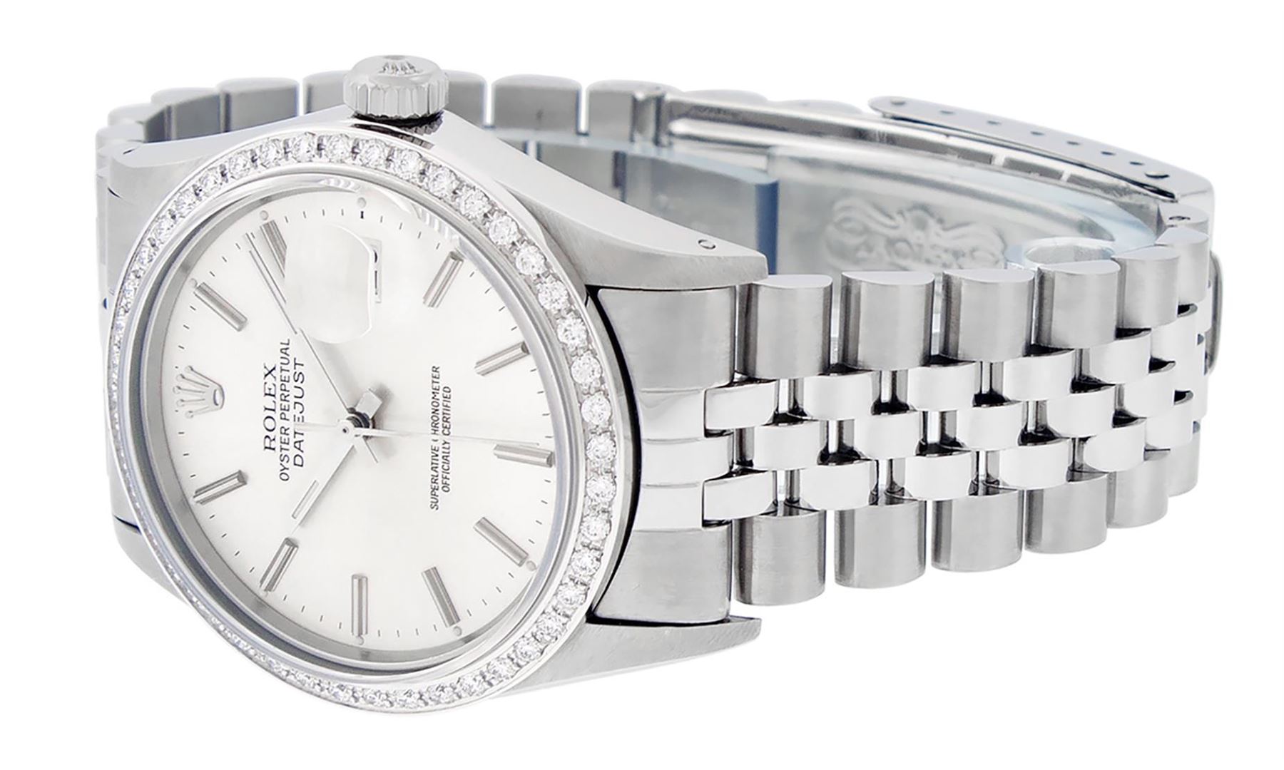 One Mens Stainless Steel Rolex Datejust Polished Bright with Satin Finish, This Watch Has Been Serviced & Electronically Tested, Stainless Steel Case: 36mm, Stainless Steel Crown, Custom Bezel: New 18K White Gold Beadset Diamond Bezel, Diamond Count: 44 Diamonds, Total Weight 1.00 Carat, Clarity: SI-VS, Color: G to H. Custom Crystal: New Scratch Resistant Synthetic Sapphire Cyclops Lens. Custom Hands: New Luminescent Hands. Movement: Automatic Winding Movement. Dial: Silver Index With Dash Track & Lumi Dot. Date Window: 3 O'Clock Position Date Display, Quickset, Model: Datejust, Condition: G-6 Extra Fine. Bracelet: Stainless Steel Jubilee. Bracelet: 7.0 Inch Length, Adjustable. Standard Clasp, With Rolex Logo. This Watch Has Been Serviced Time Tested And Is In Excellent Condition It Is Free Of All Scratches And Dents.