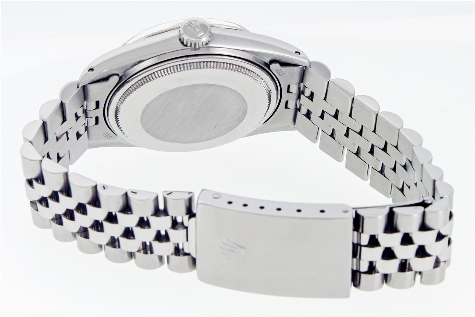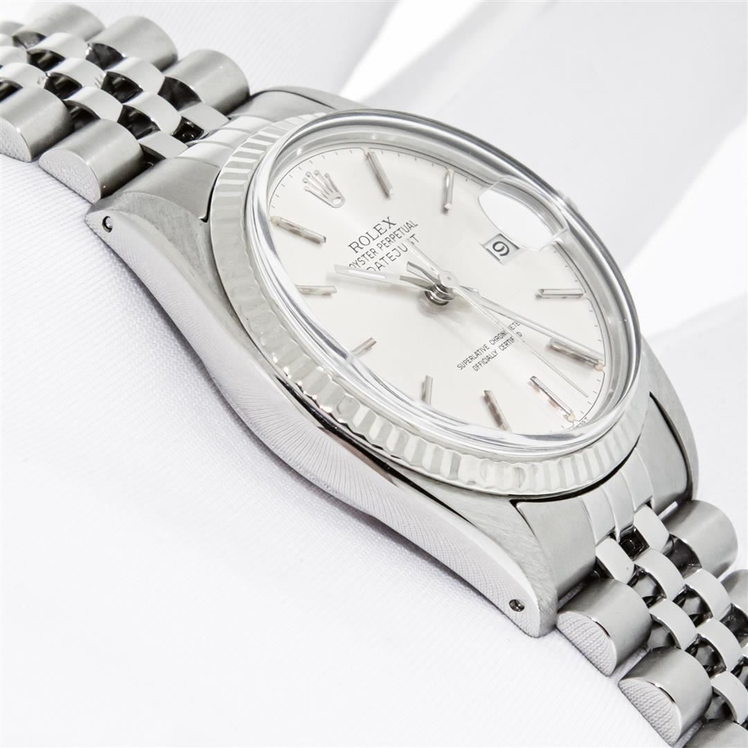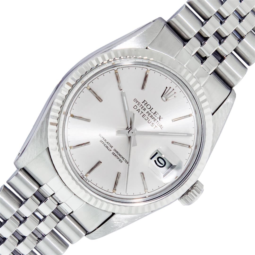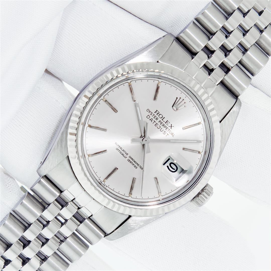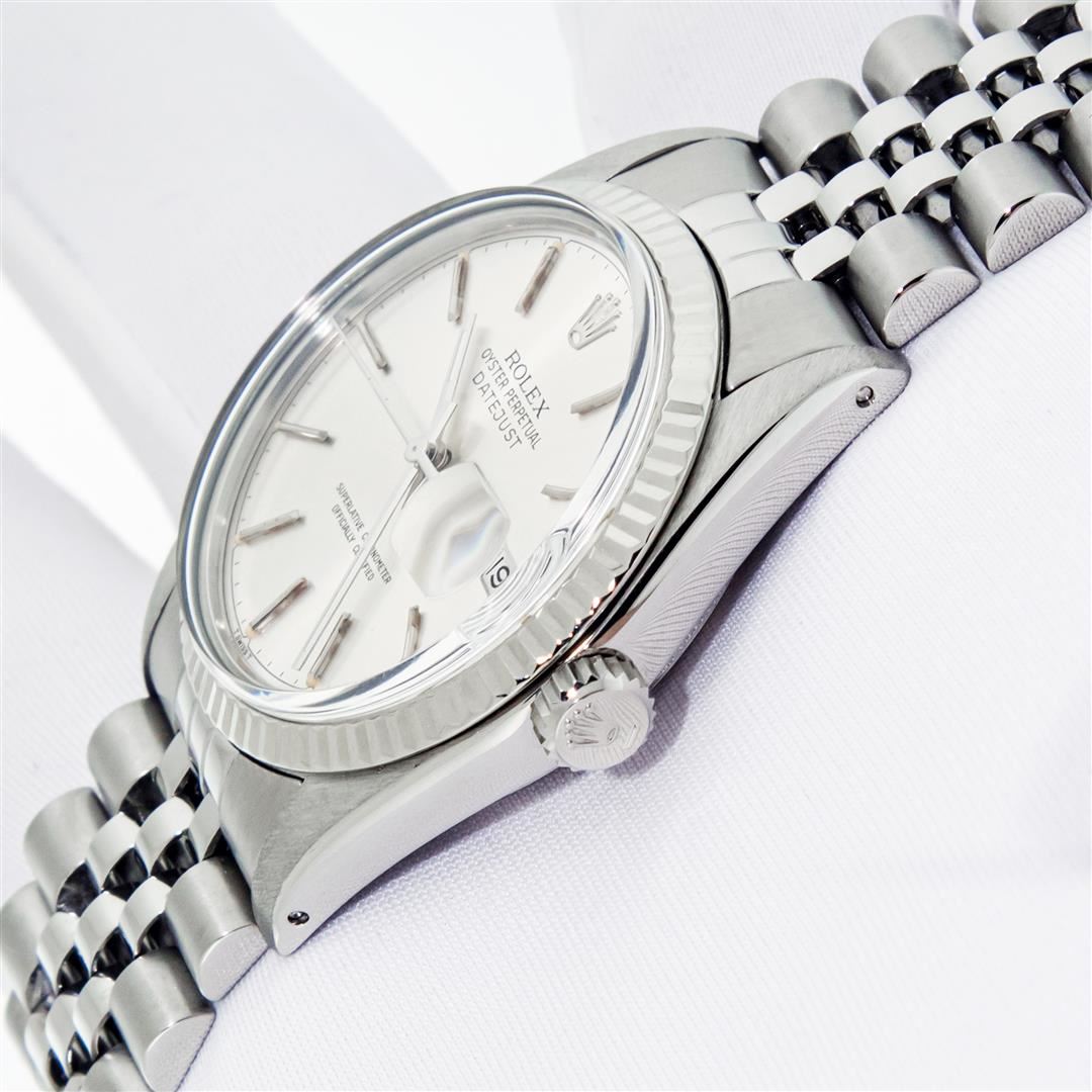 One Mens Pre Owned Rolex Datejust Polished Bright with Satin Finish, This Watch Has Been Serviced & Electronically Tested, Rolex Stainless Steel Case: 36mm, Rolex Stainless Steel Crown, Bezel: 14K White Gold Fluted Bezel. Custom Crystal: New Plastic With Date Window. Custom Hands: New Luminescent Hands. Rolex Movement: Automatic Winding Movement. Rolex Dial: Silver Index Dial With Dash Track. Date Window: 3 O'Clock Position Date Display, Quickset, Model: Datejust, Condition: G-6 Extra Fine. Rolex Bracelet: Stainless Steel Jubilee Band. Bracelet: 7.0 Inch Length, Adjustable. Standard Clasp, With Rolex Logo. This Watch Has Been Serviced Time Tested And Is In Excellent Condition It Is Free Of All Scratches And Dents.