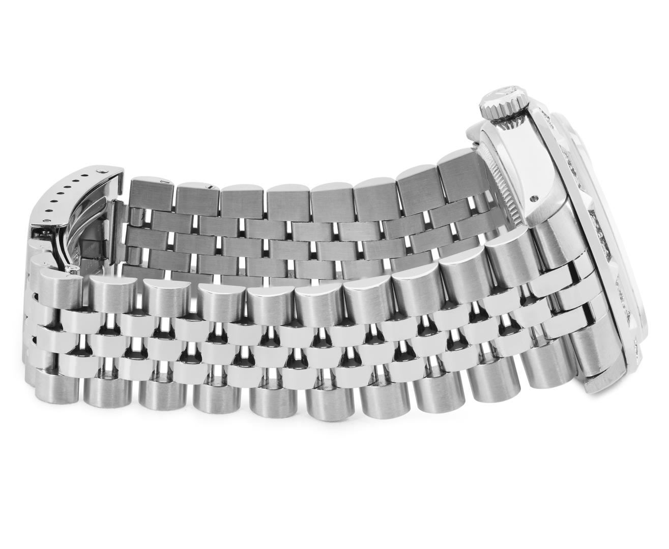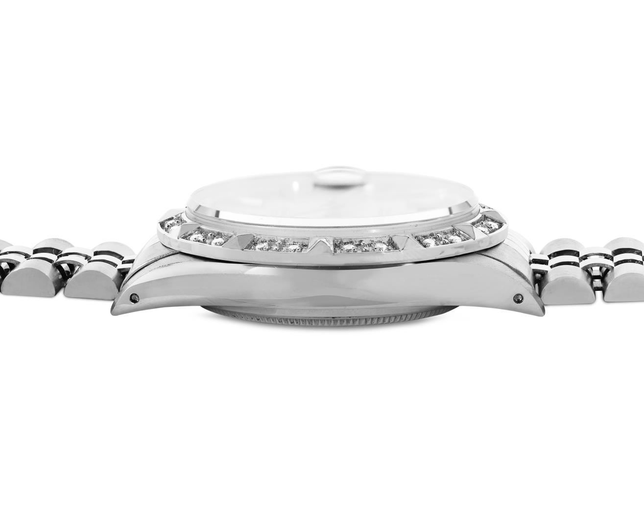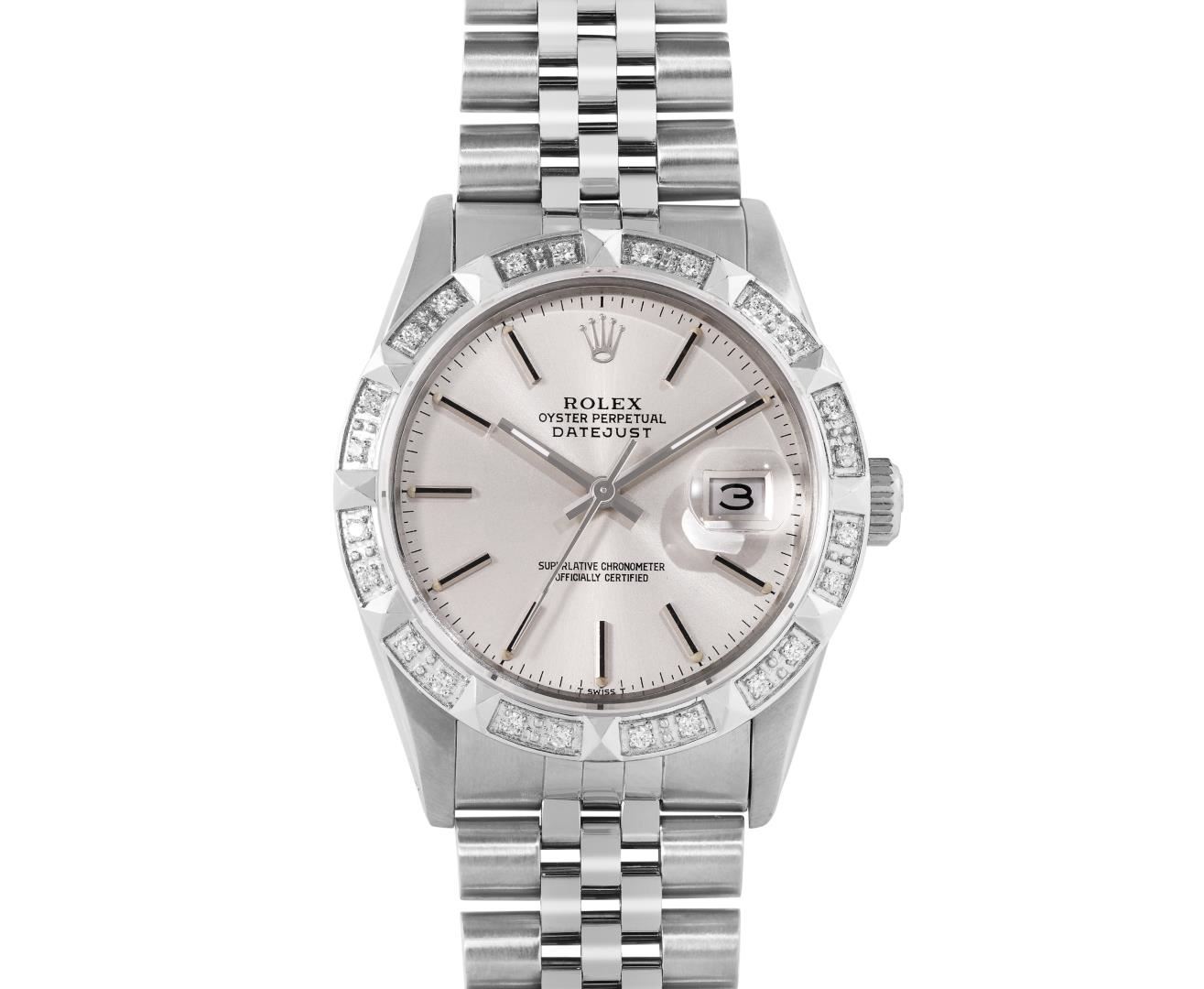 One Mens Pre Owned Rolex Stainless Steel Datejust Polished Bright with Satin Finish, Serviced And Electronically Tested, Rolex Stainless Steel Case: 36mm, Rolex Stainless Steel Crown, Custom Bezel: New 18K White Gold Pyramid Bezel, Diamond Count: 24 Diamond on Bezel. Custom Crystal: New Sapphire With Magnified Date Window. Rolex Movement: Automatic Winding Movement Caliber 3035. Rolex Dial: Silver Index Dial With Open Track and Lumi Dots. Custom Hands: New Lumi Hands. Date Window: 3 O'Clock Position Date Display, Quickset, Model: Quickset Datejust. Condition: G-6 Extra Fine. Rolex Bracelet: Stainless Steel Jubilee Band. Bright Polish And Satin Finish. 7.0 Inch Length, Adjustable. Fold Clasp, With Rolex Logo. This Watch Has Been Serviced Time Tested And Is In Excellent Condition It Is Free Of All Scratches And Dents. This Watch Comes With A Rolex Box.