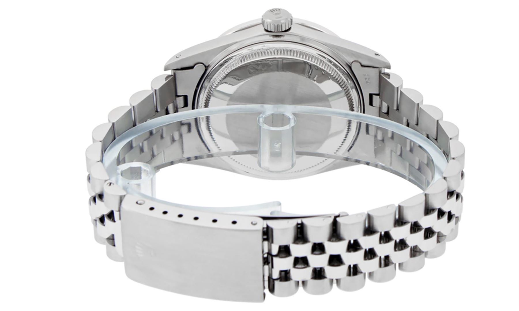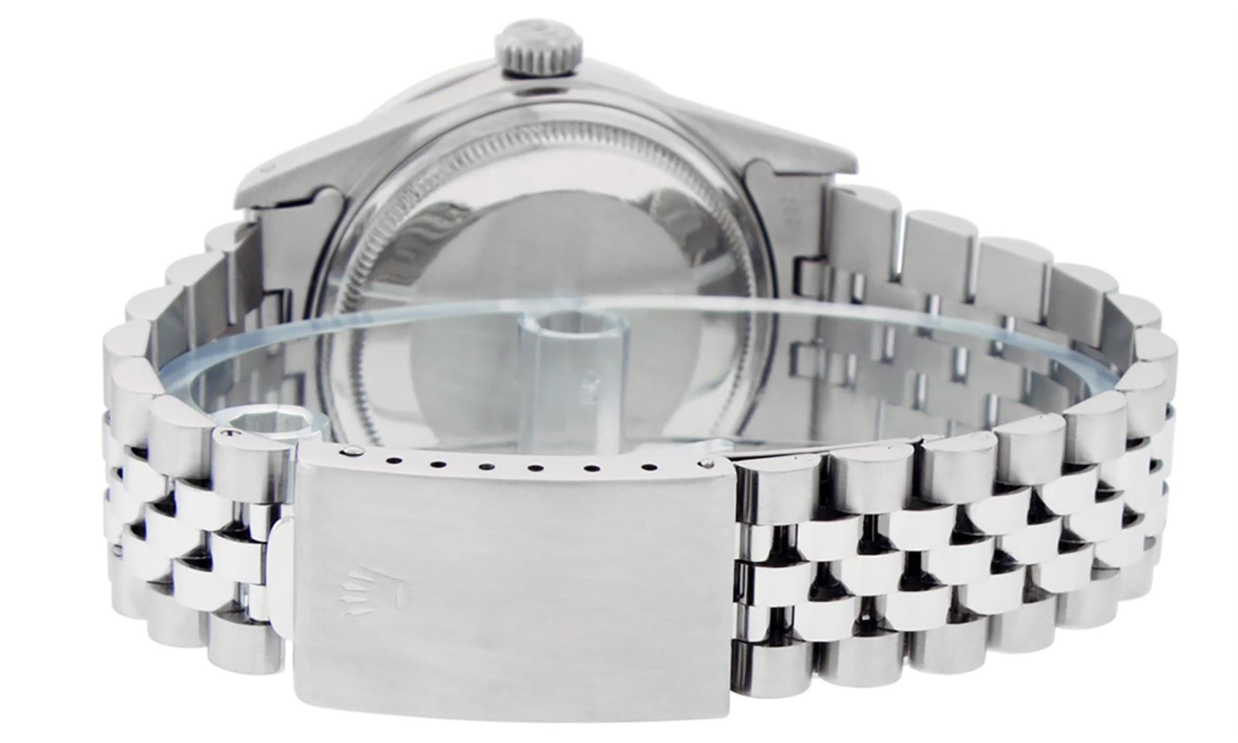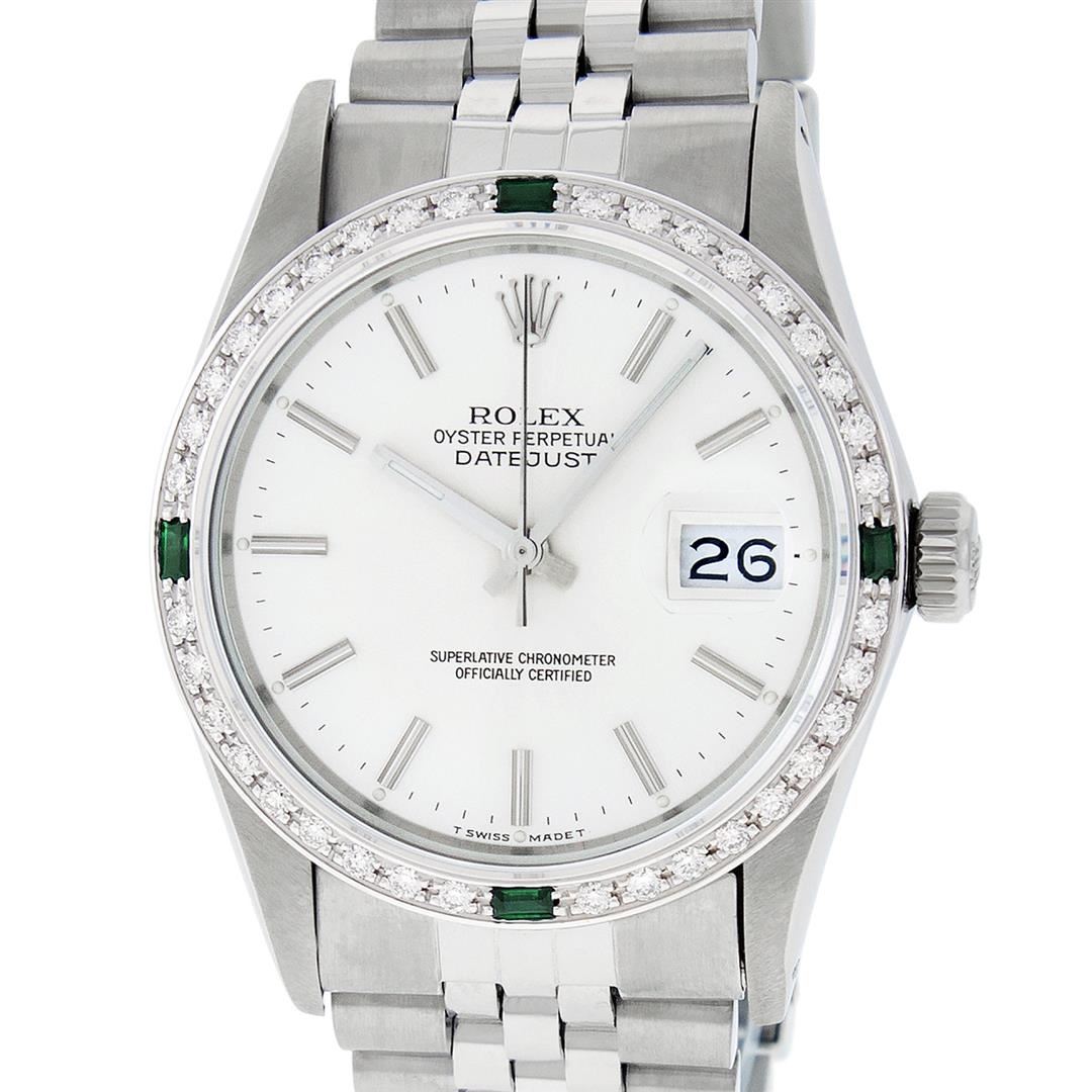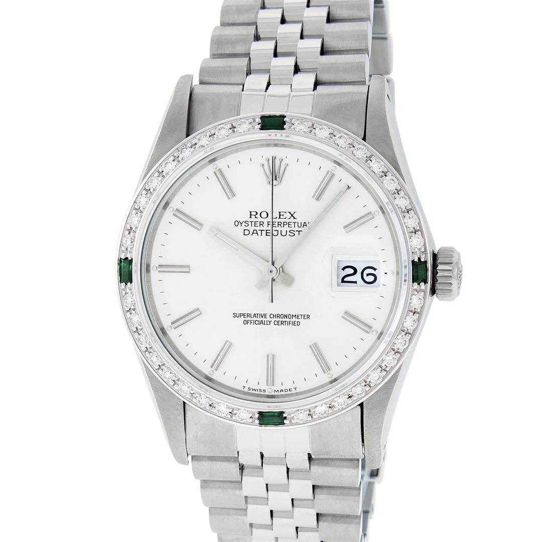 One Mens Stainless Steel Rolex Datejust Polished Bright with Satin Finish, This Watch Has Been Serviced & Electronically Tested, Stainless Steel Case: 36mm, Stainless Steel Crown, Custom Bezel: New 18K White Gold Synthetic Emerald Beadset Diamond Bezel, Diamond + Gem Count: 36 Diamonds + 4 Synthetic Emeralds, Total Weight 1.00 Carat, Clarity: SI-VS, Color: G to H. Custom Crystal: New Synthetic Sapphire Cyclops Lens. Custom Hands: New Luminescent Hands. Movement: Automatic Winding Movement Caliber 3035. Dial: Silver Index With Dash Track & Lumi Dots. Date Window: 3 O'Clock Position Date Display, Quickset, Model: Datejust, Condition: G-6 Extra Fine. Bracelet: Stainless Steel Jubilee. Bracelet: 7.0 Inch Length, Adjustable. Standard Clasp, With Rolex Logo. This Watch Has Been Serviced Time Tested And Is In Excellent Condition It Is Free Of All Scratches And Dents.